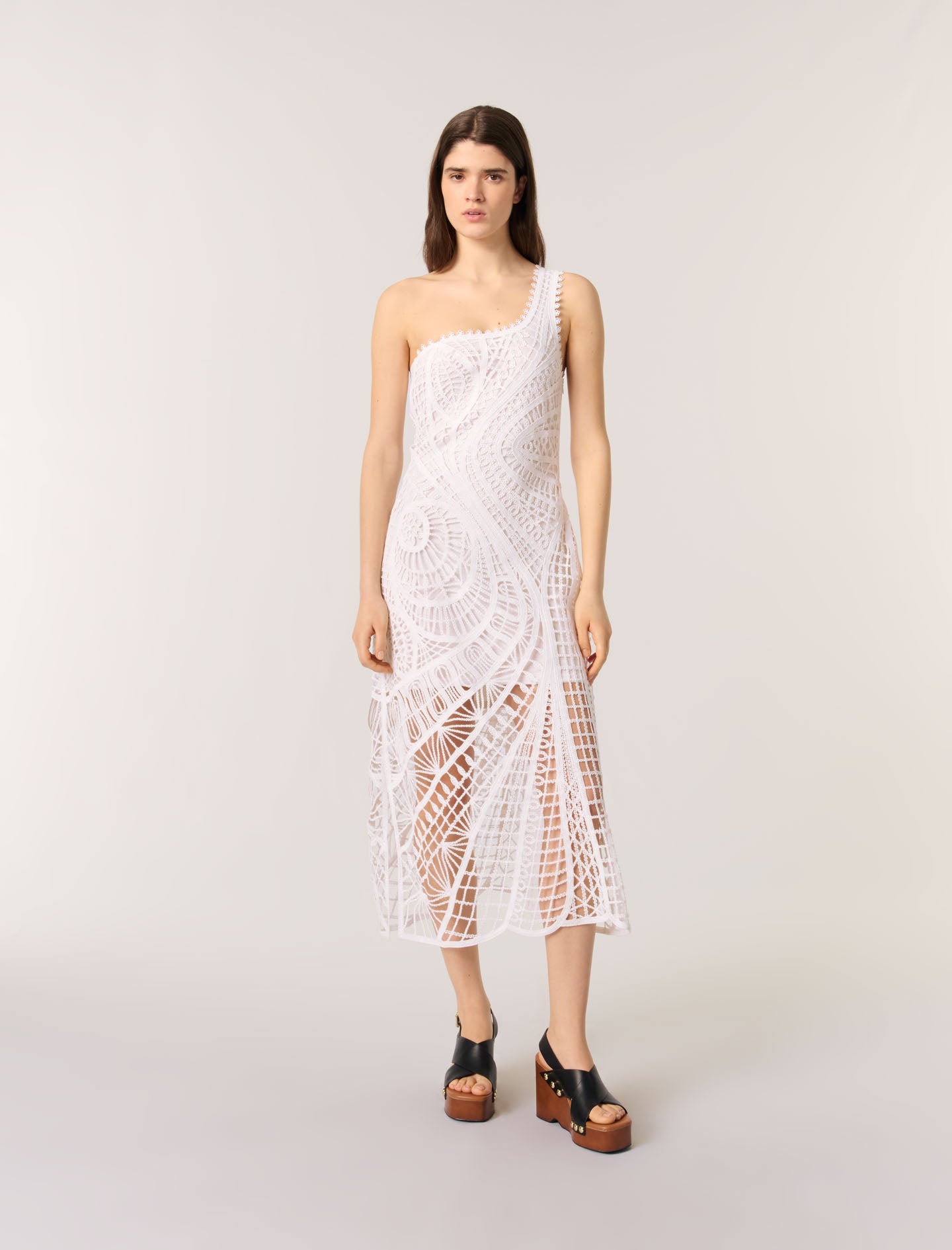 • Made from 100% cotton crochet, this maxi dress features an organic pattern that flatters your figure. Floral crochet braid accentuates the asymmetrical strap, adding an irresistible couture touch. The short lining contrasts elegantly with the side slit skirt.