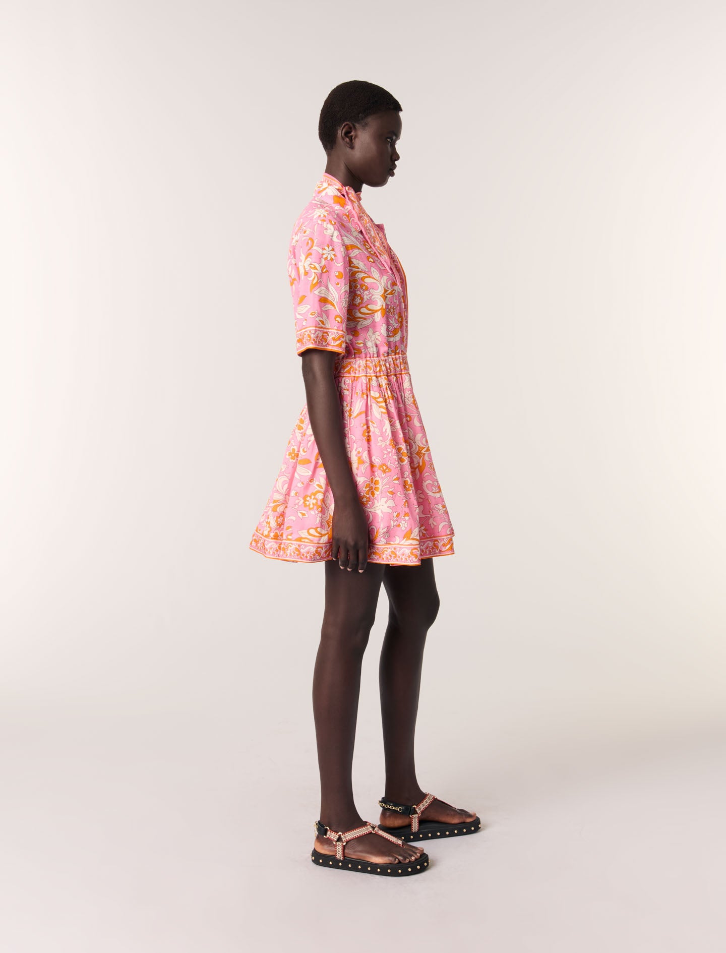 • Made from linen, this short shirt dress features a floral print in warm hues, a nod to the ‘70s. Its smocked waist and button fastening extends into a skater skirt. Two pockets finish ogg this light, elegant piece.