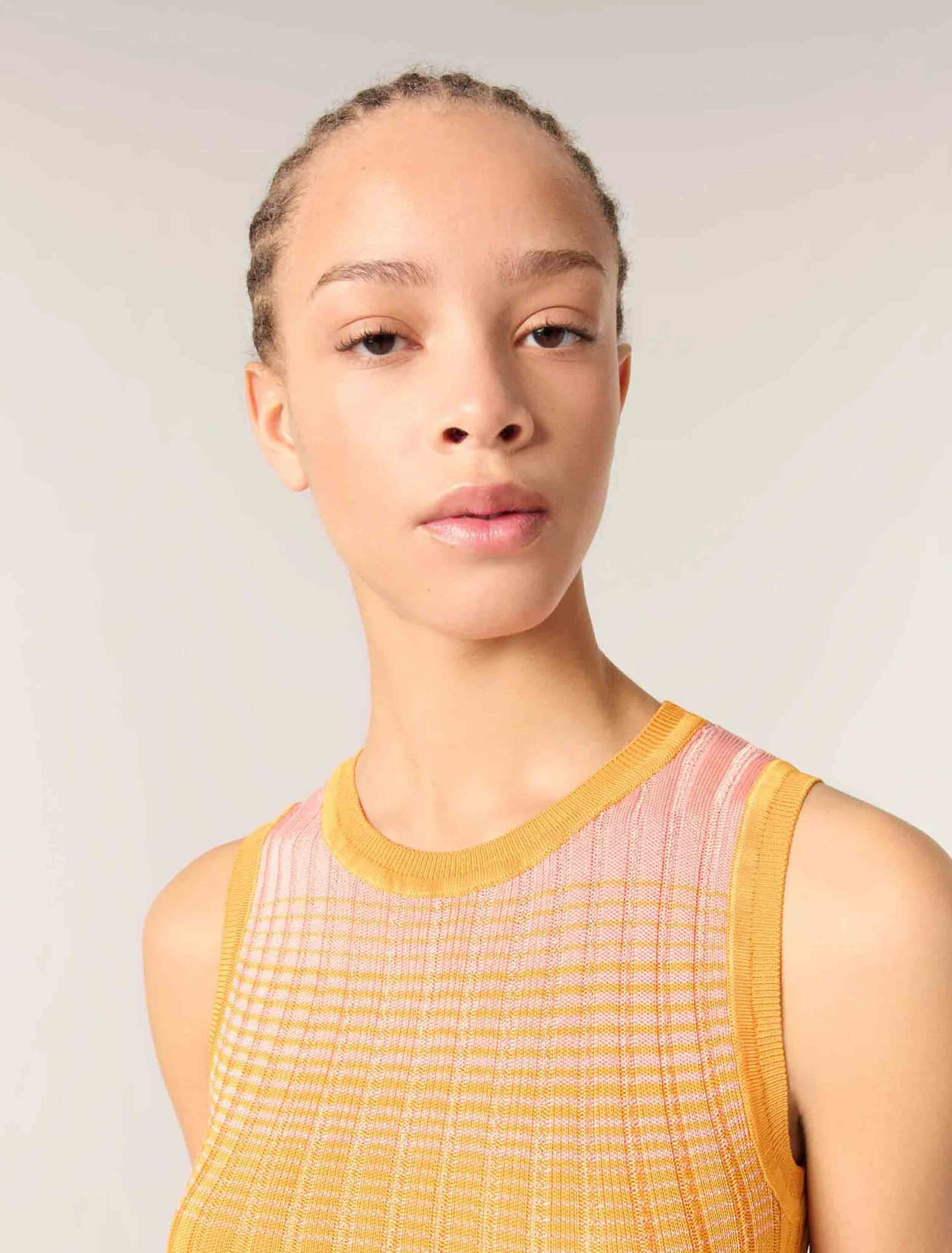 • The centrepiece of the season, this sleeveless maxi dress features an orange gradient reminiscent of the sunset. Made from lightweight pointelle knit, you can wear it with sandals for a day at the beach or a summer evening out.