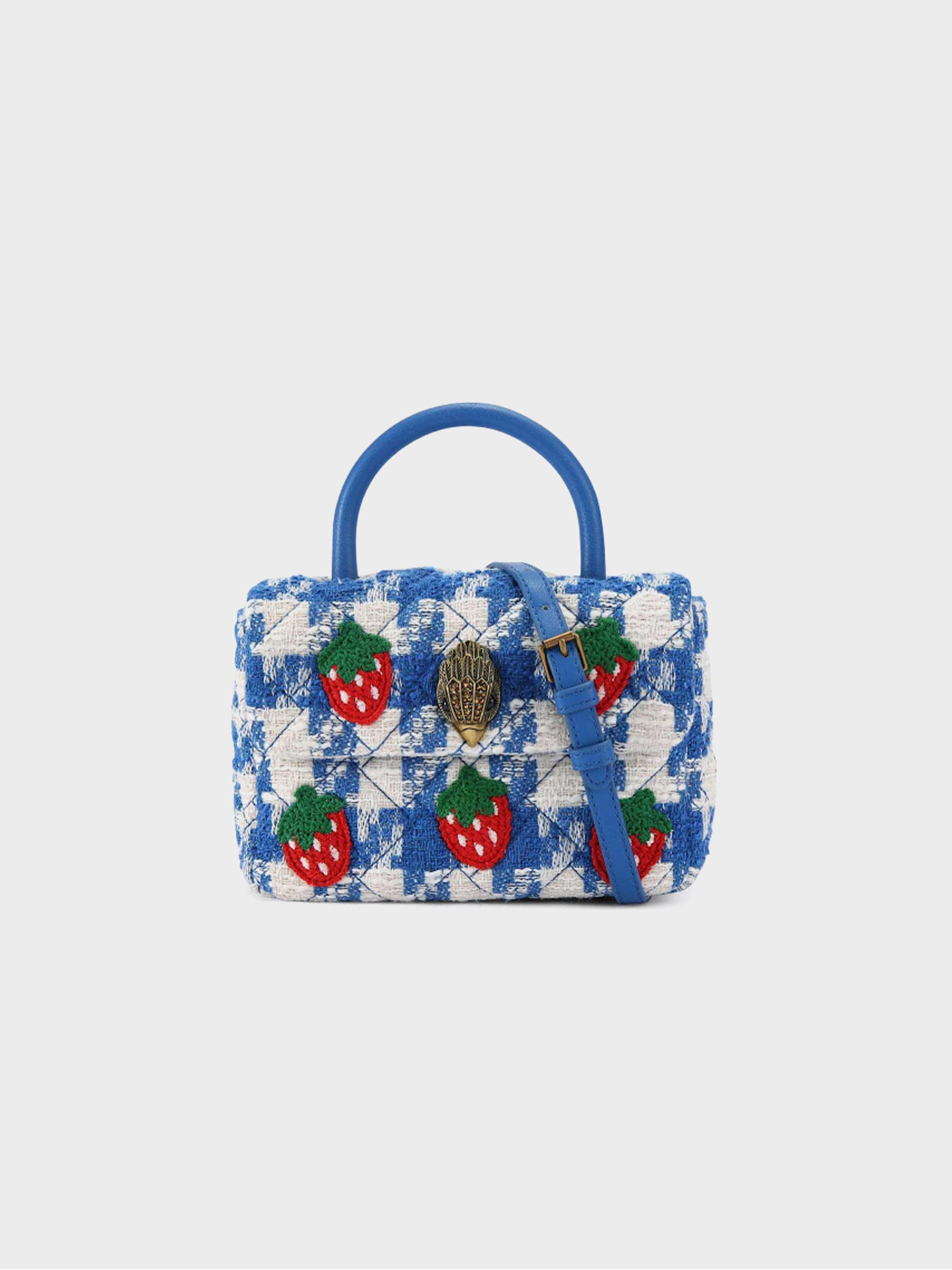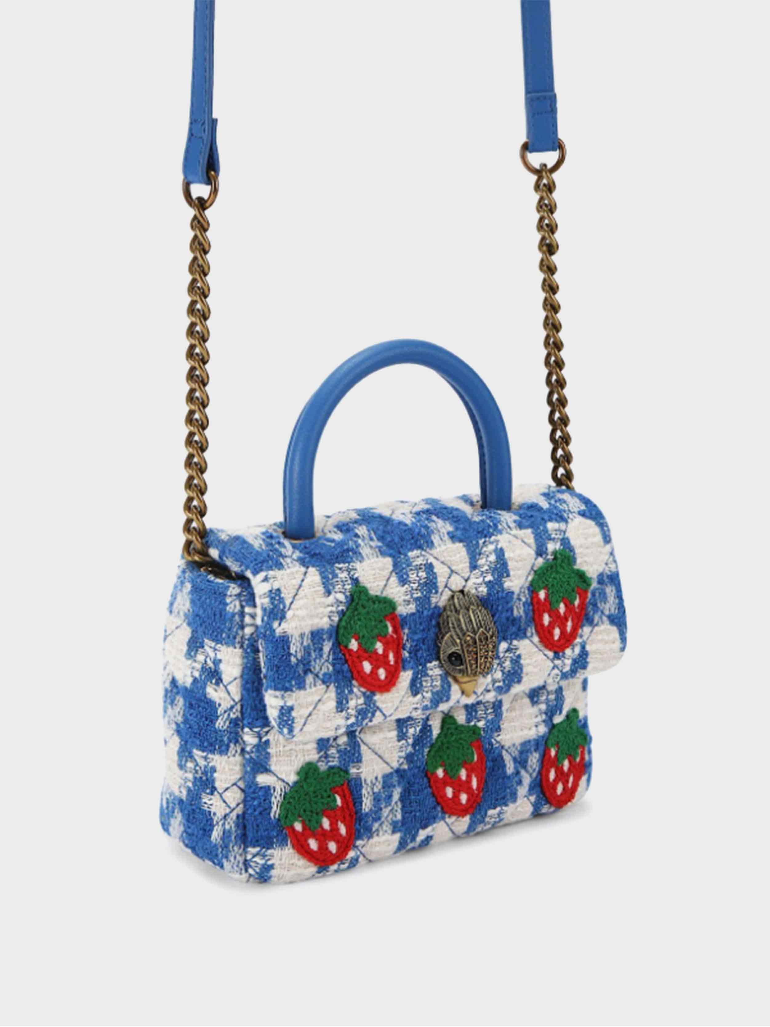 • This Mini Handle Kensington Bag features a blue herringbone tweed upper with appliqué strawberry motifs.