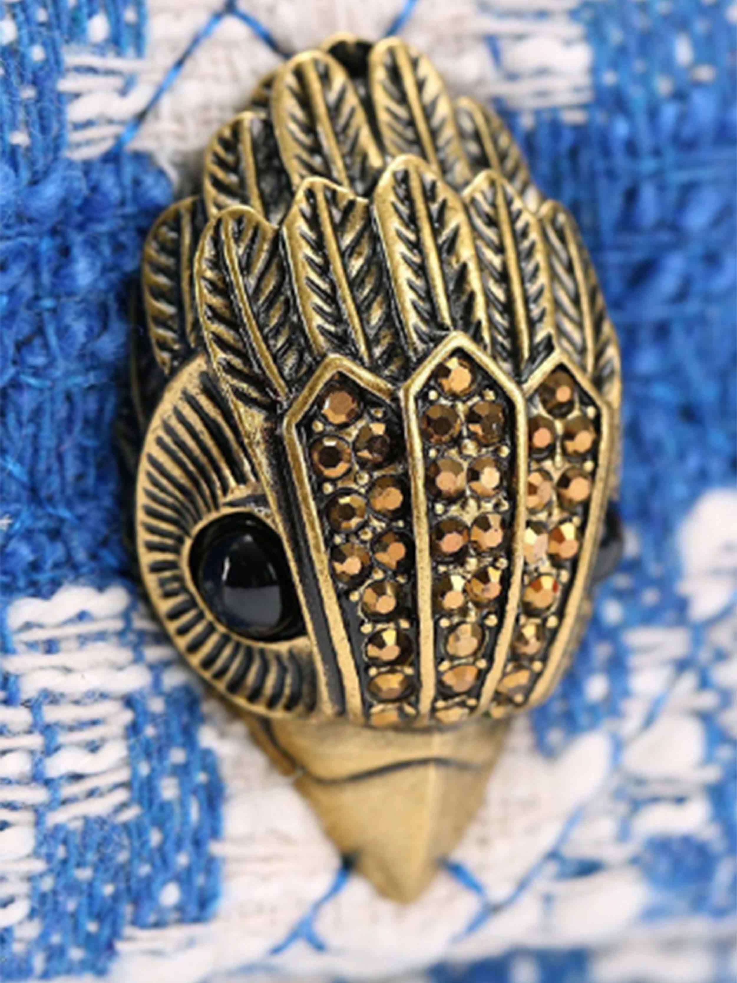 • There is an antiqued brass eagle head with crystals sat on the front flap.