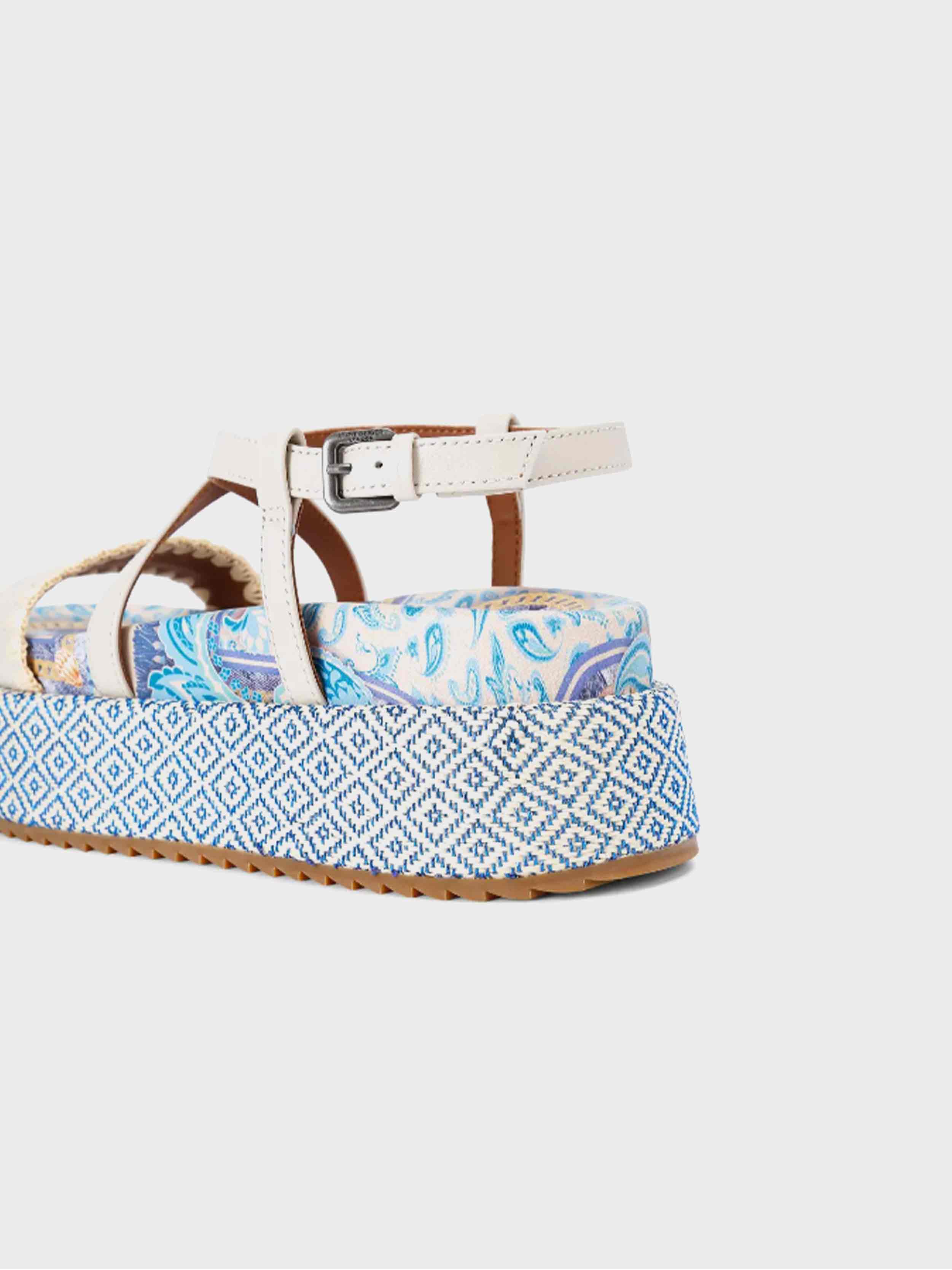 • The upper straps are in a taupe leather with stitching detail on the toe strap. The sole is a platform style with blue printed design.