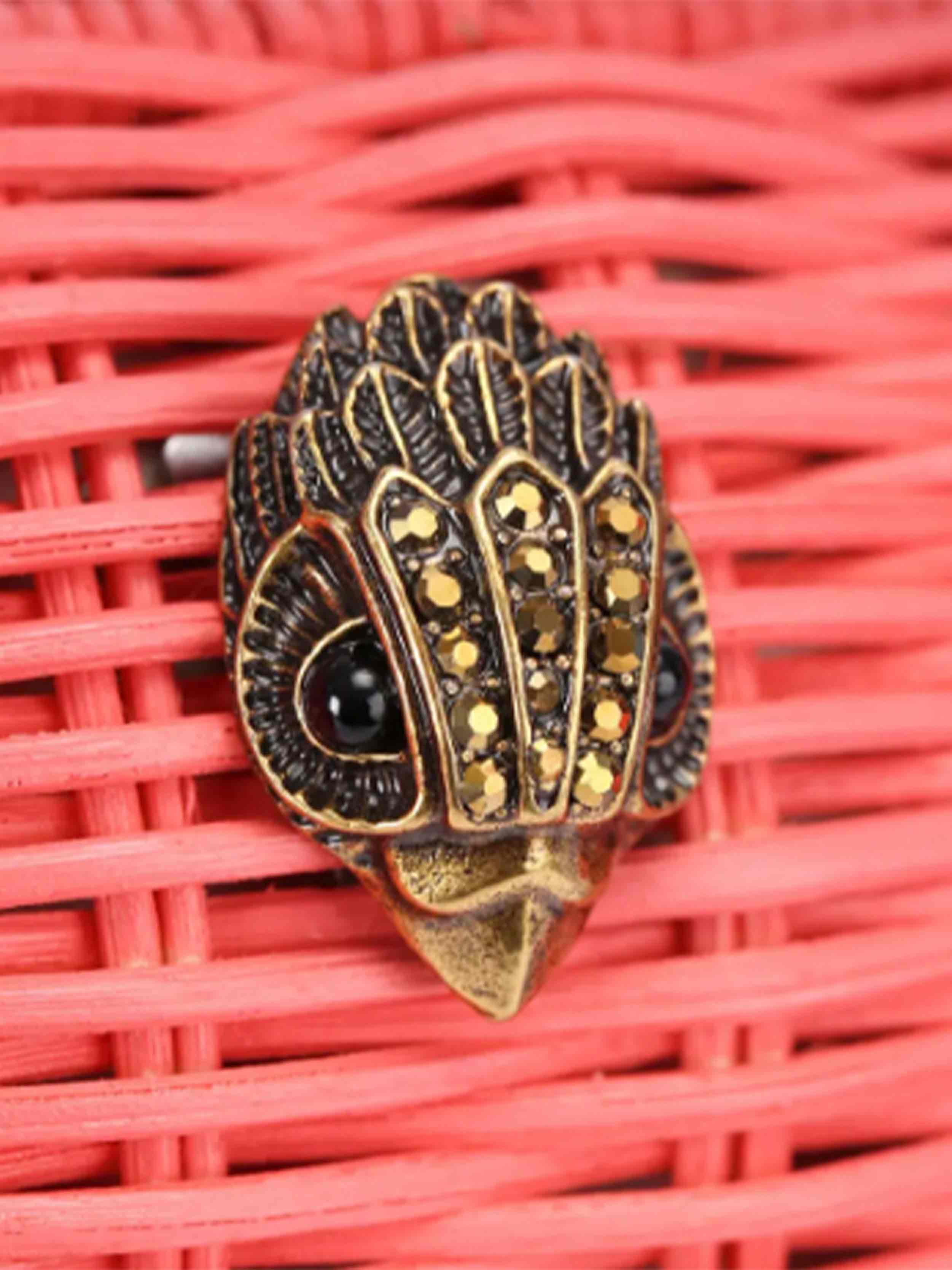 • There is an eagle head on the front and a strawberry-printed satin scarf around the top handles.