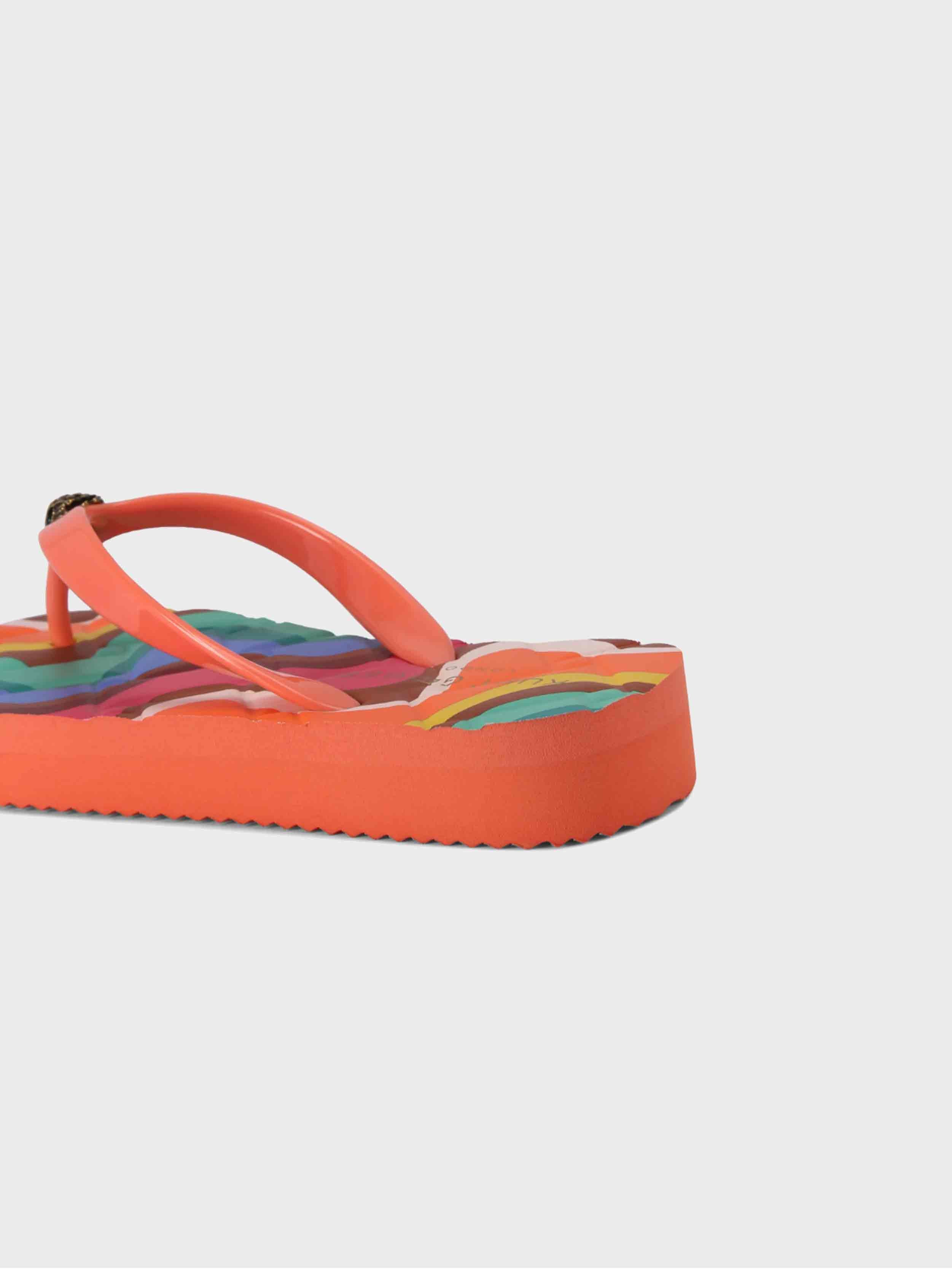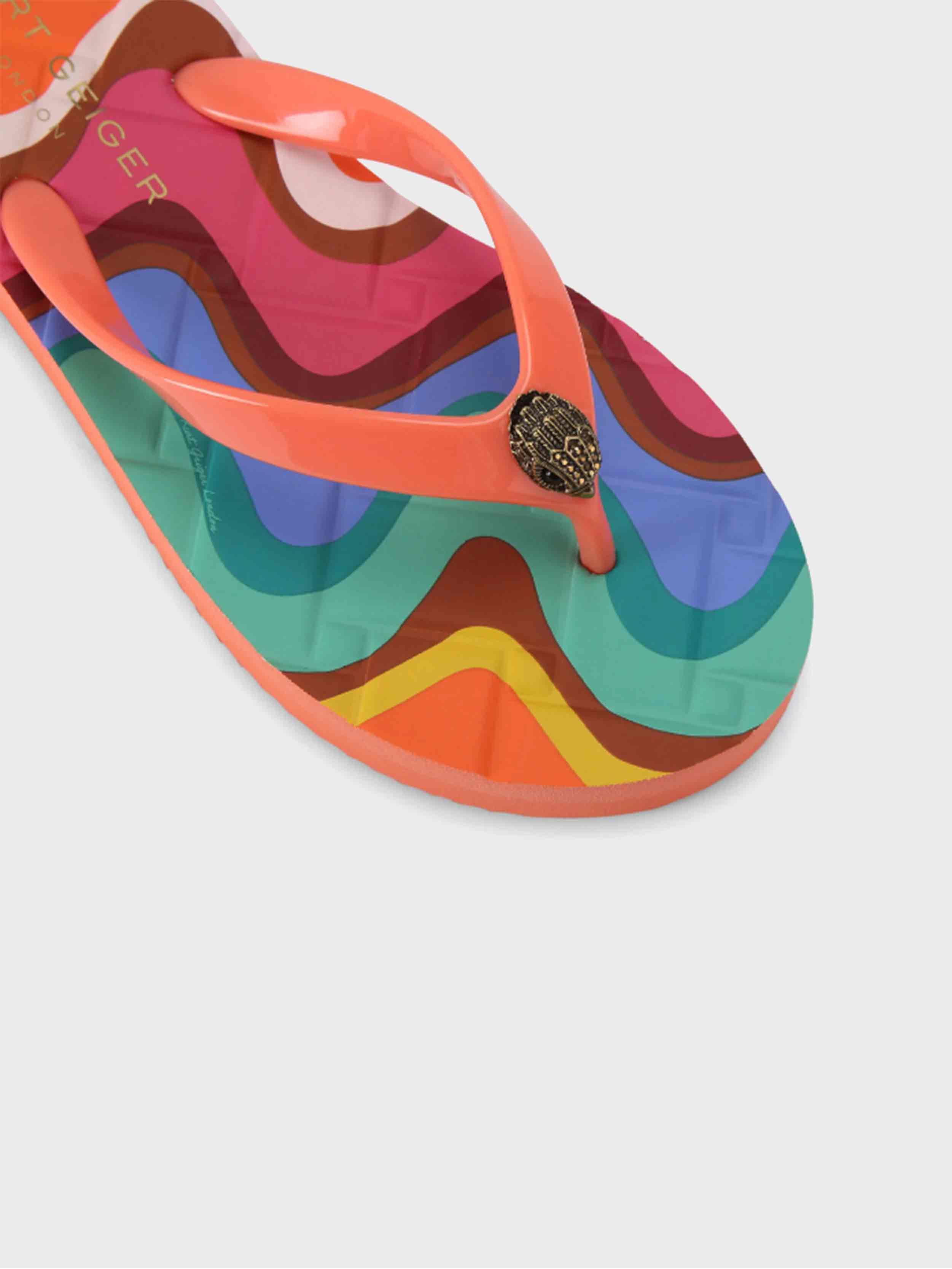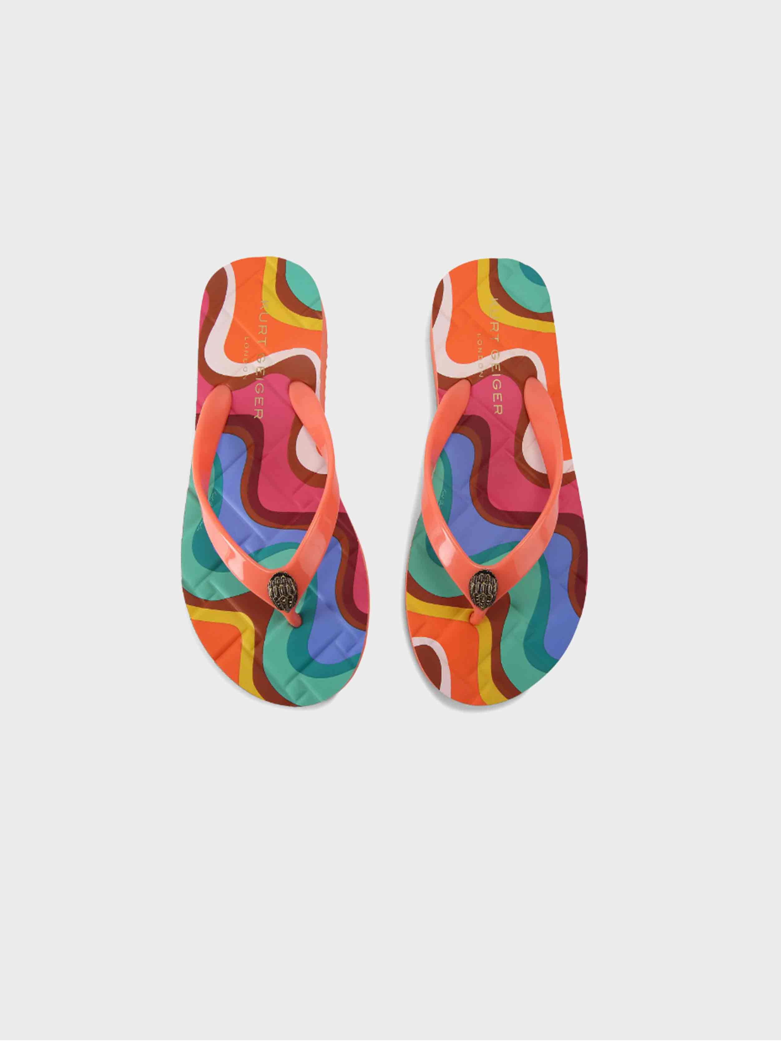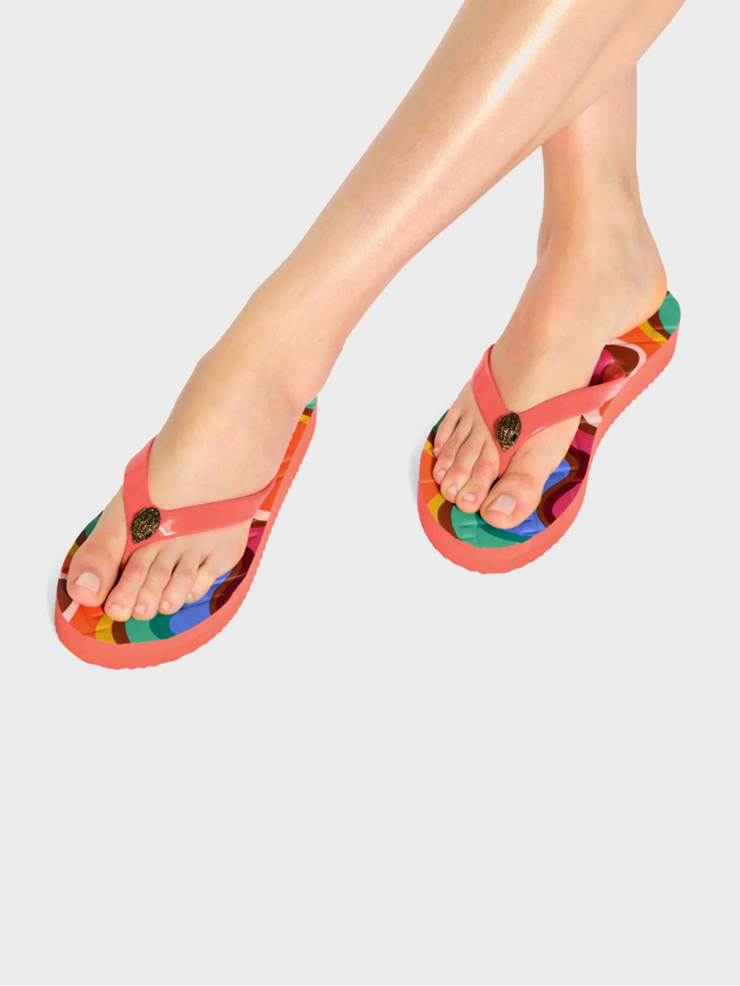 • The Kensington Quilted Flip Flop is crafted in a orange toe-post style with statement rainbow swirl print on the sole.
