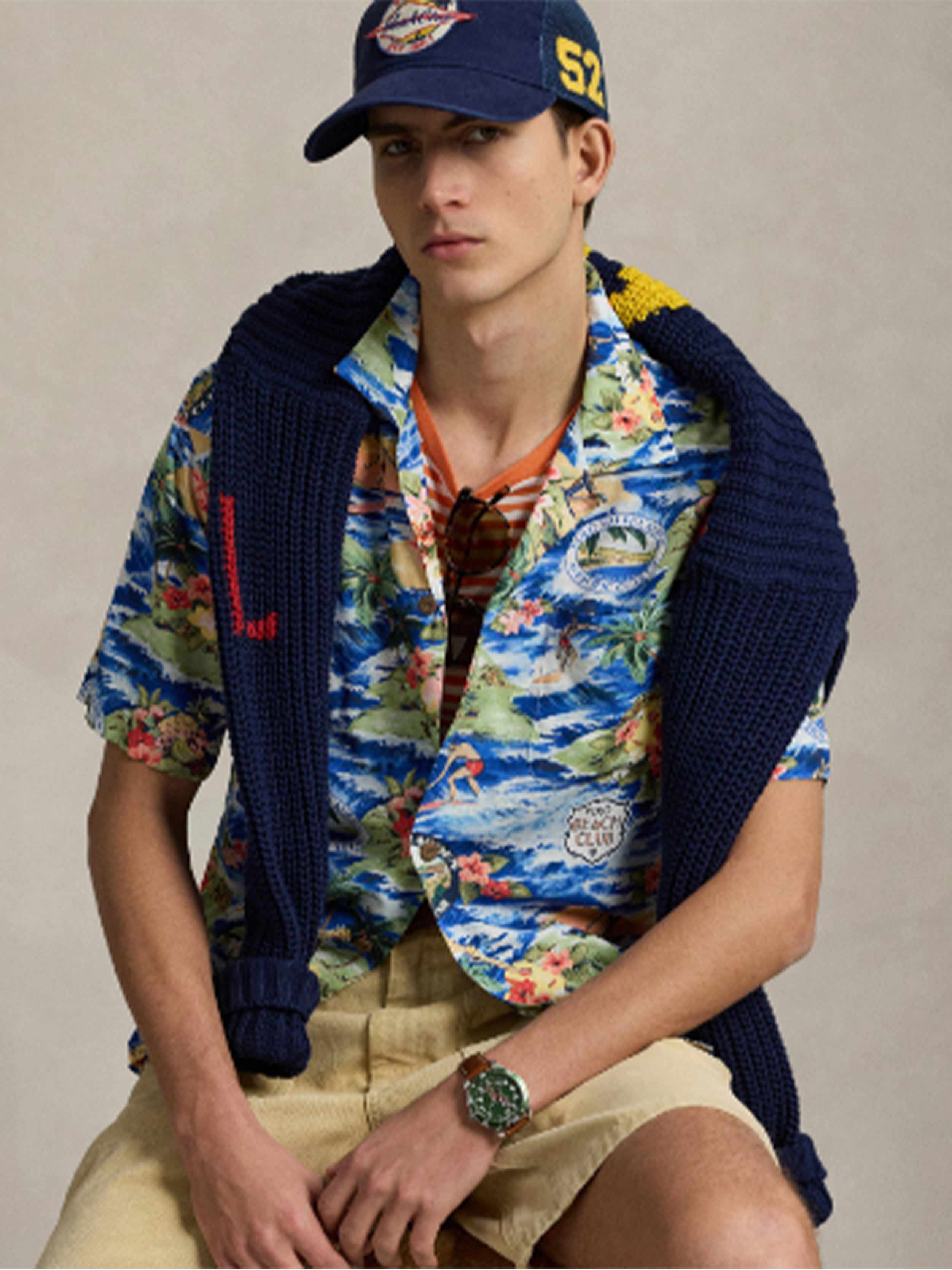 • Finished with coconut-shell buttons, this lightweight camp shirt features a custom-developed print that unites a scenic tropical motif with a signature surf club logo.
