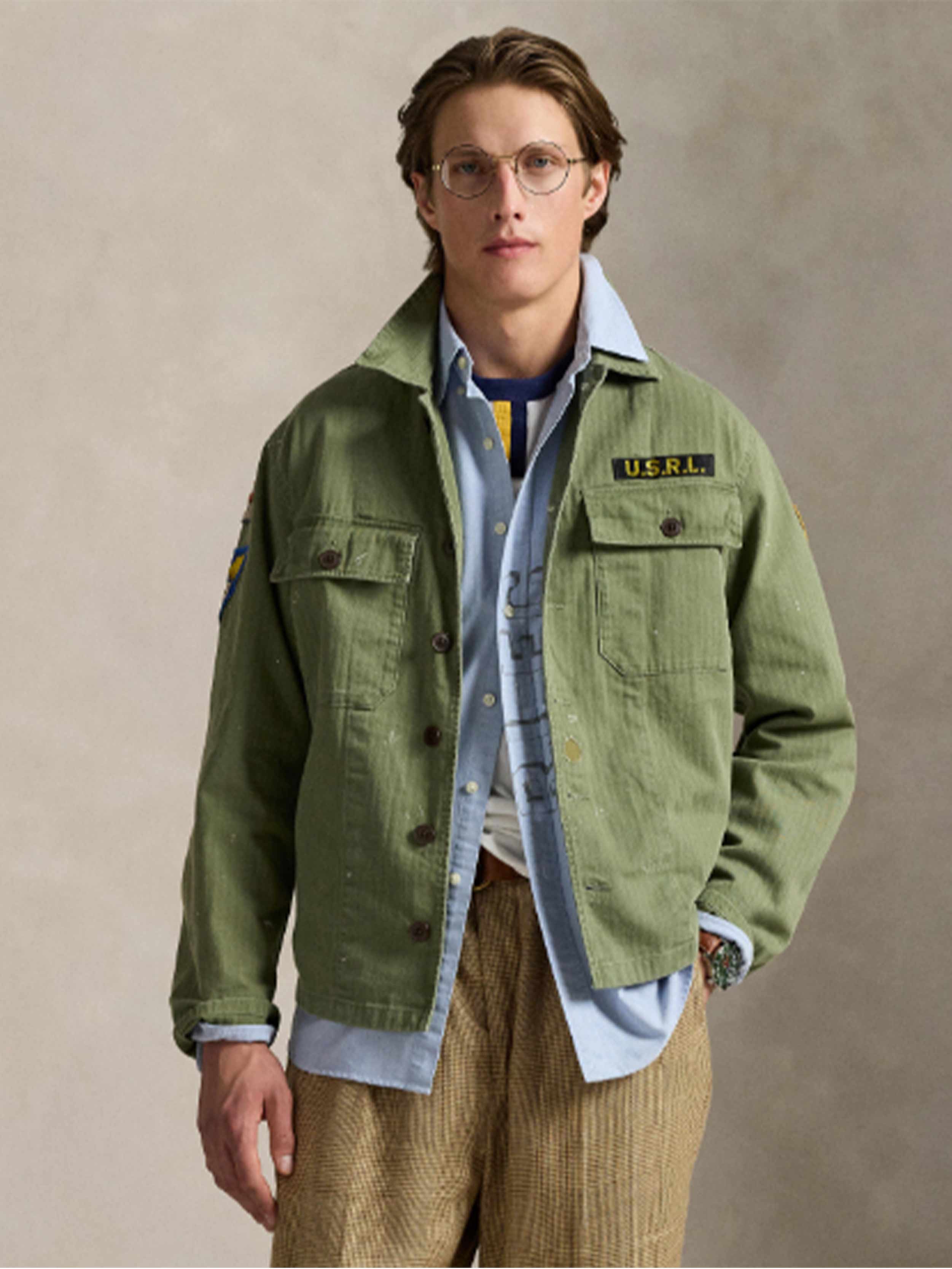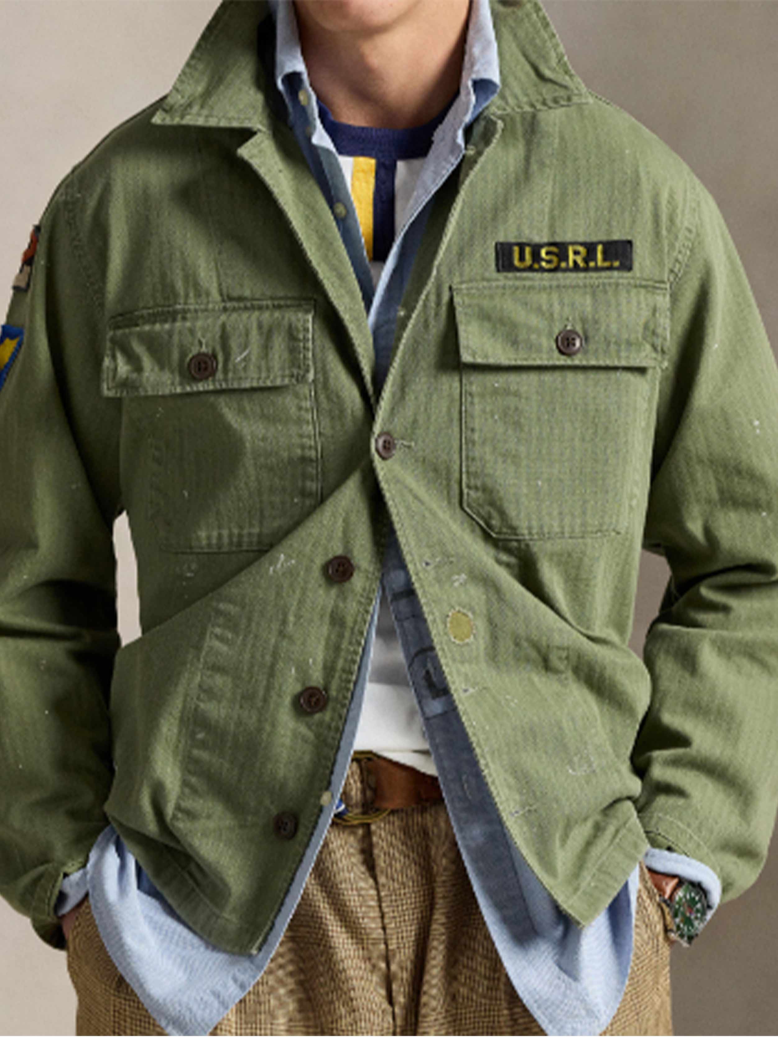 • Two chest buttoned pockets. "U.S.R.L." patch above the left pocket. "Arte et Marte" patch at the left sleeve. "2" and "R" shield and wings patches at the right sleeve.