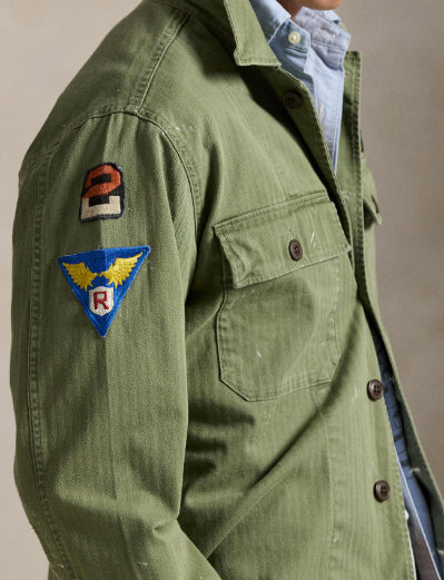 • Made with herringbone cotton twill, this utilitarian shirt is artfully distressed and finished with surplus-inspired patches.