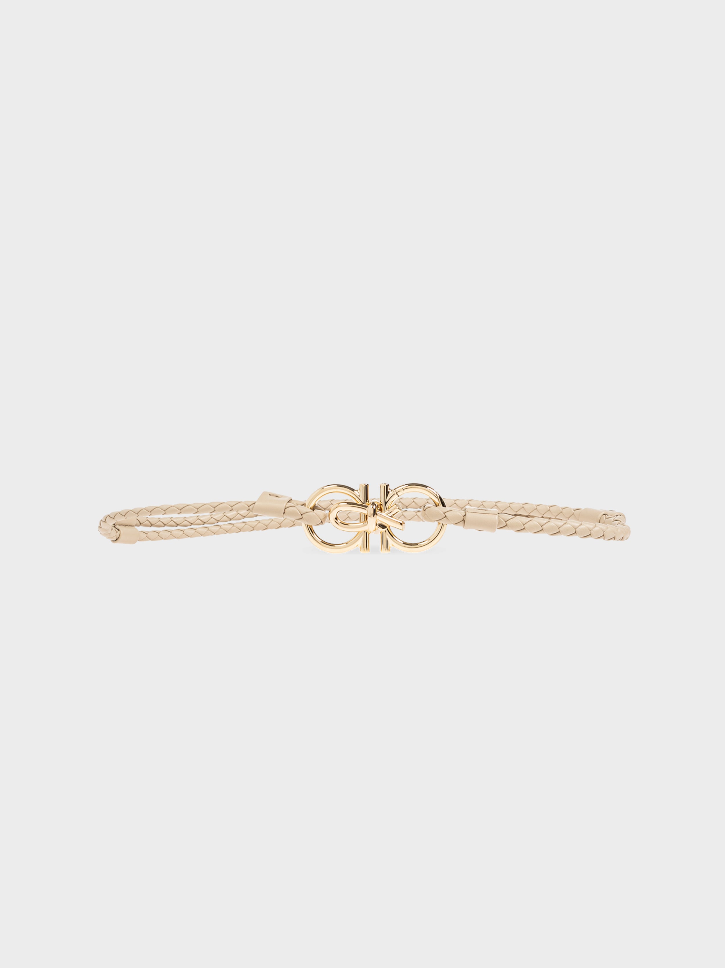 • The Double Gancini buckle is tied together by a romantic bow in a warm golden hue, and the twisted belt shaft has a unique, scaly texture.