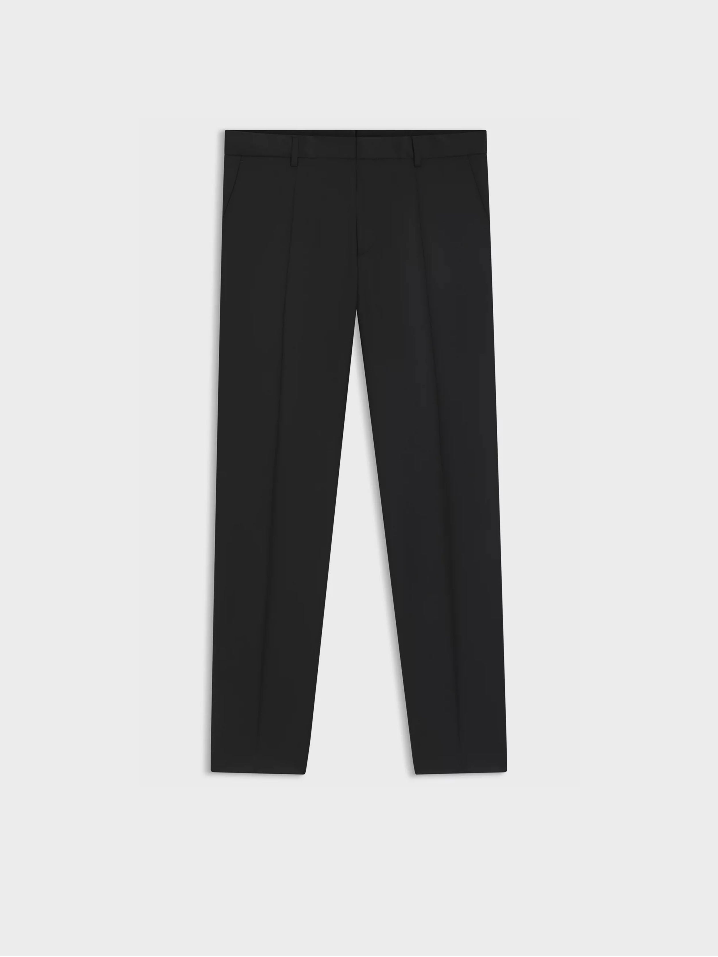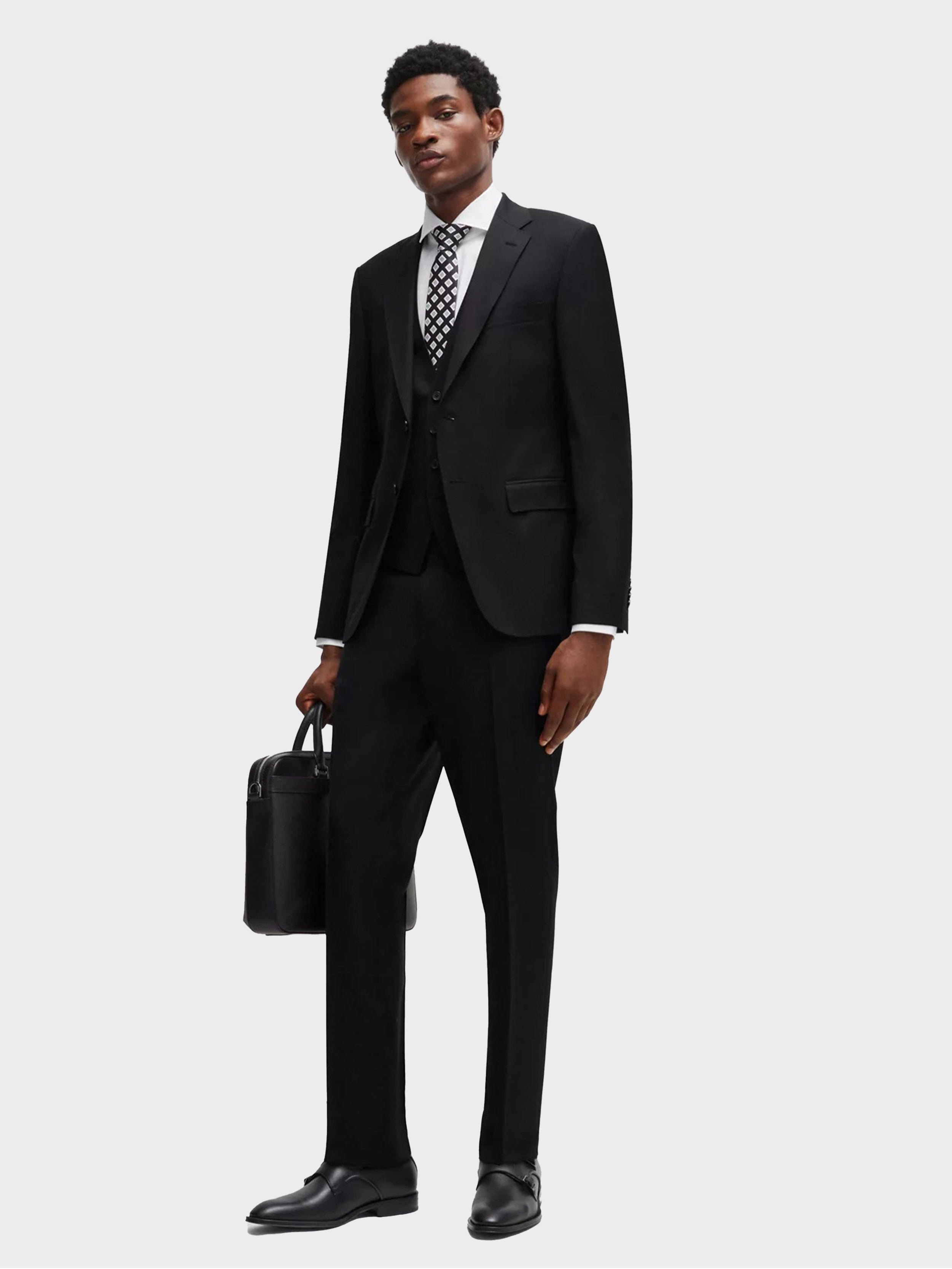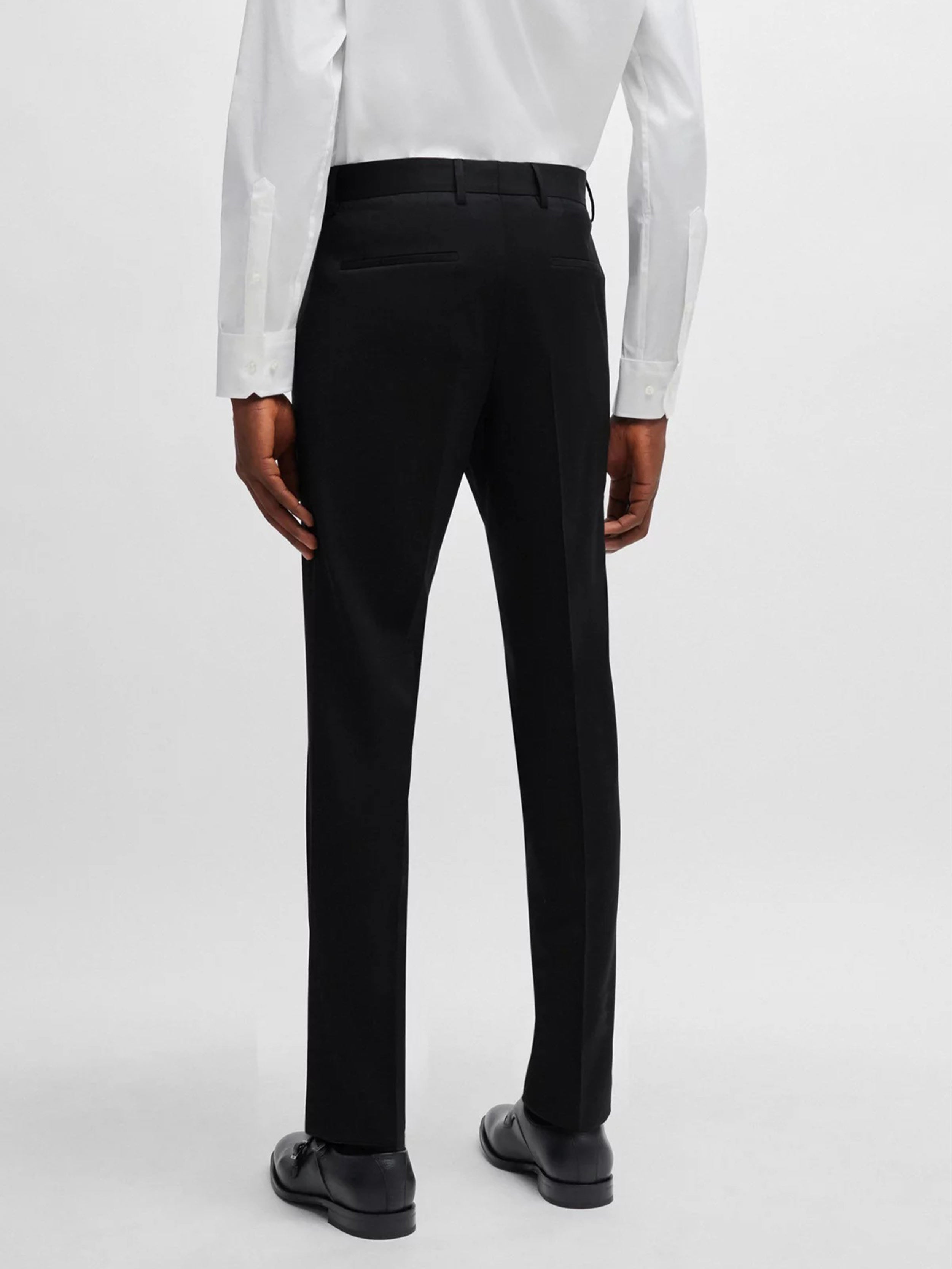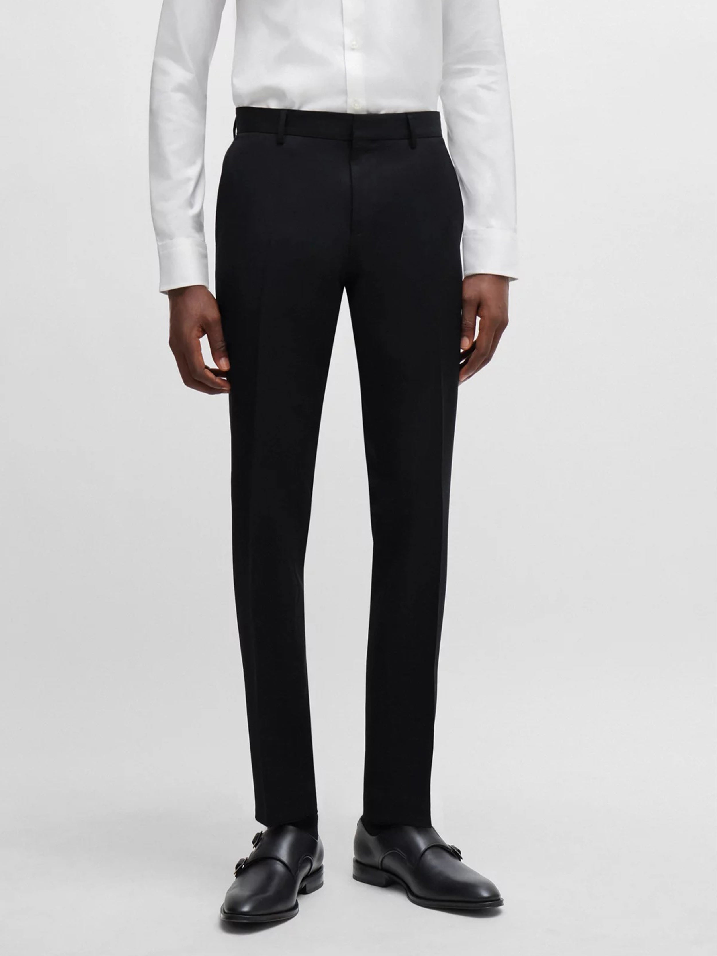• Cut a precise figure in these formal BOSS Menswear trousers. Crafted in finest wool with a serge weave and natural stretch for comfort. Slim fit.