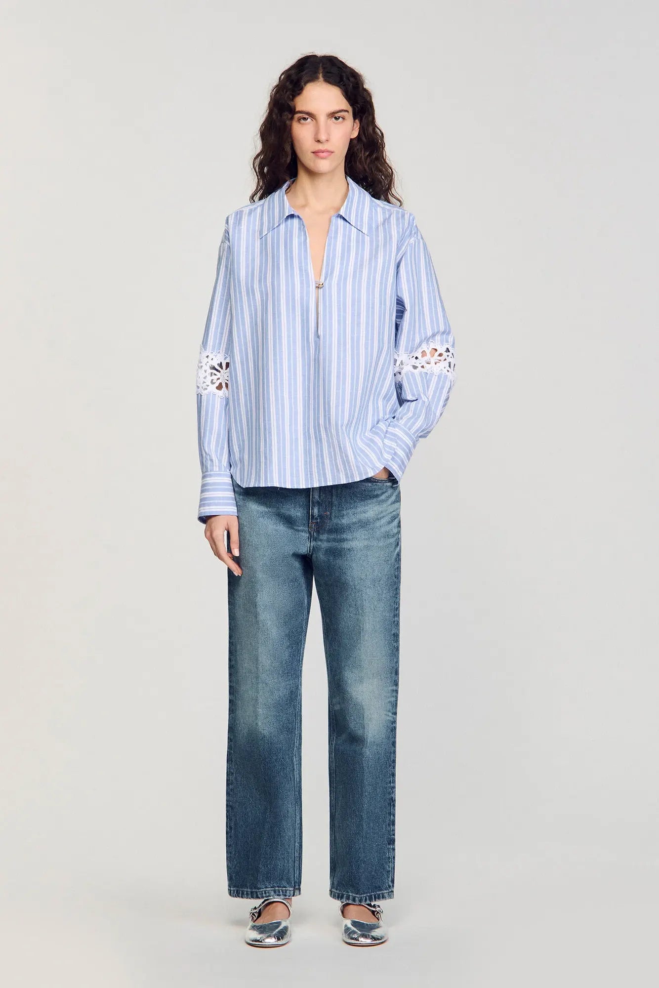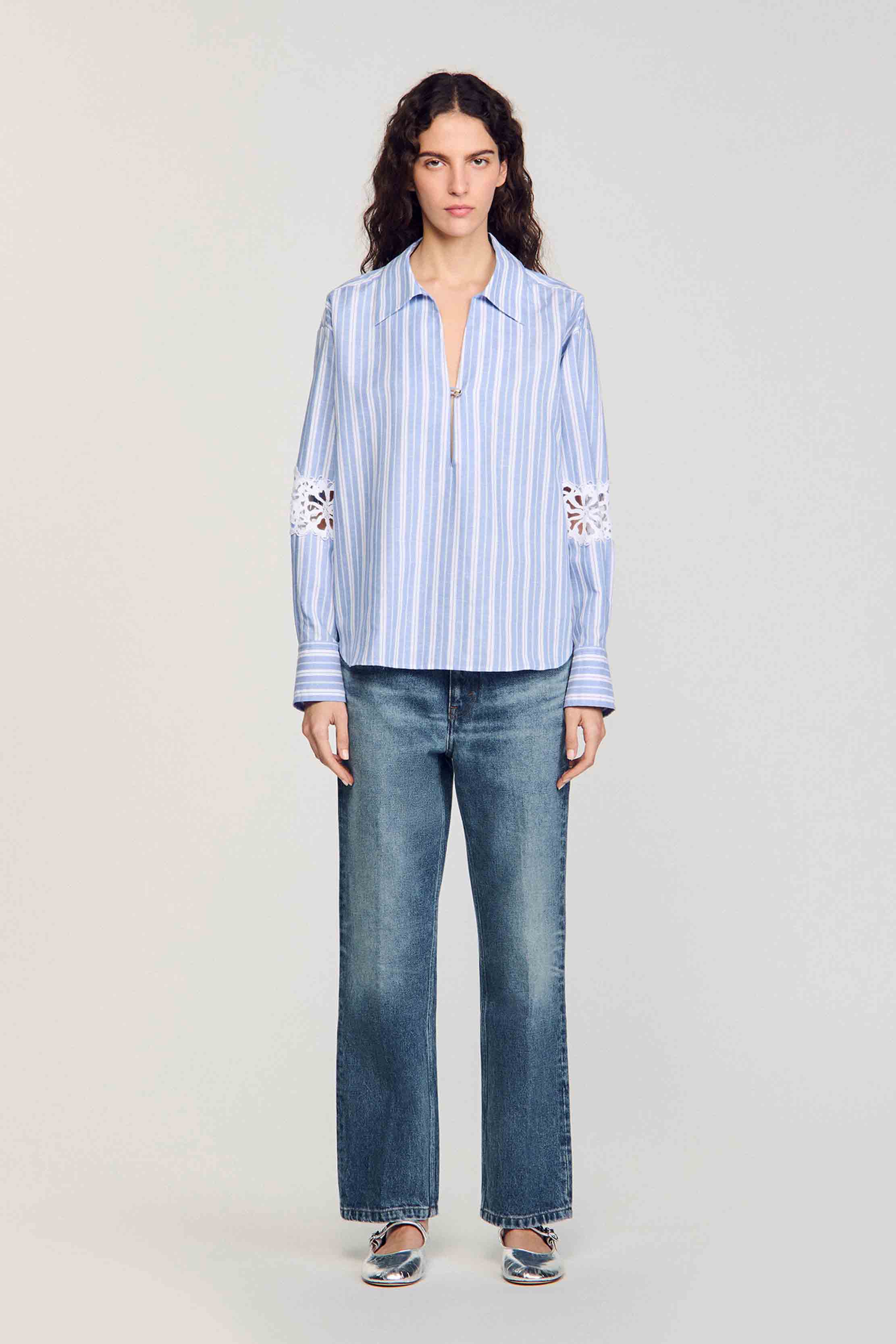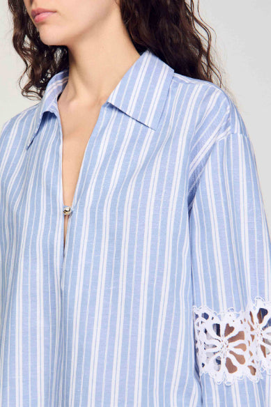 • Striped cotton and linen shirt with lace trim, featuring a plunging lapel collar, long sleeves and a decorative button.