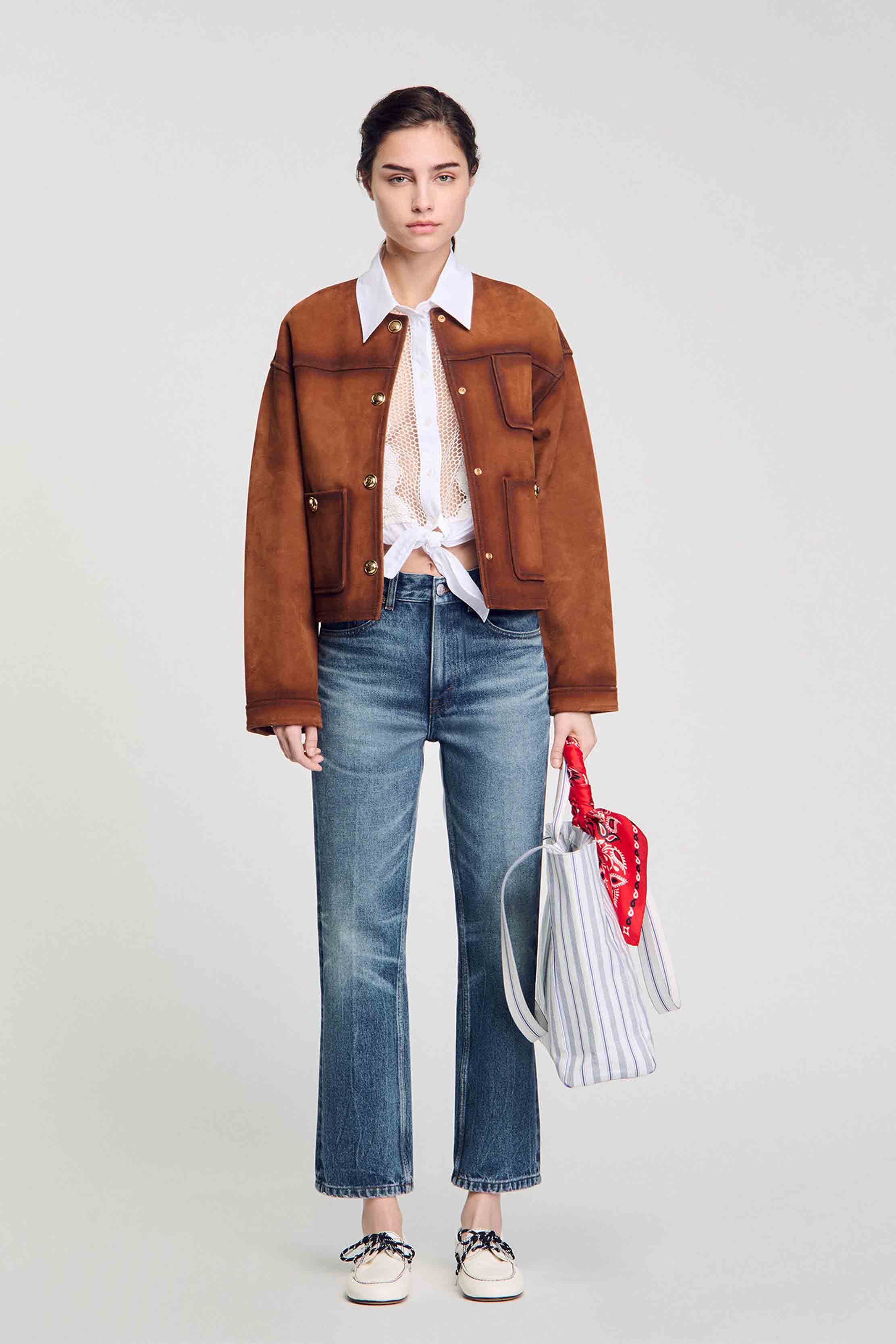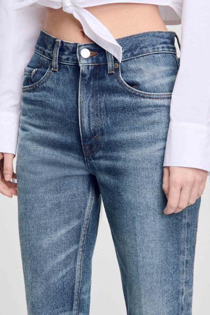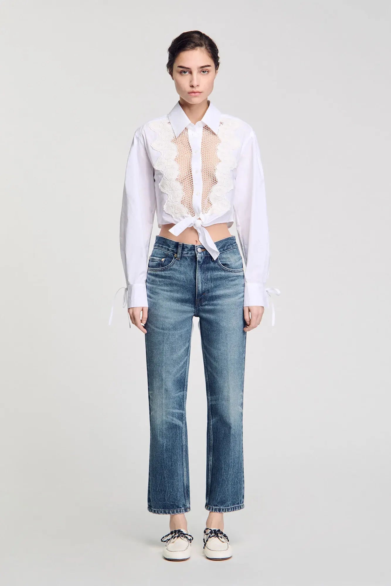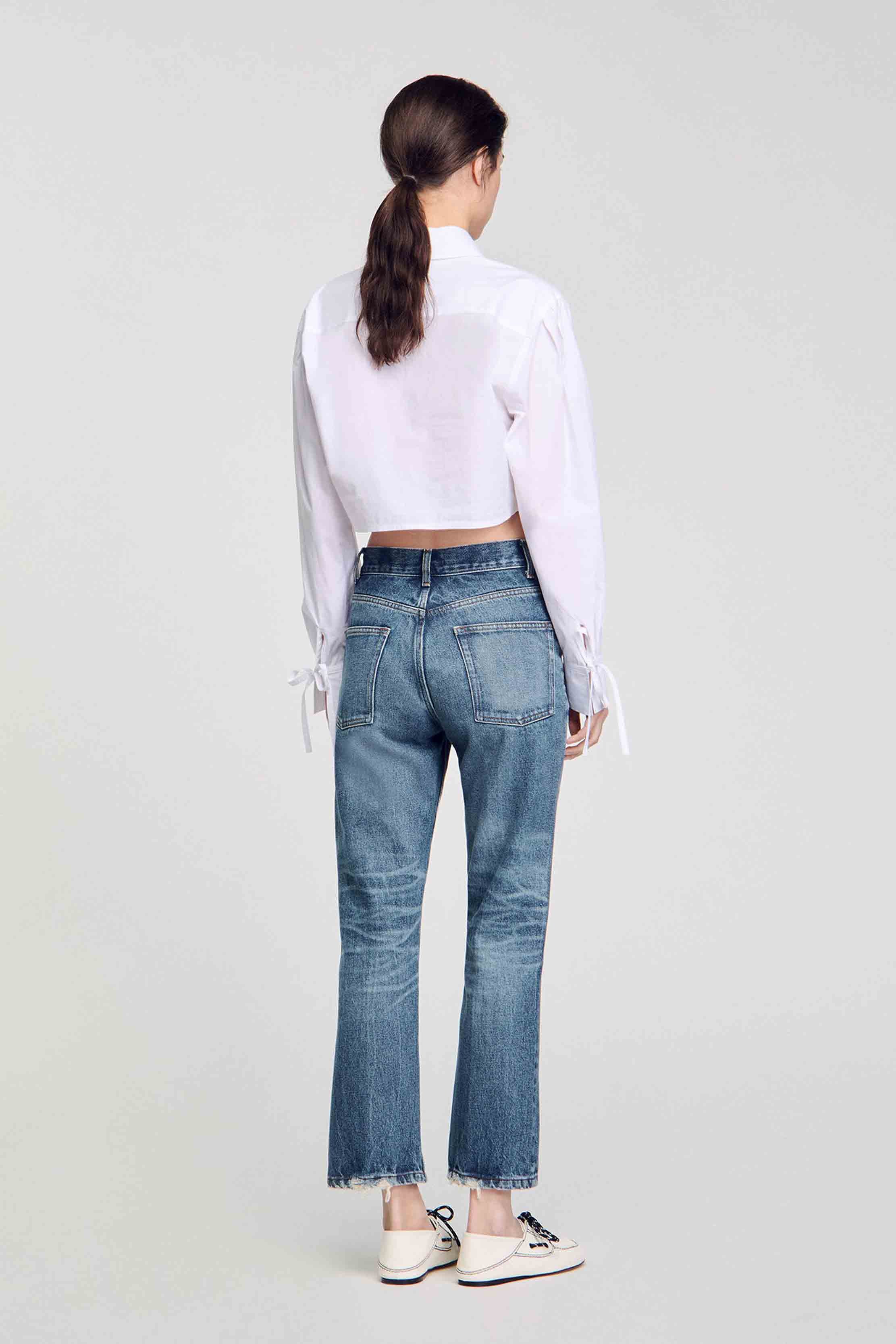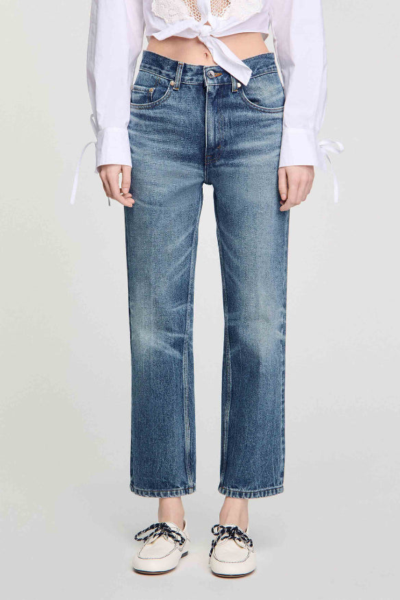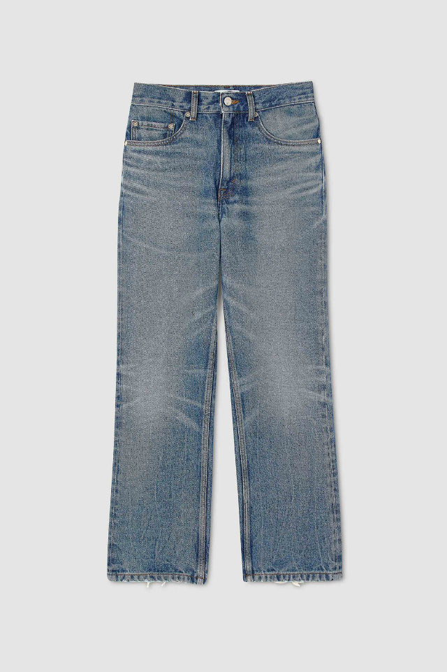 • 7/8-length straight-leg jeans, faded for a worn effect, with pockets and belt loops.