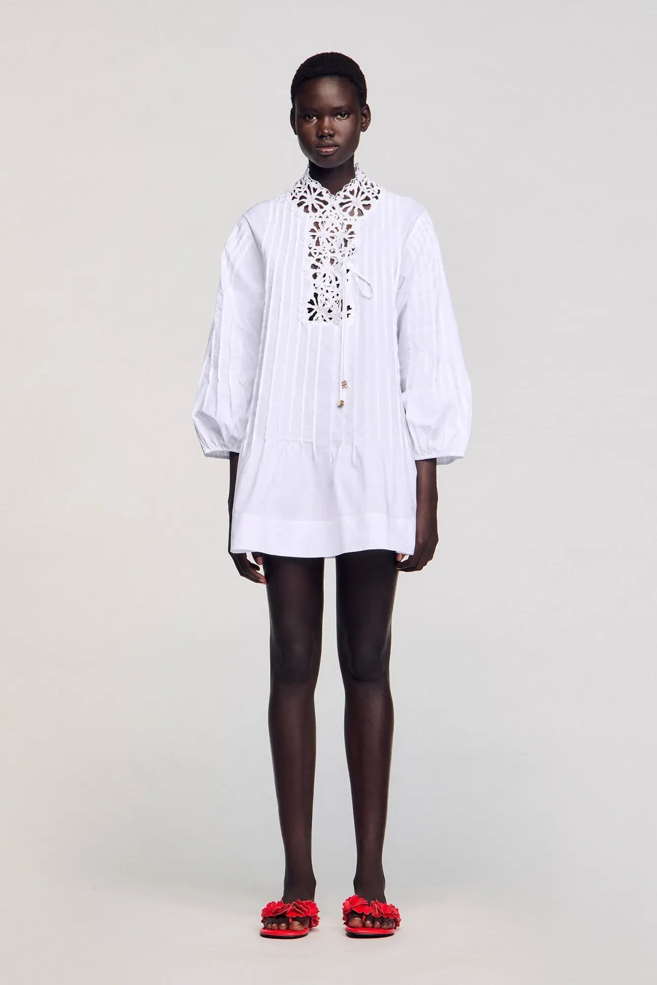 • Long-sleeved pleated short poplin dress with V-neck and lace.