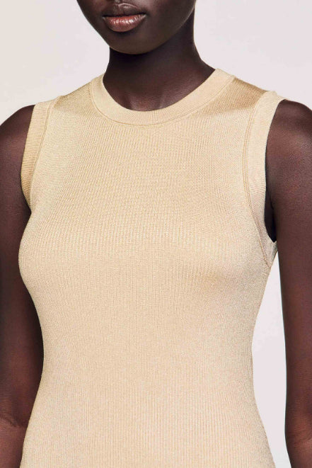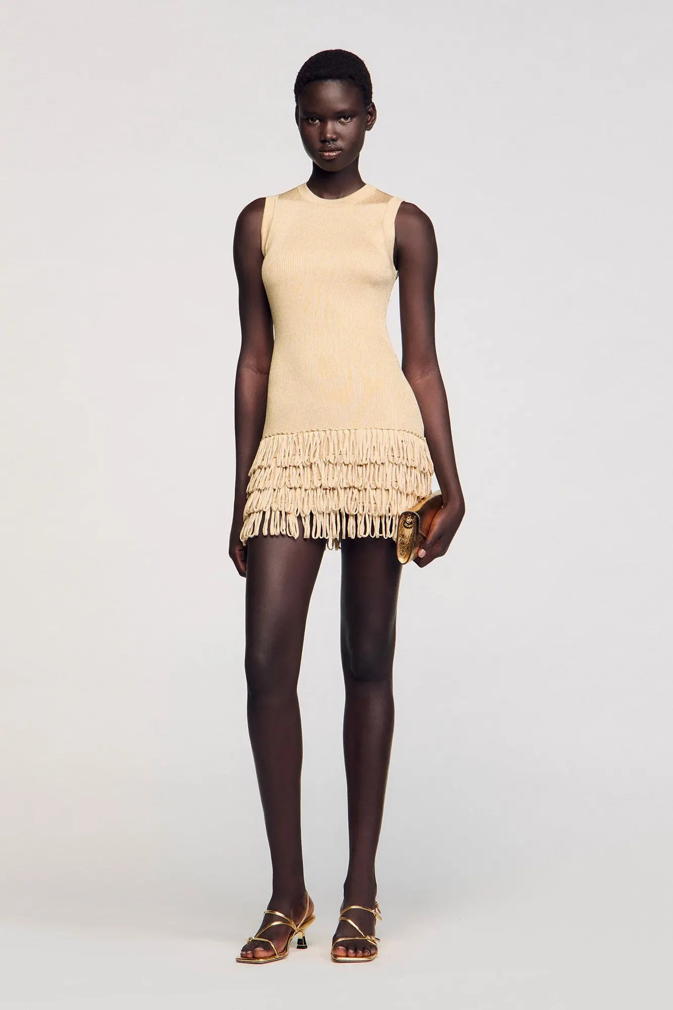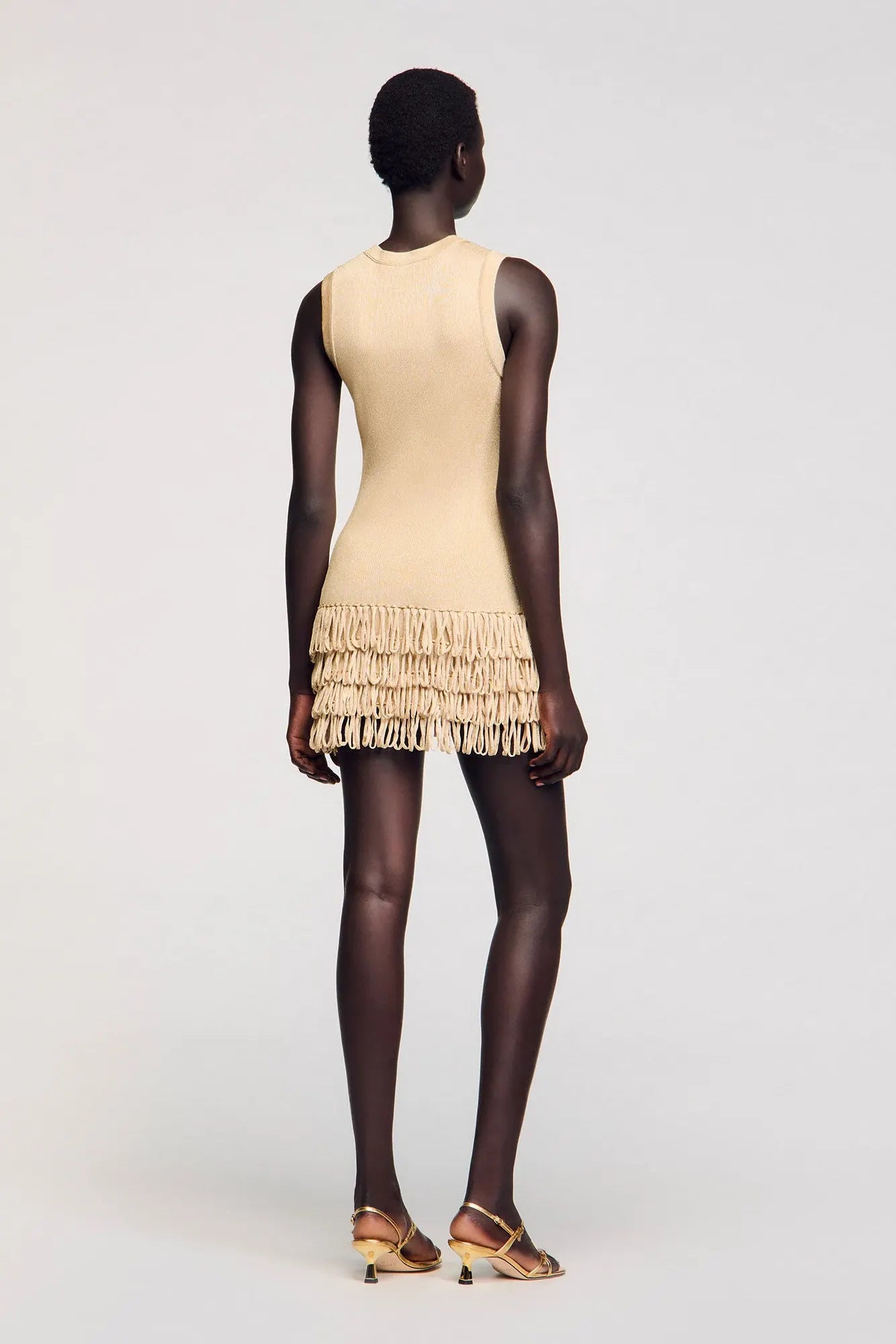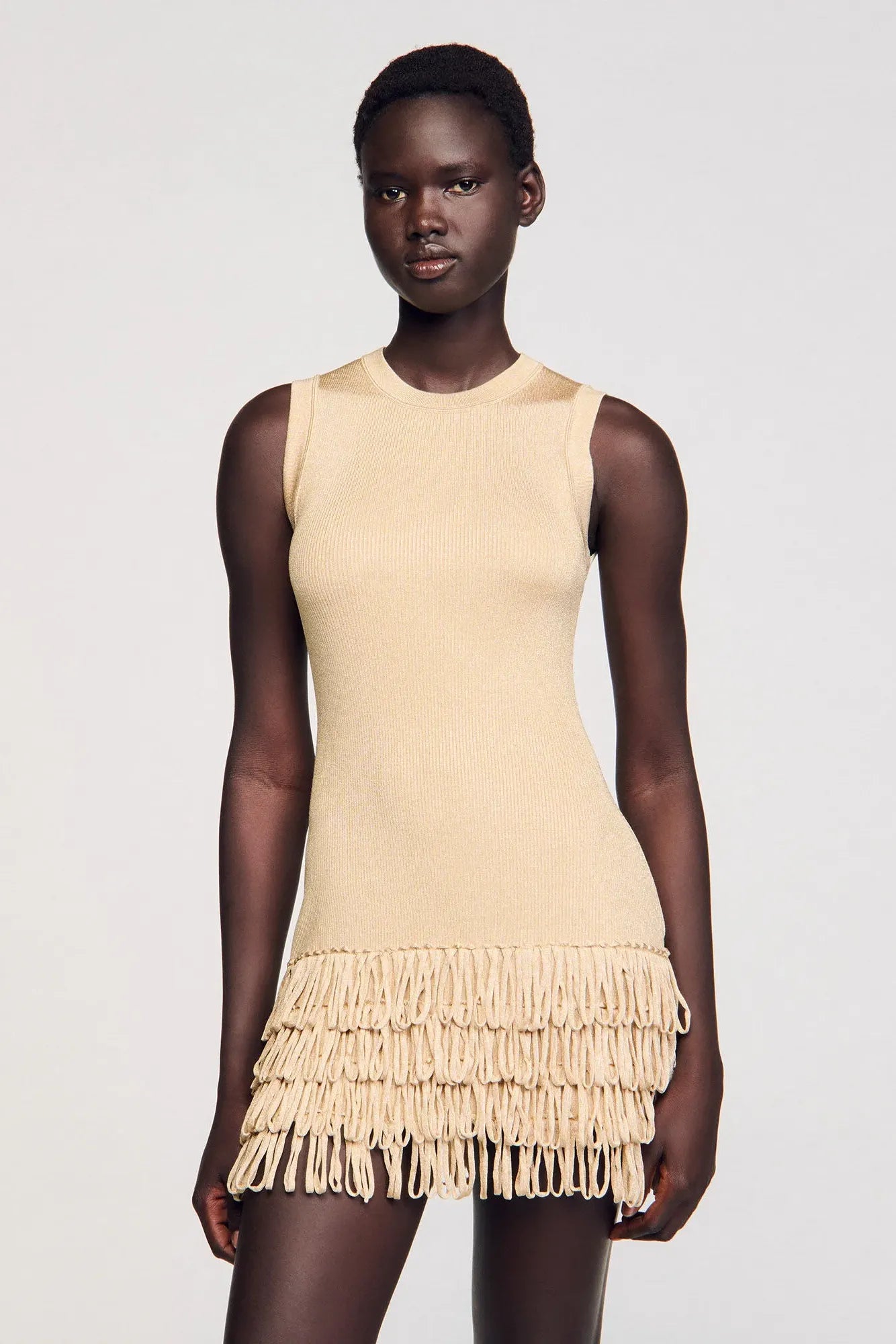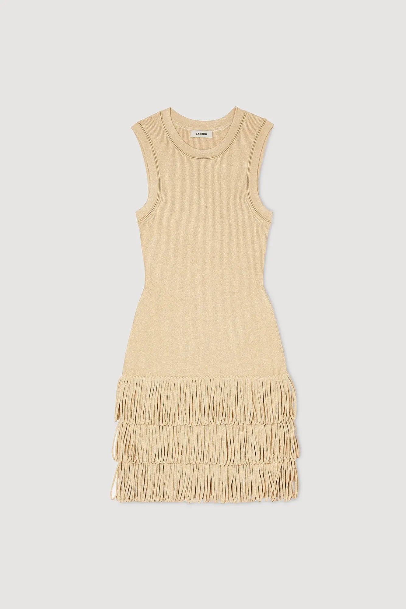 • Short shimmer knit dress with a round neck and layered fringes on the bottom of the skirt.