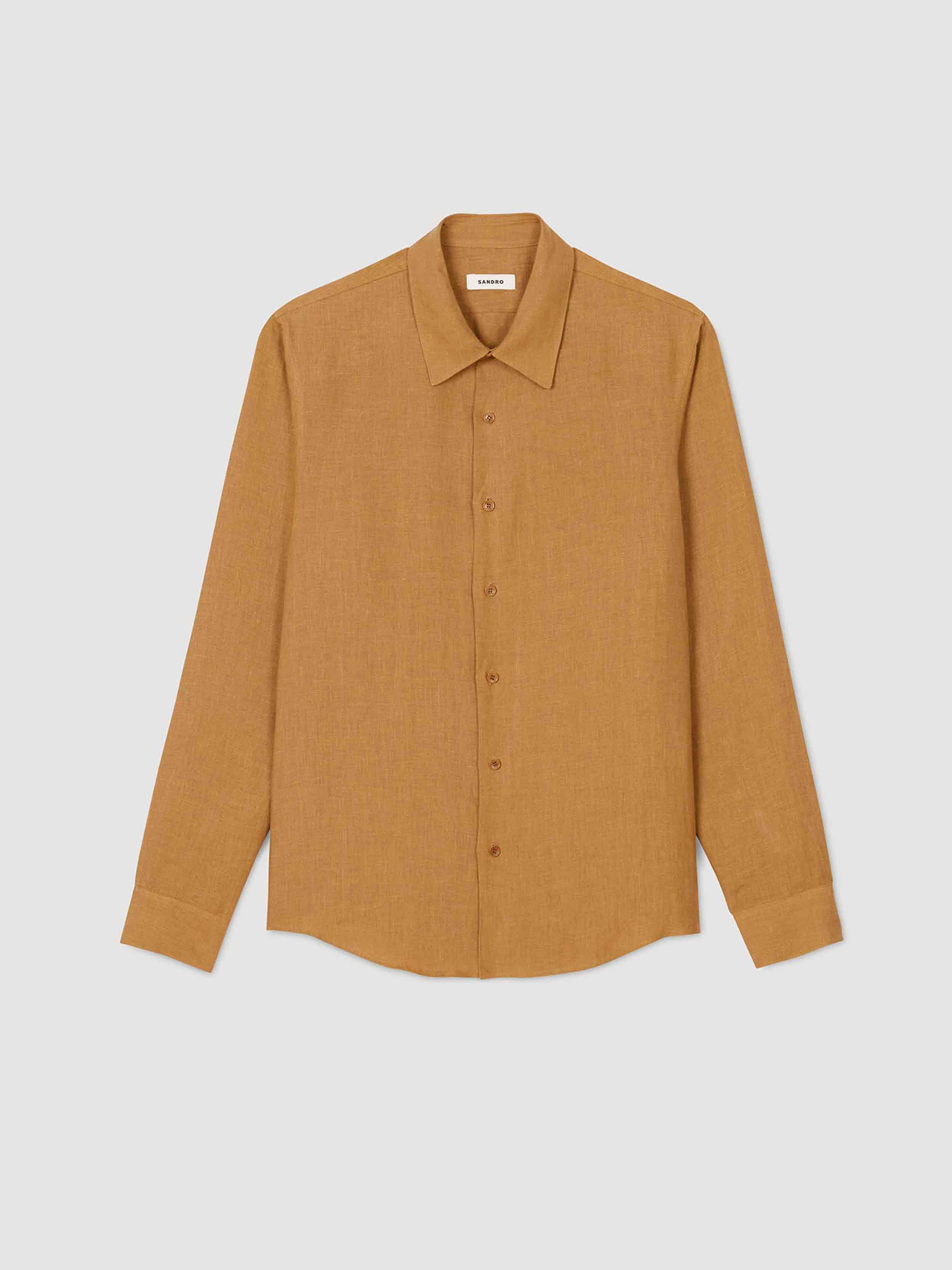 • Linen shirt with button placket and long sleeves.