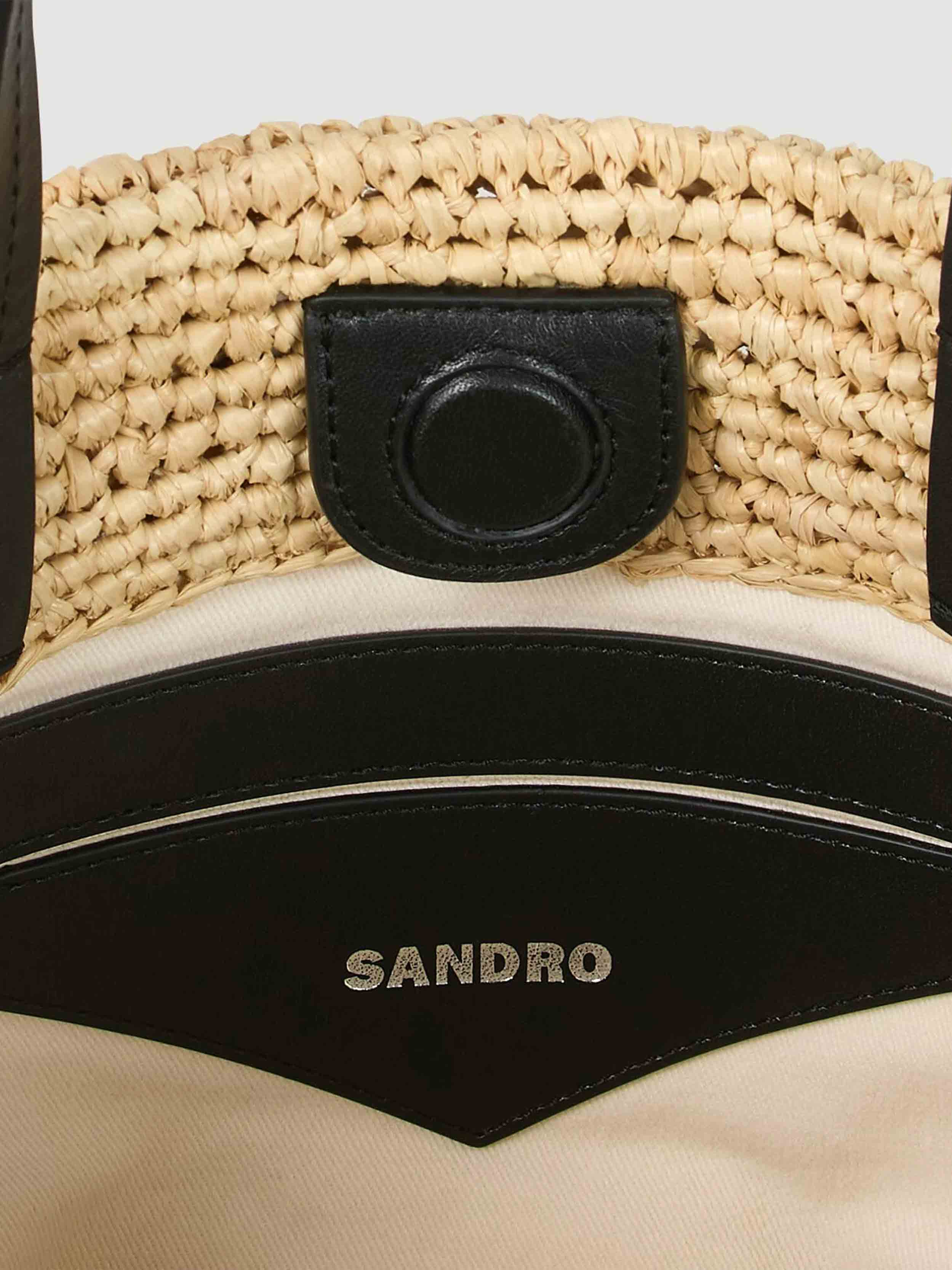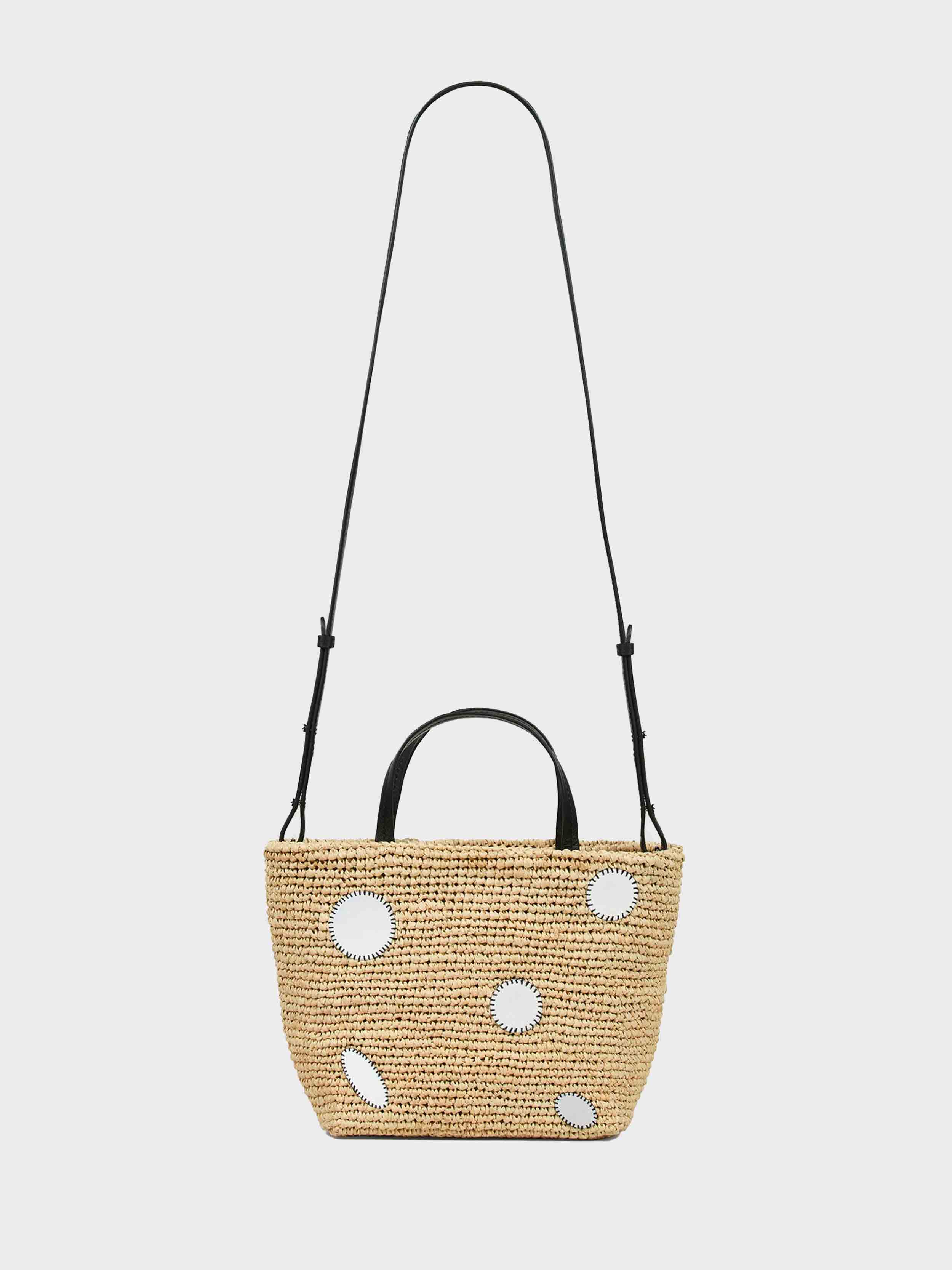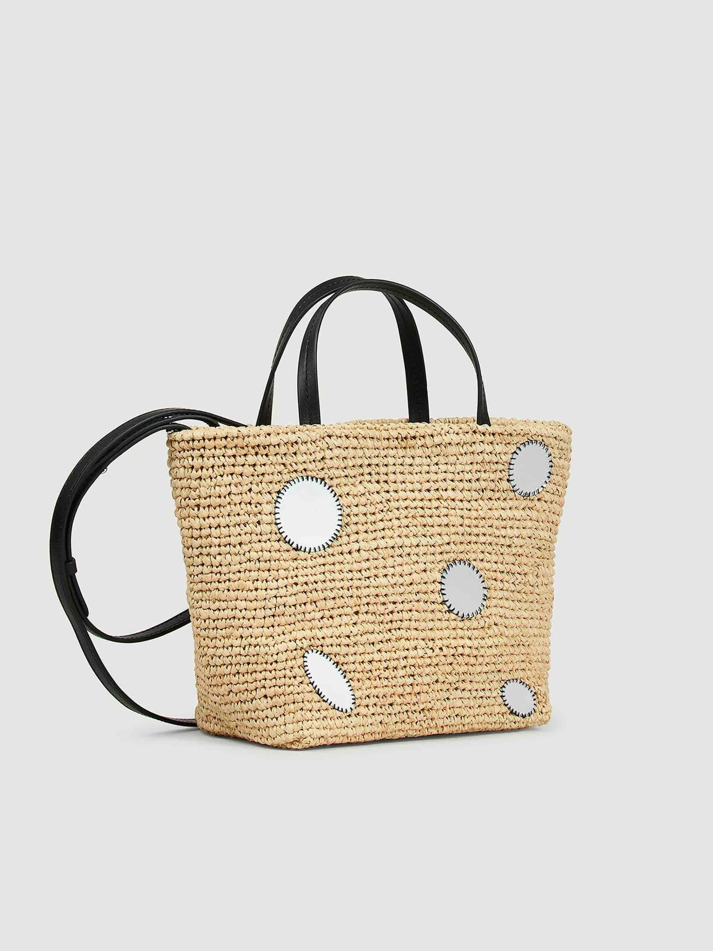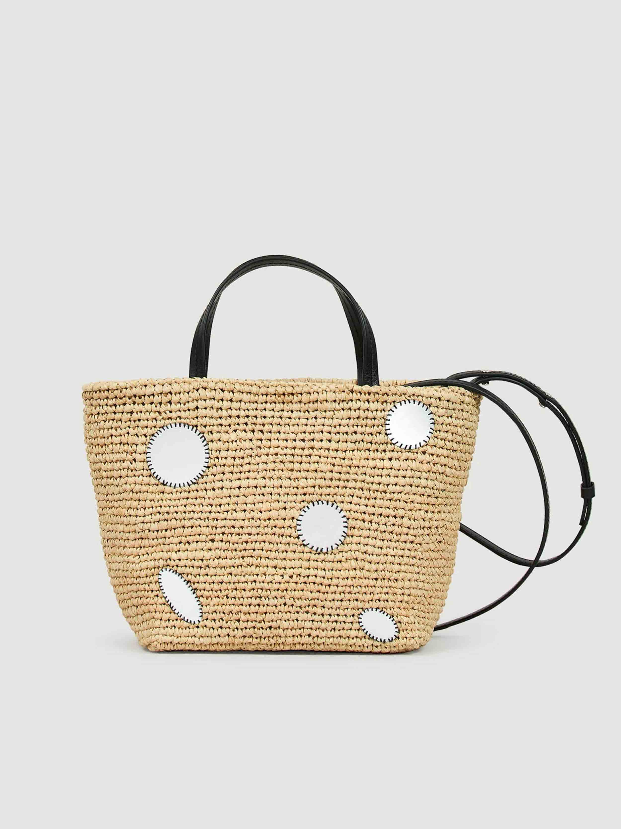 • Hand-woven raffia basket bag with small handles, an adjustable shoulder strap and with round embroidered mirrors.