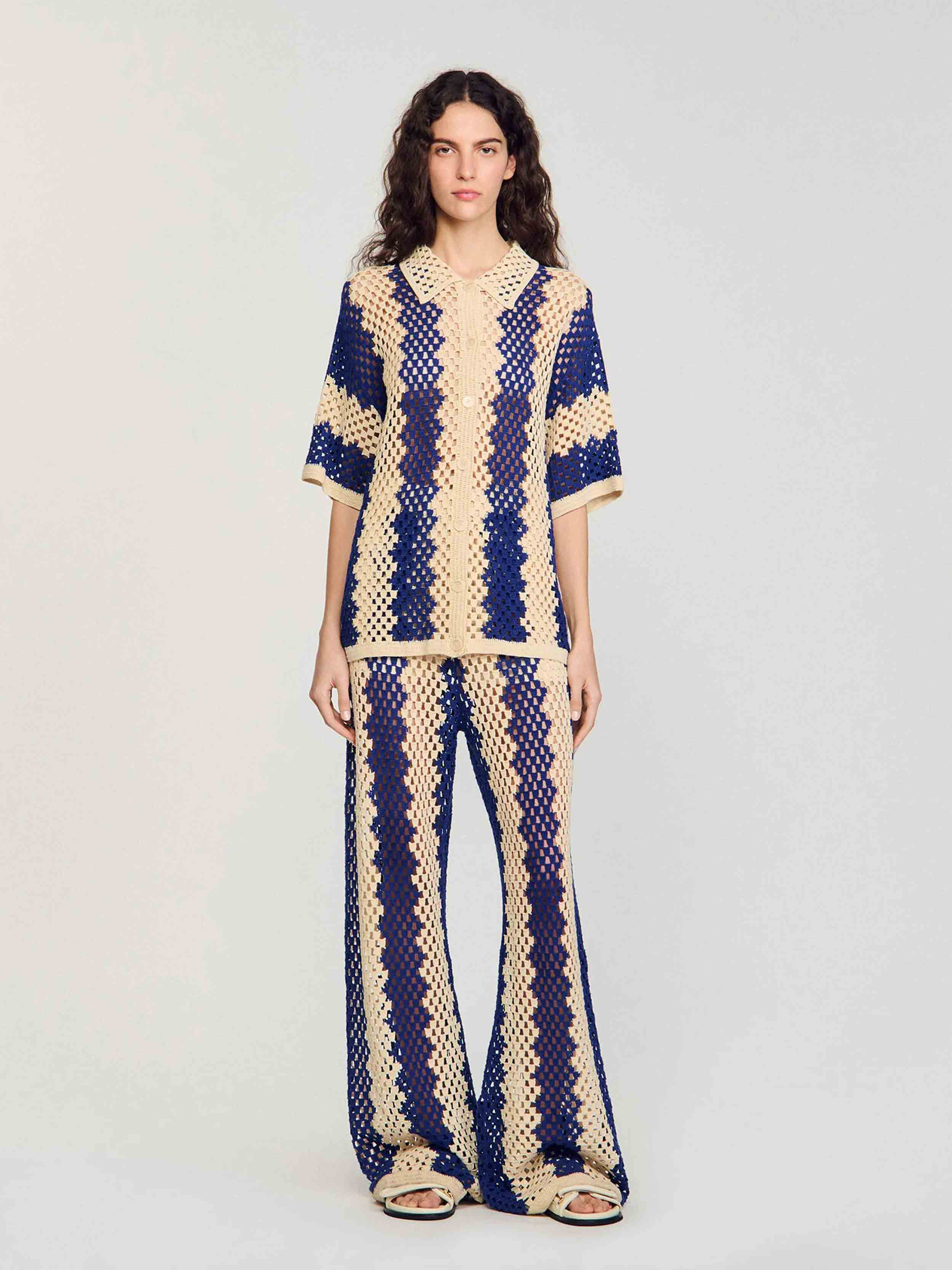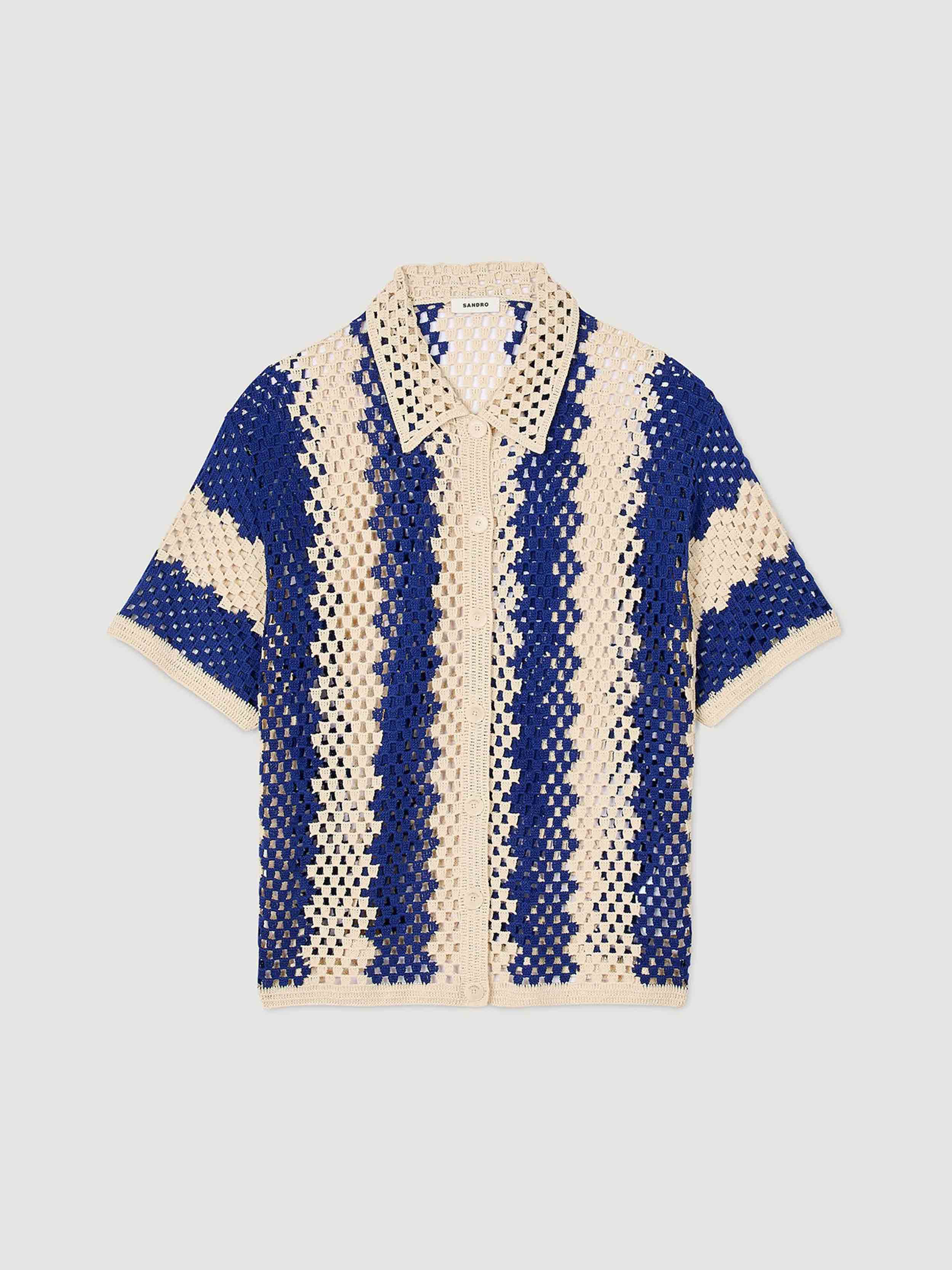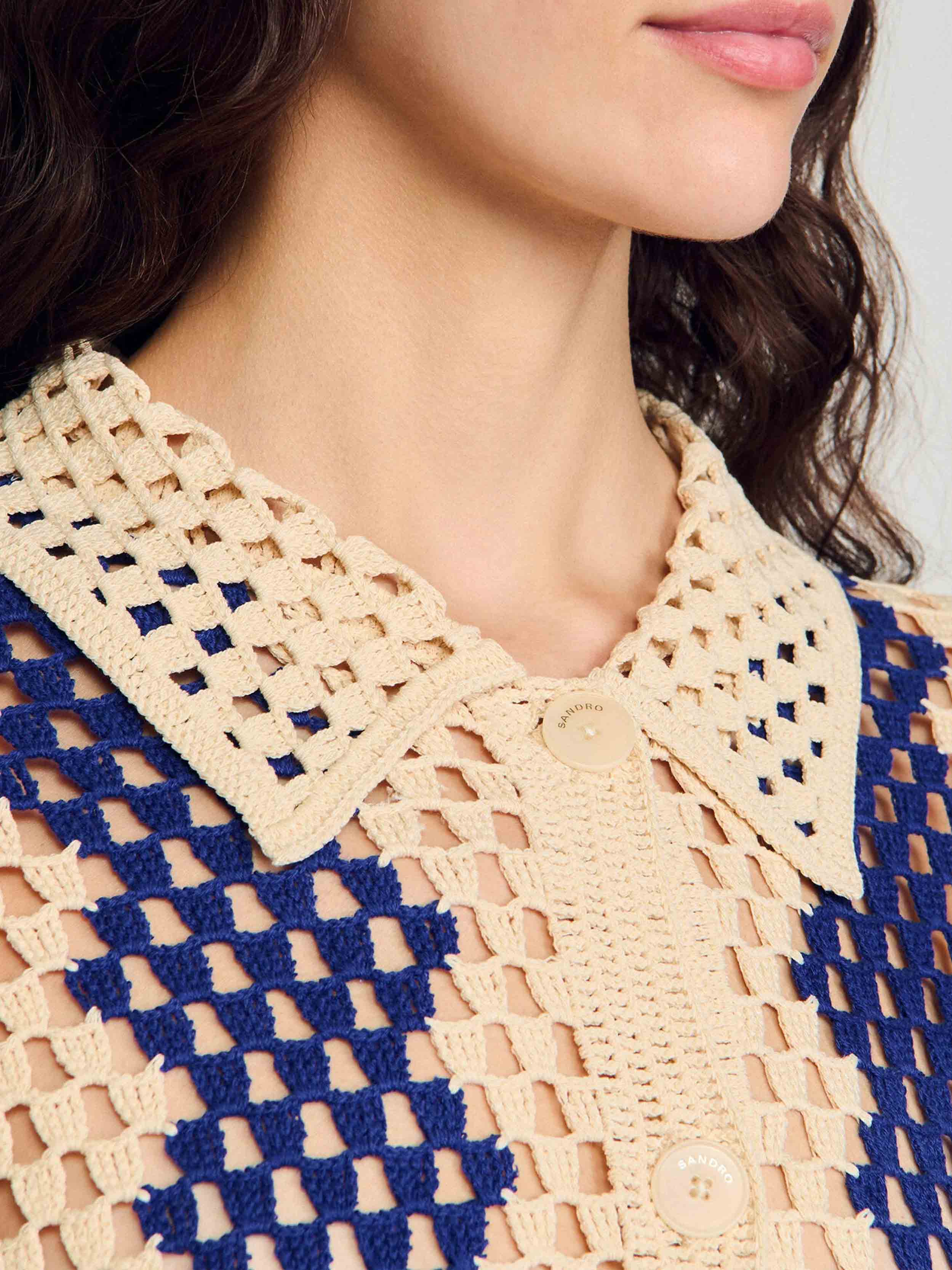 • Cardigan in openwork knit with contrasting pattern, featuring a shirt collar, short sleeves, and a button placket.