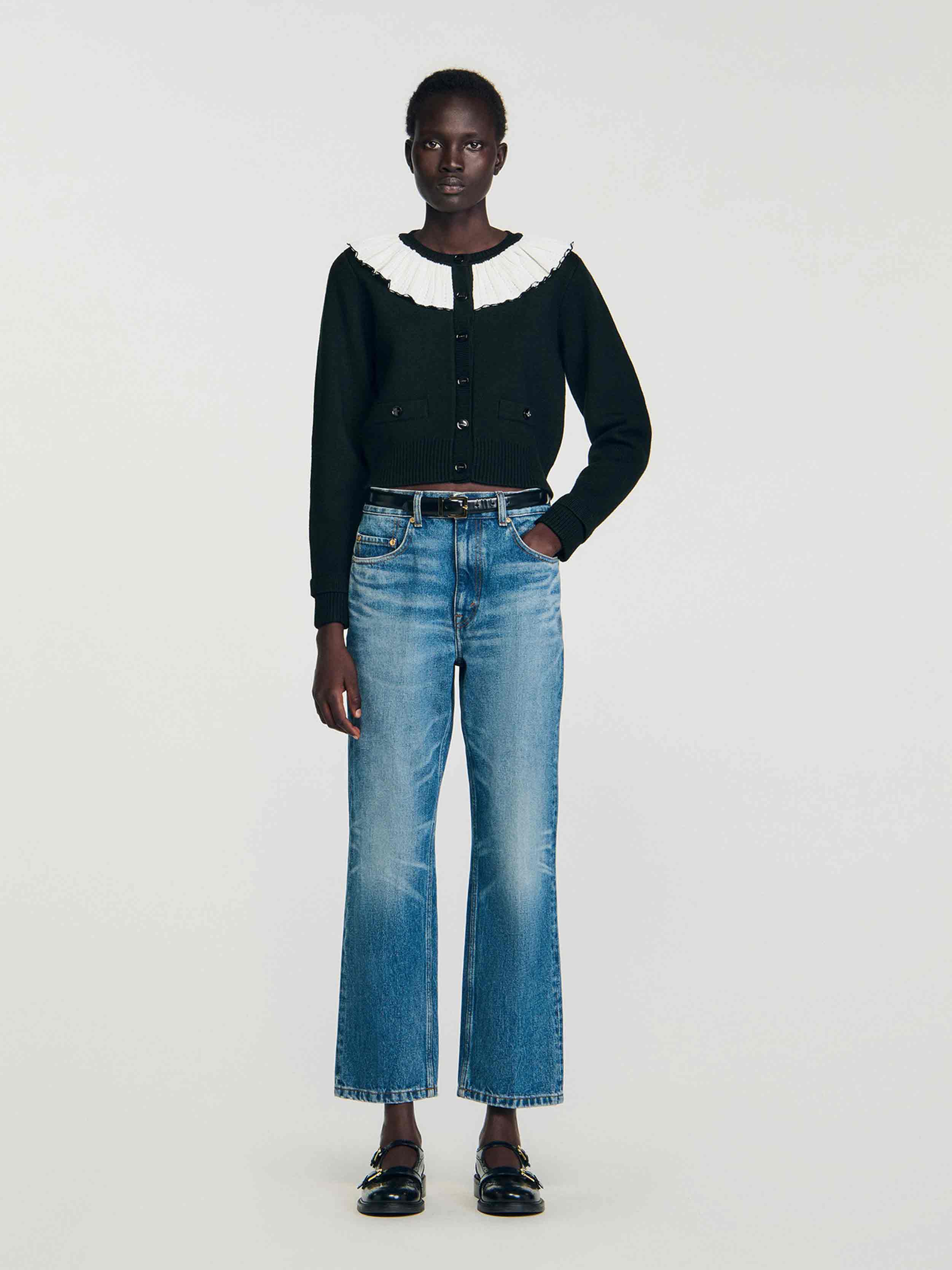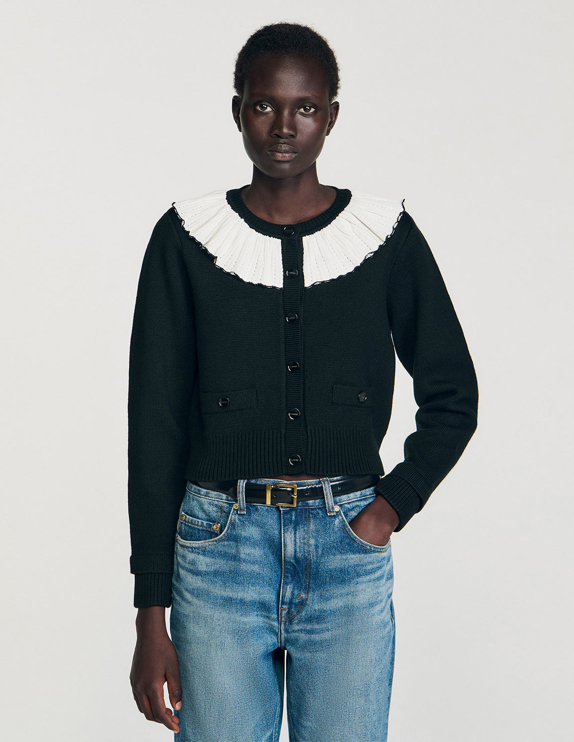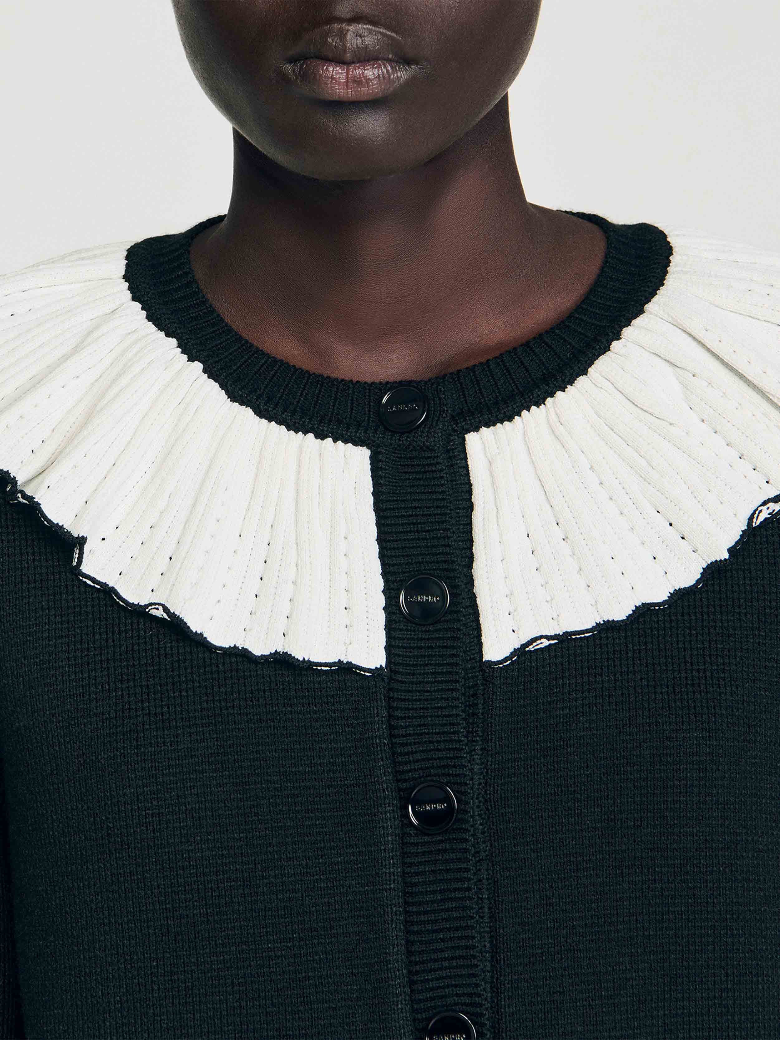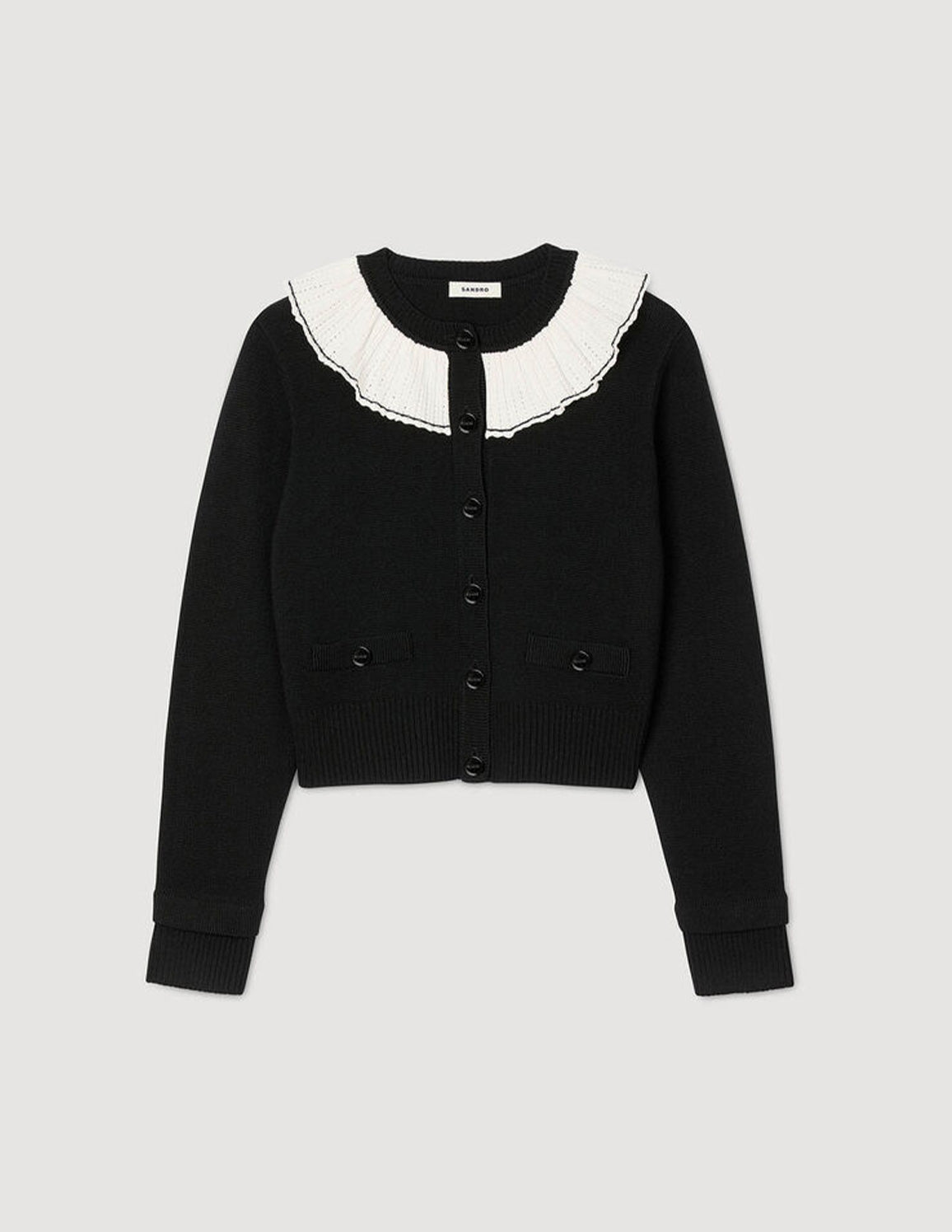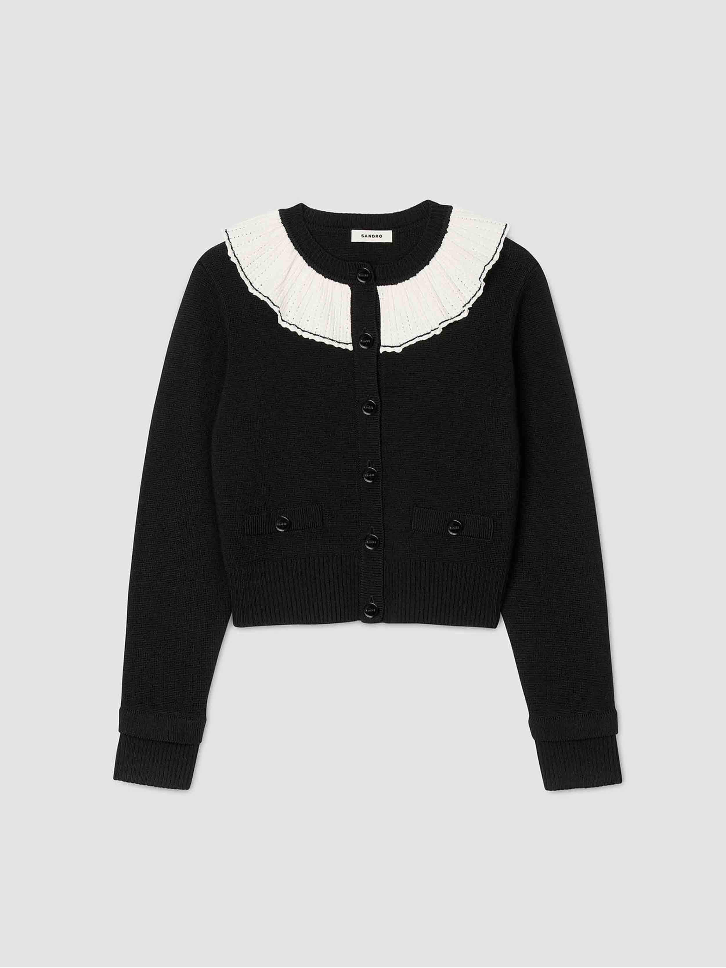 • Wool cardigan with a contrasting ruffled collar, button fastening, long sleeves and decorative piped pockets.