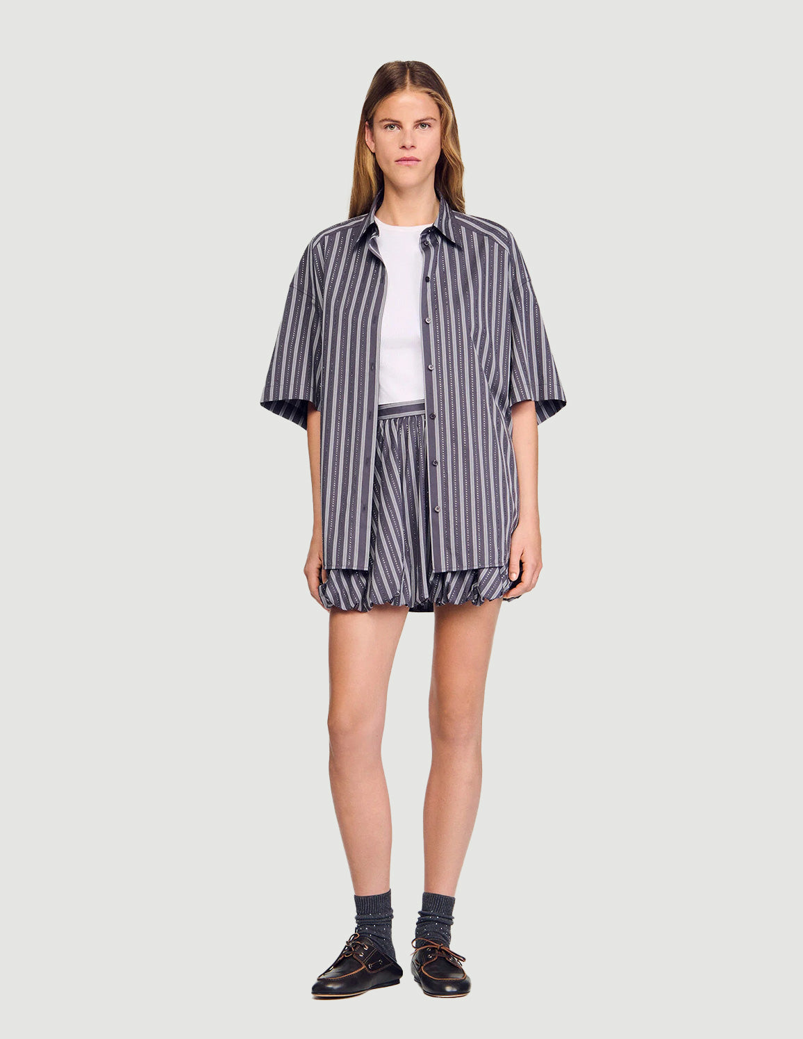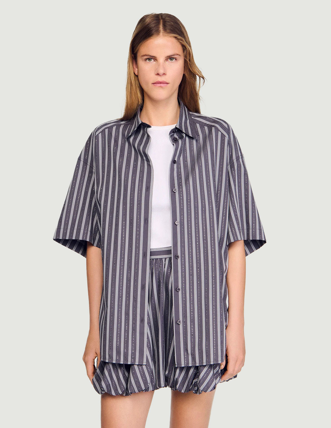 • Oversized striped shirt with rhinestone stripes, featuring a shirt collar, short sleeves and a button fastening at the front.