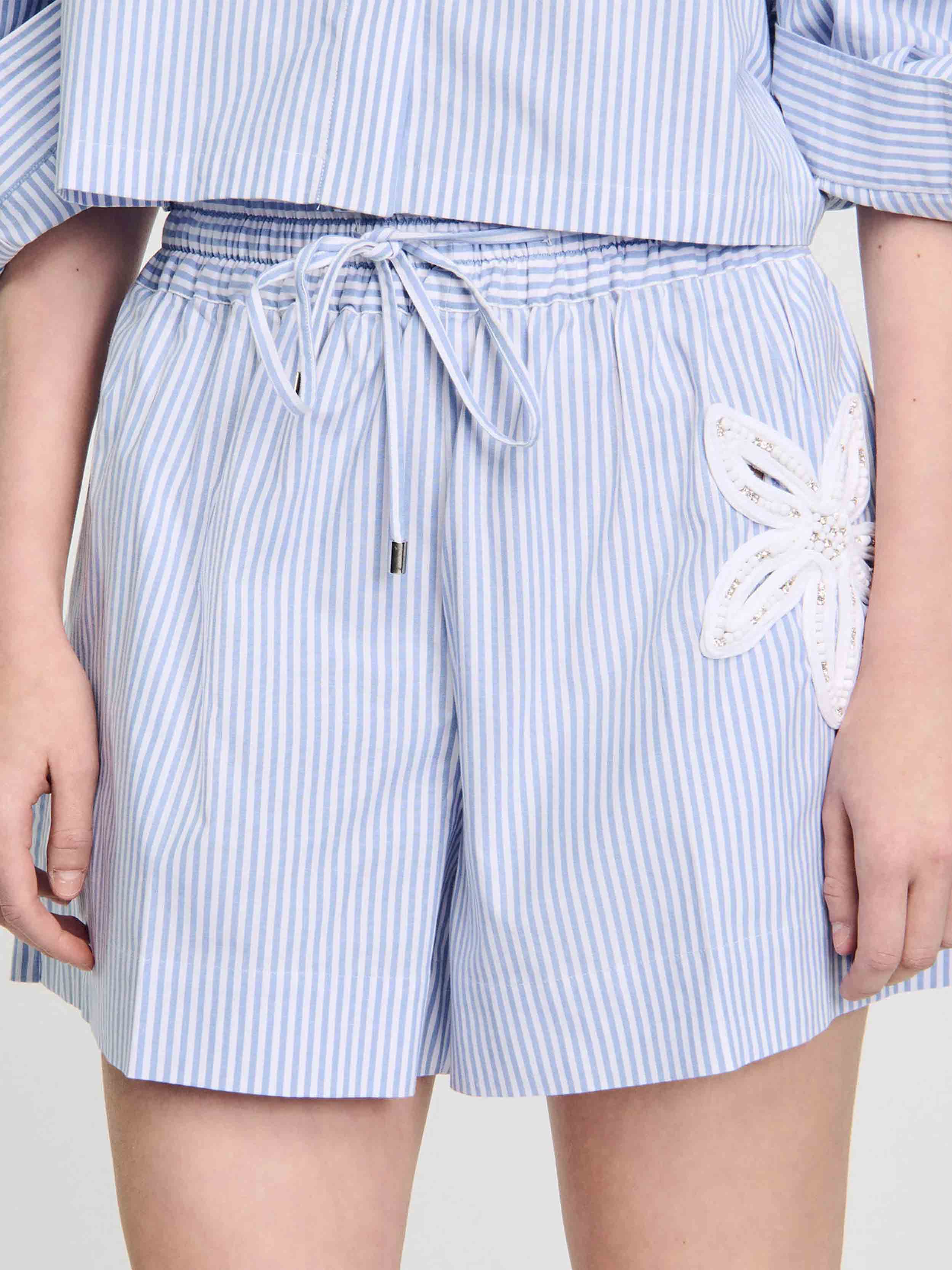 • Striped shorts with elasticated tie waist and embroidered beaded and rhinestone flowers.