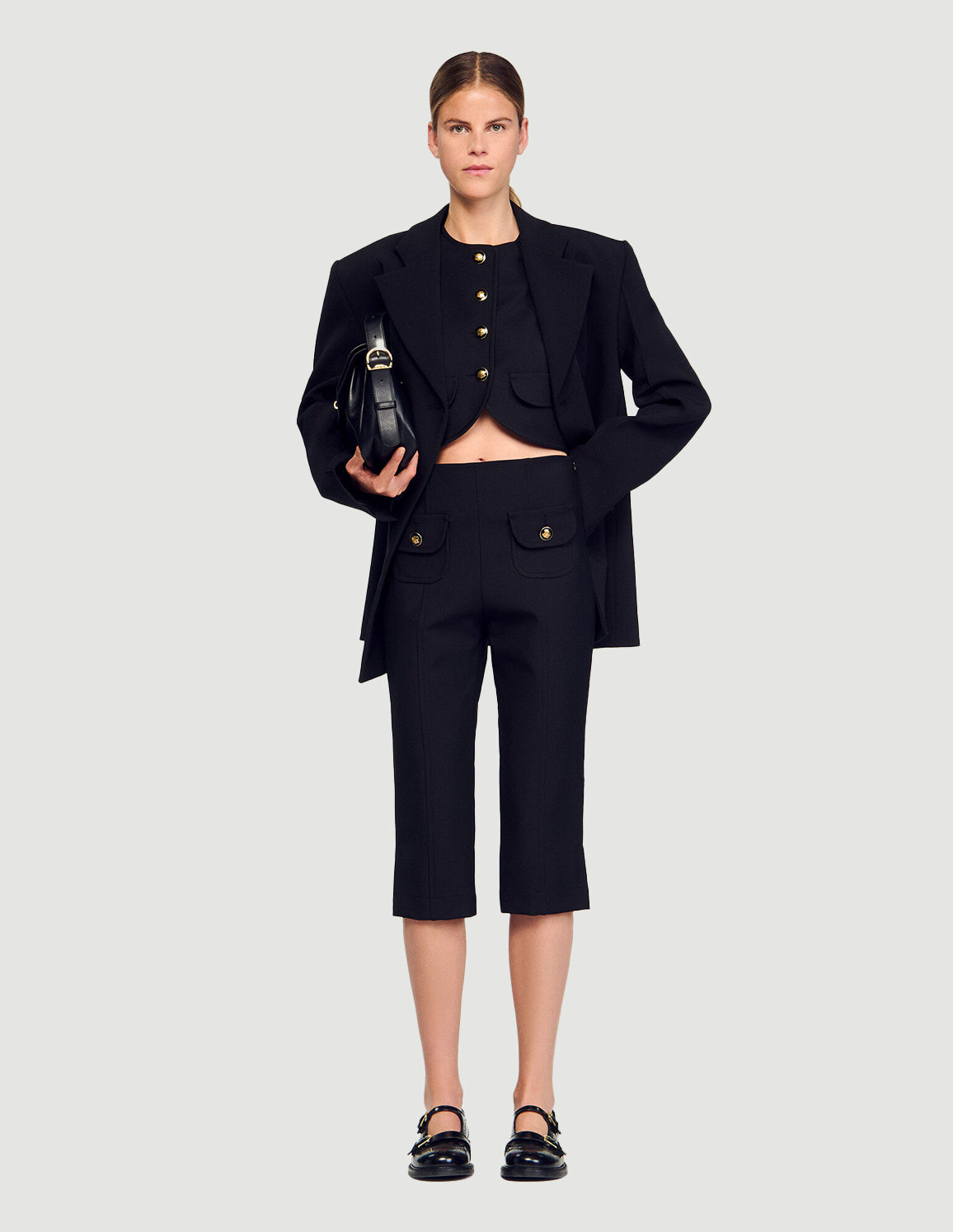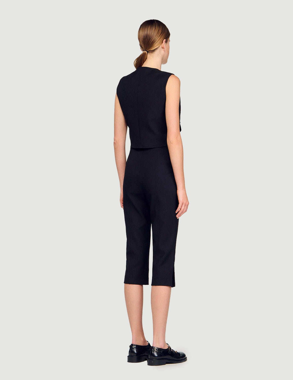 • Sleeveless fine knit crop top with a button fastening at the front, round neck, flap patch pockets and a rounded hem at the front.