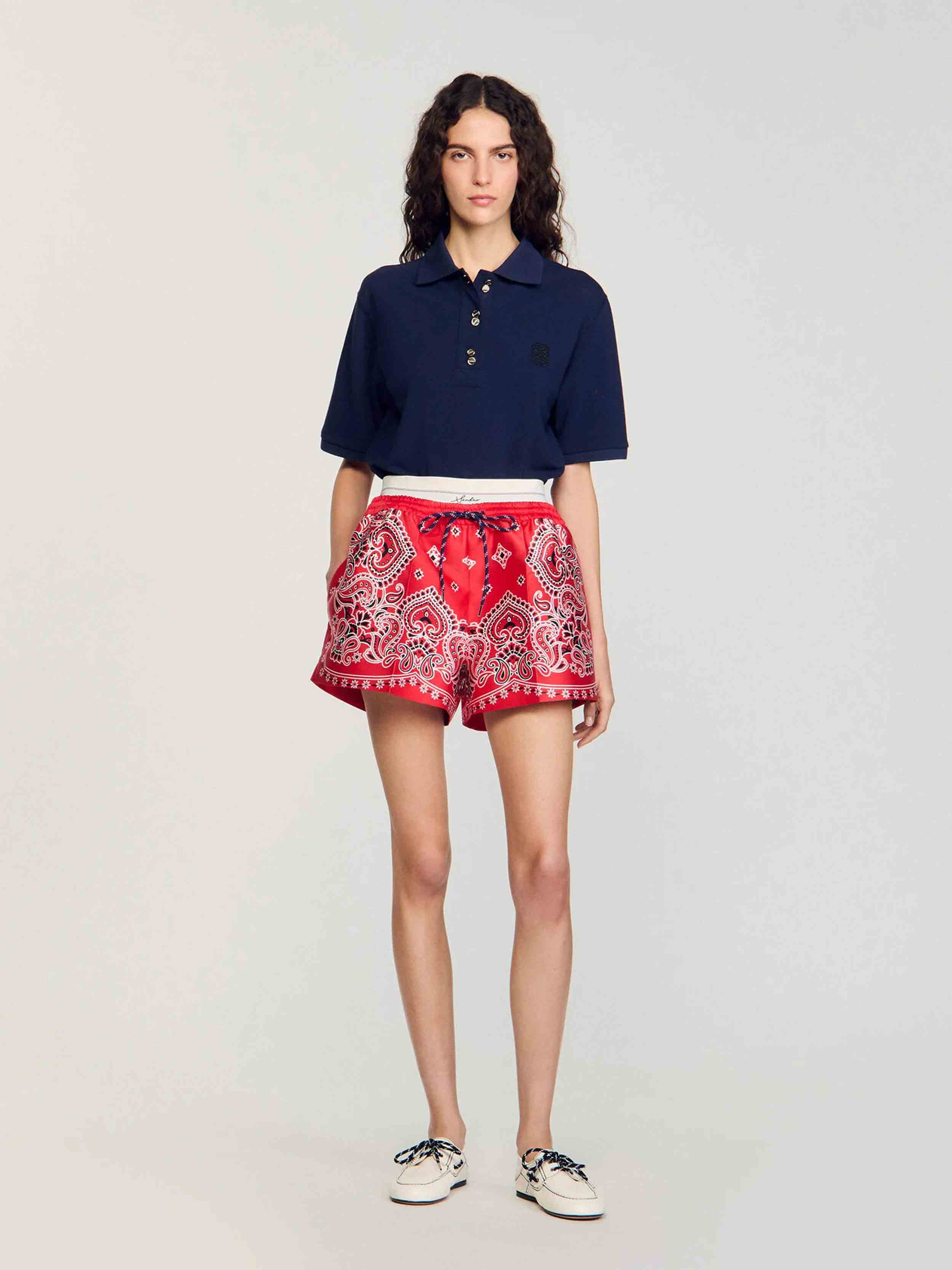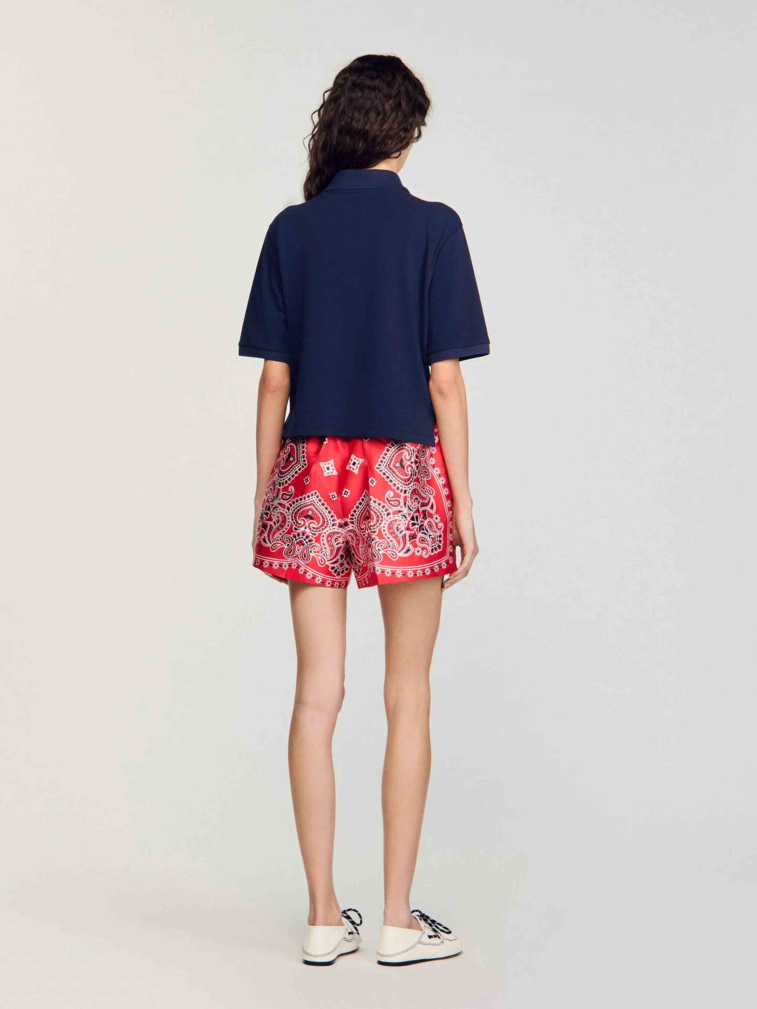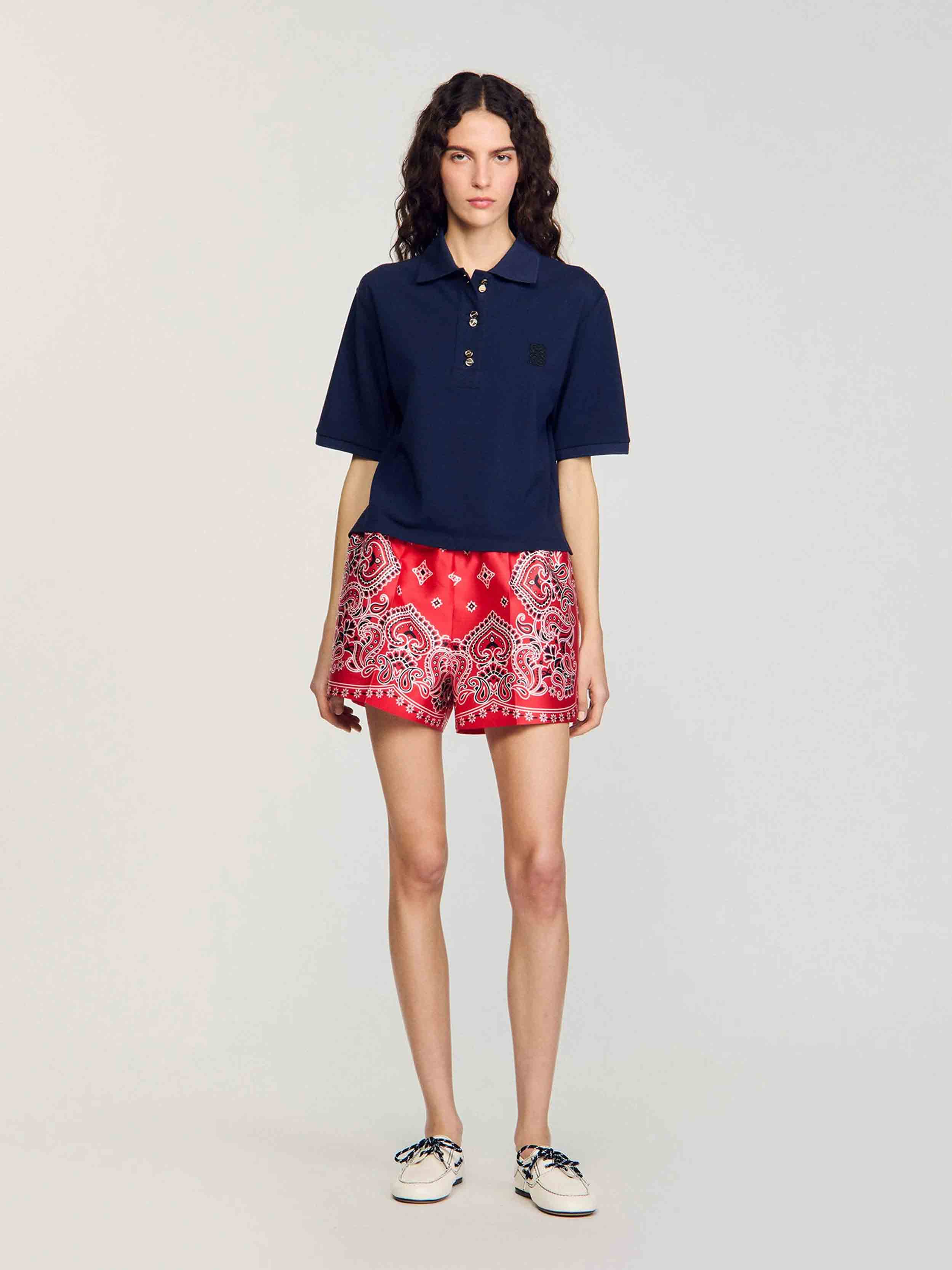 • Short-sleeved polo shirt with decorative buttons on the collar and embroidery on the chest.