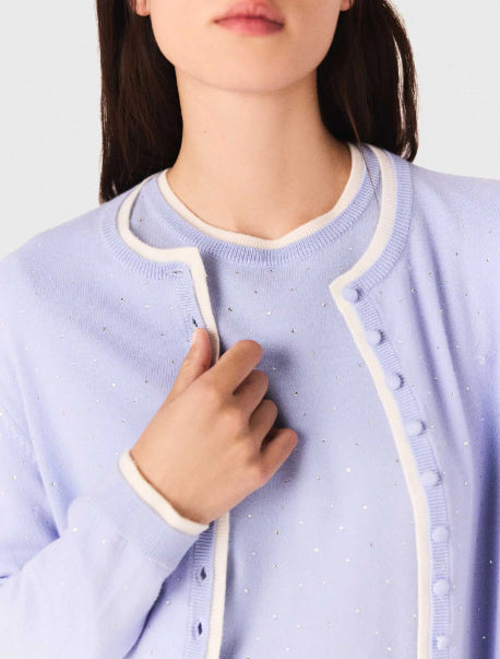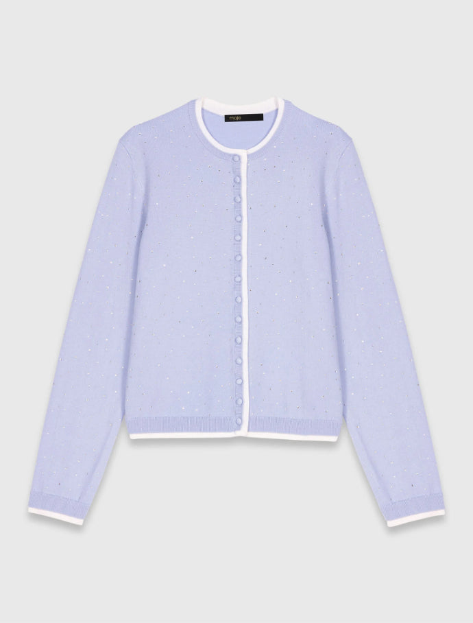 • This 100% wool knit cardigan embellished with rhinestones stands out as a key piece of the collection. Its round neck and long sleeves offer comfort and softness, while the contrasting 2-in-1 effect hem adds a sophisticated touch. This piece, both chic and casual, ideal for everyday wear, features a covered button fastening and can be worn as a complete look with the matching jumper to create a twin-set. Add skirt and signature accessories to complete the look.