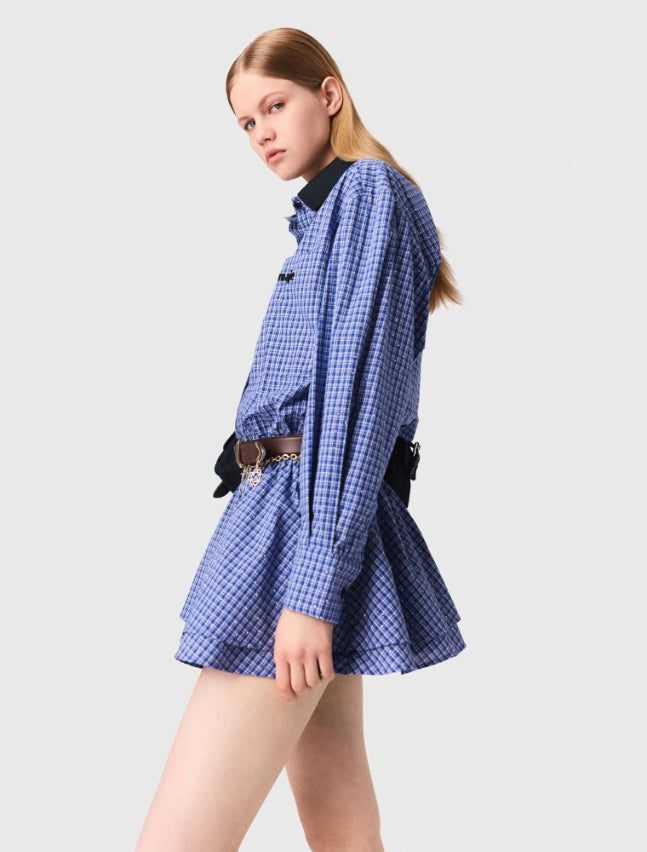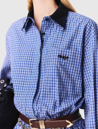 • This dress-style playsuit in stretch cotton features a check print with sparkling rhinestones and a patch pocket on the chest with raised Maje embroidery. It has a removable contrast double collar and long sleeves with buttoned cuffs.