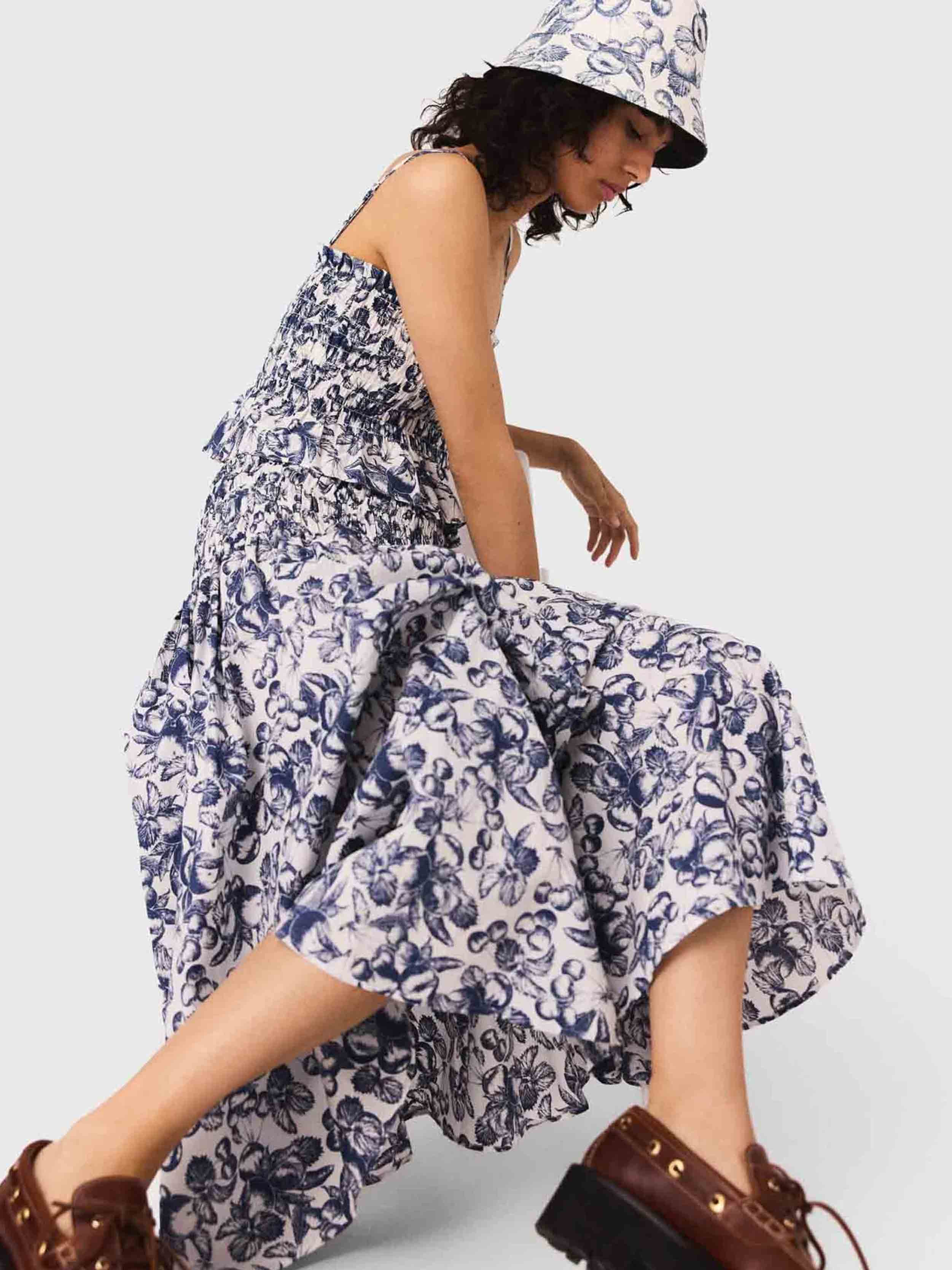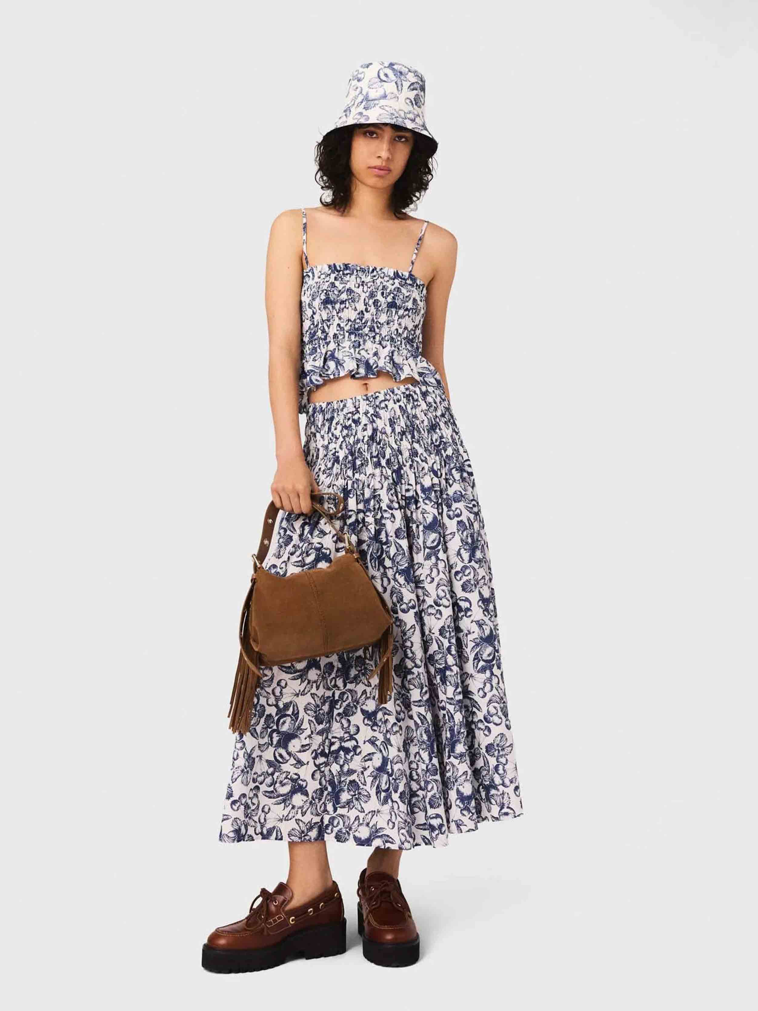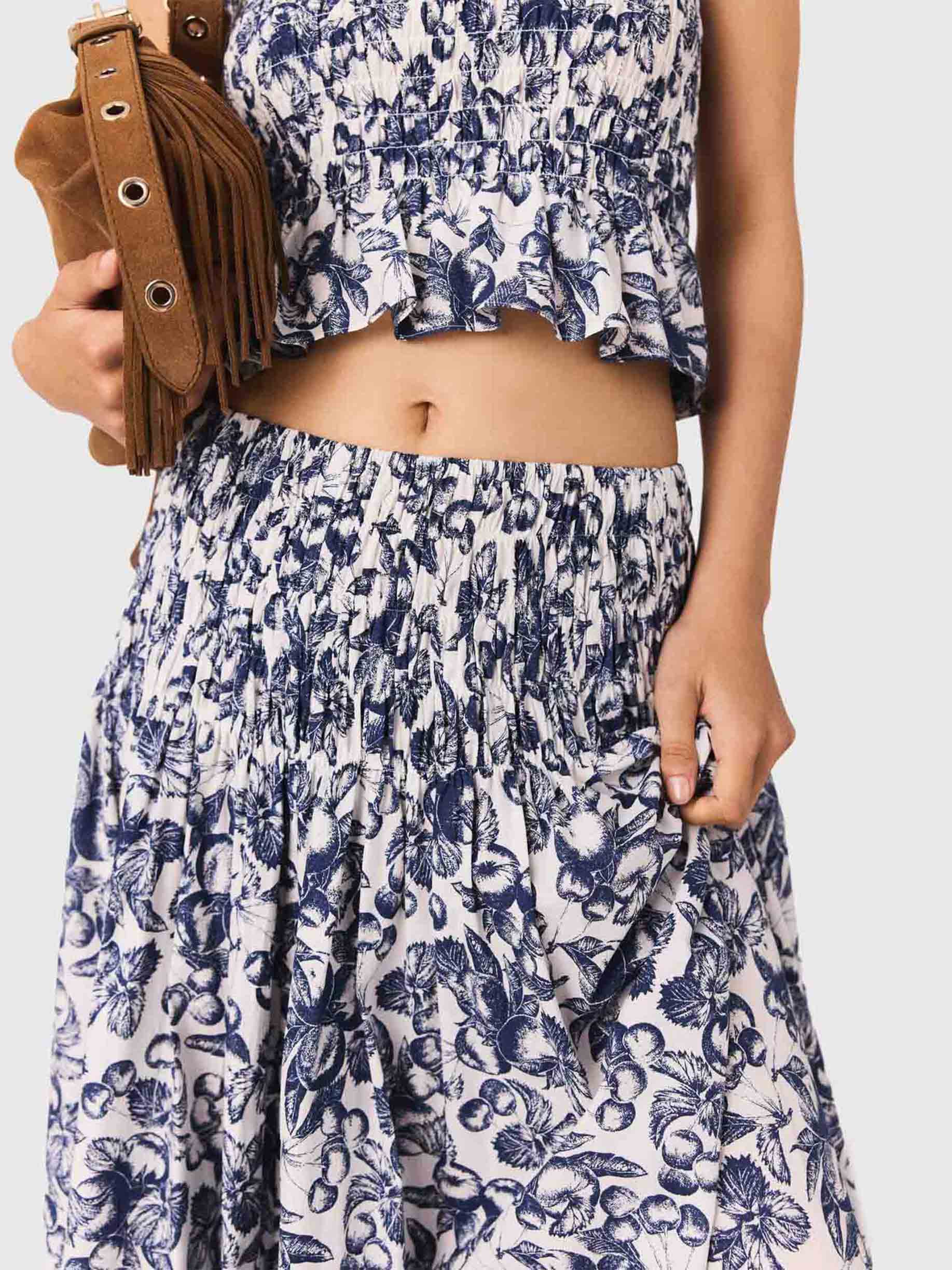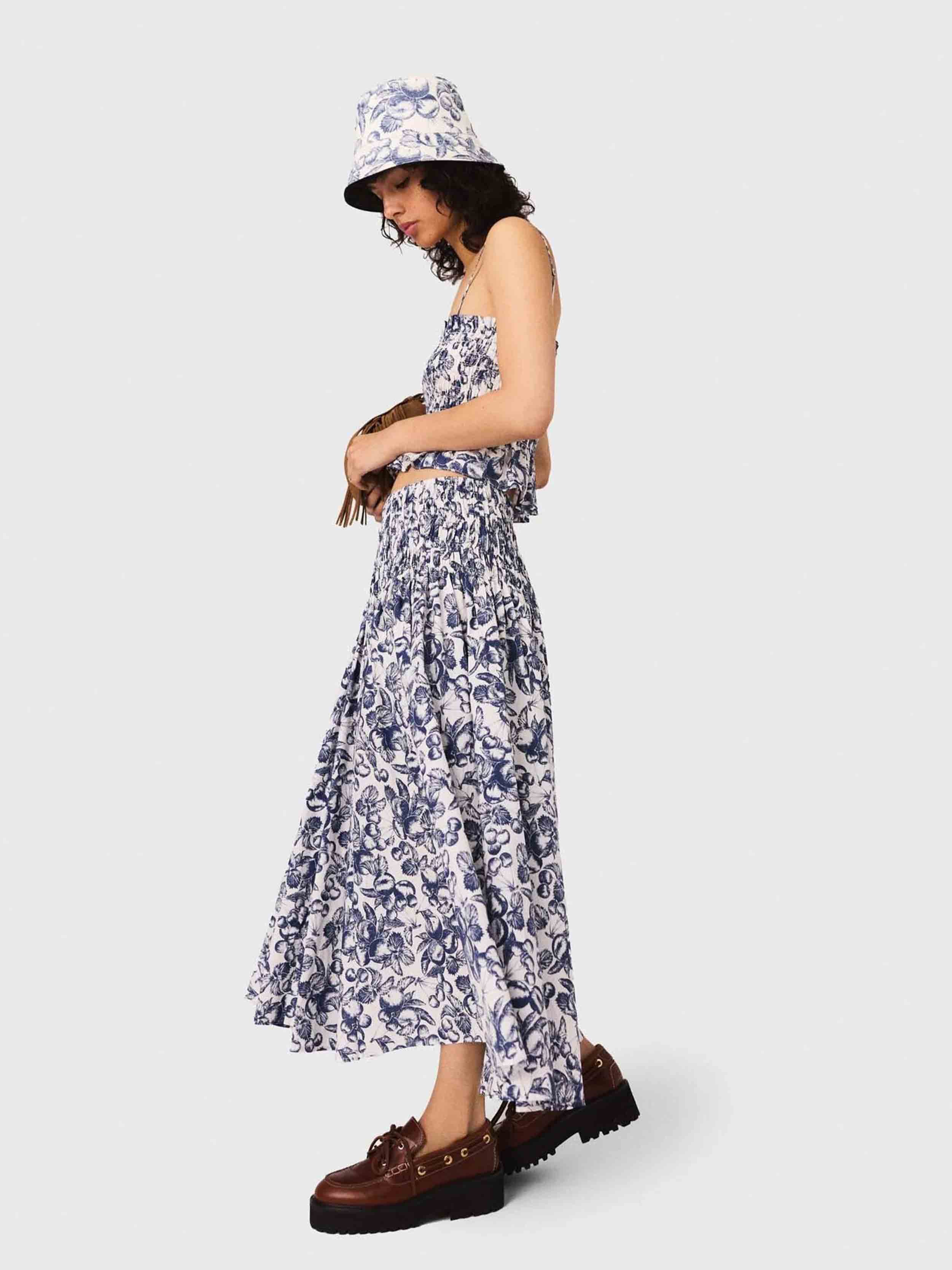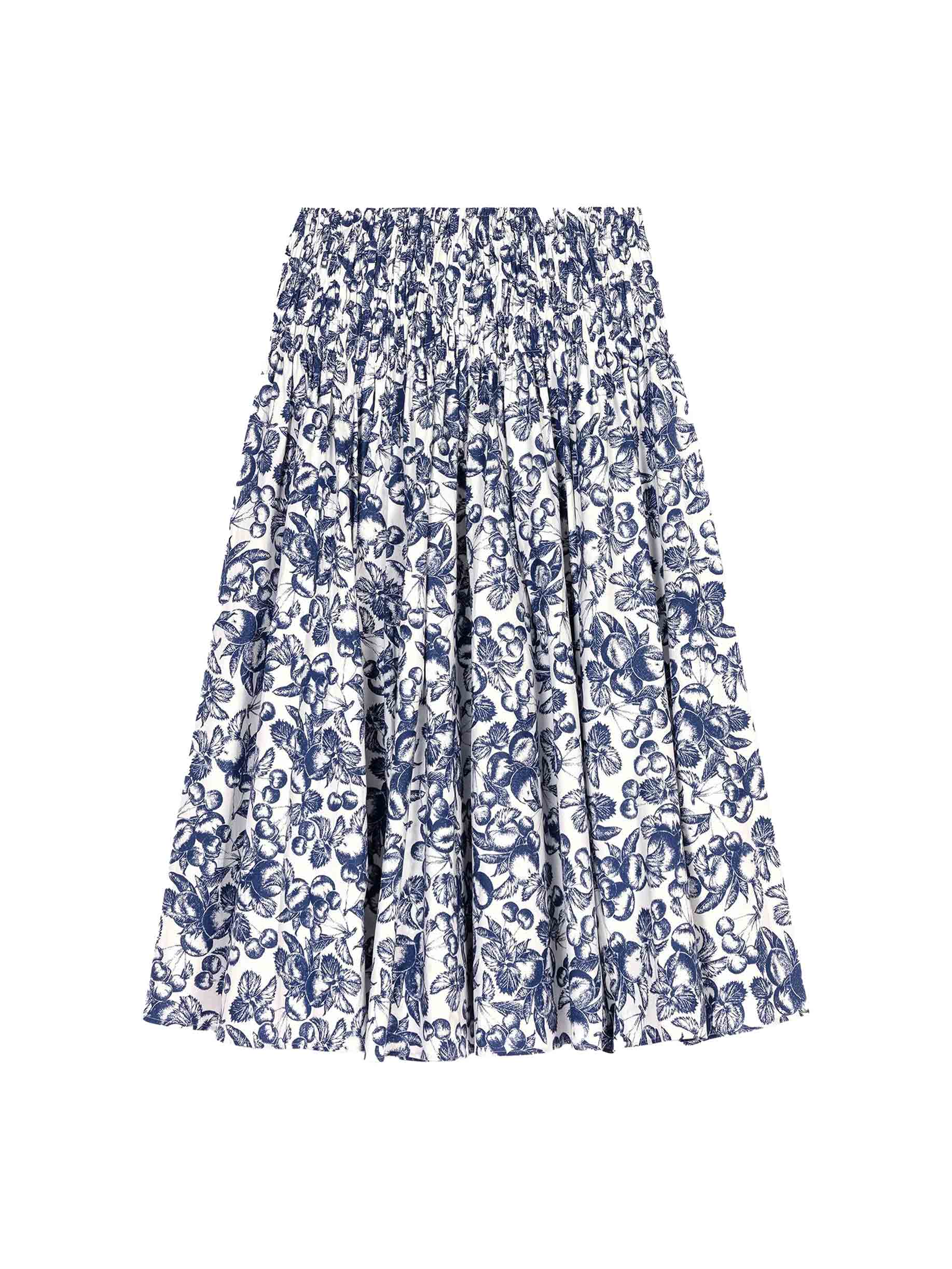 • This long skirt with a fruit print, the season's signature motif, stands out with its light and voluminous cut. Featuring an elasticated waist, it structures the silhouette in motion and reveals hand-smocked detailing.