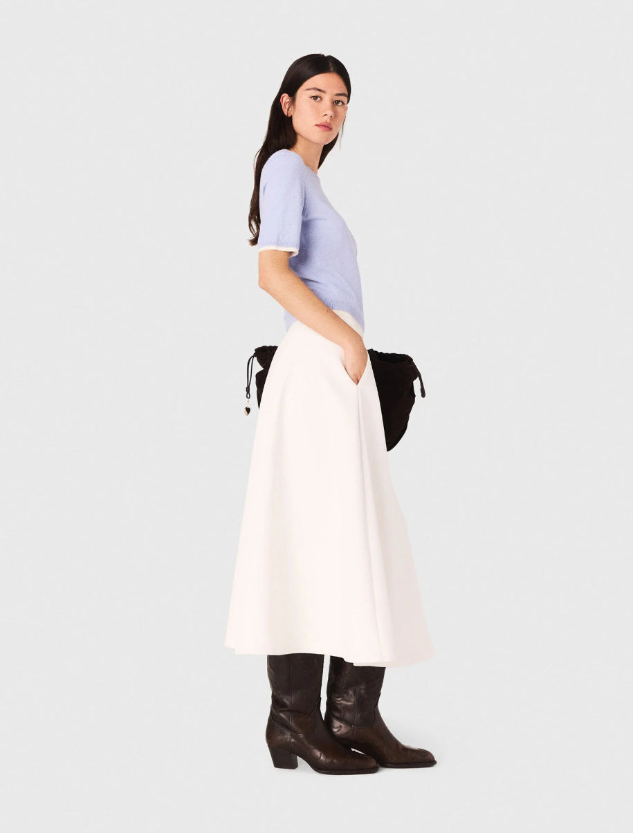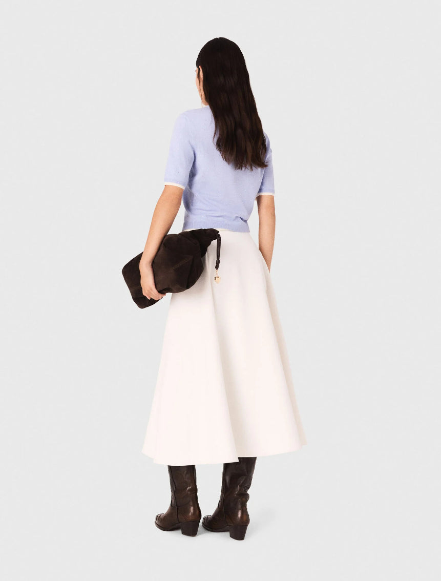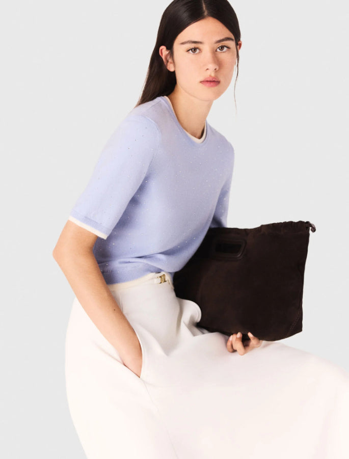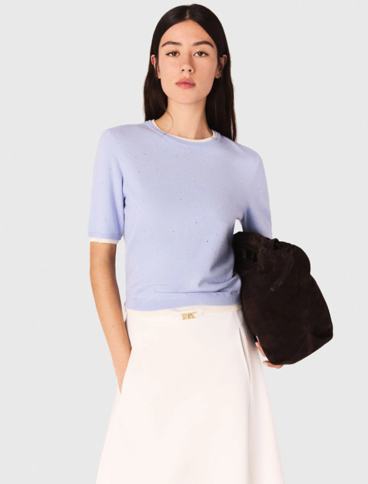 The collection adds a touch of sparkle to the wardrobe, combining absolute comfort with signature details.This wool jumper brightens the silhouette with its delicate rhinestones and 2-in-1 effect contrasting finishes. Featuring a round neck and short sleeves, it can be worn under the matching cardigan for a twin set look.Add a gently flared skirt and a signature bag to complete the look.