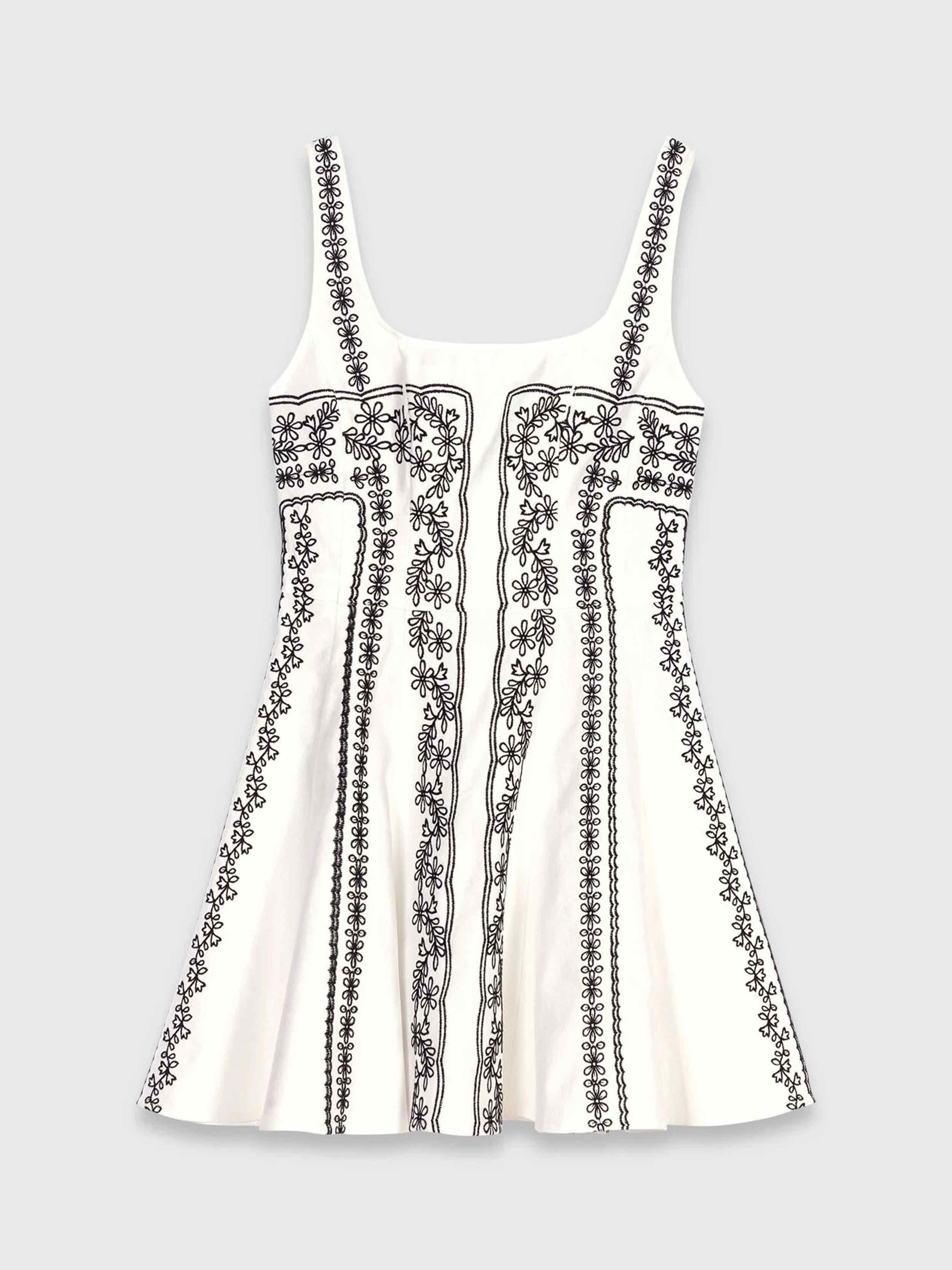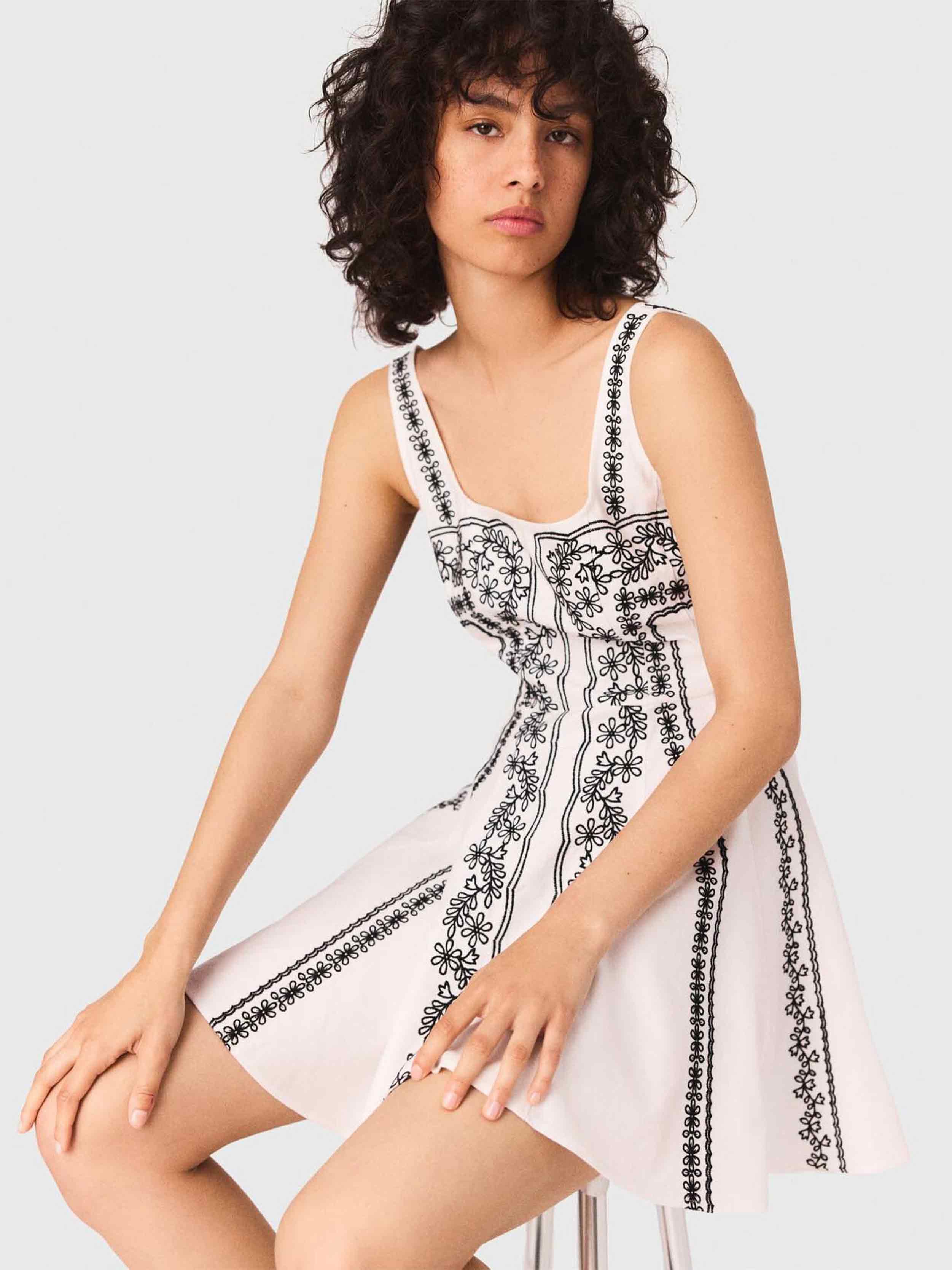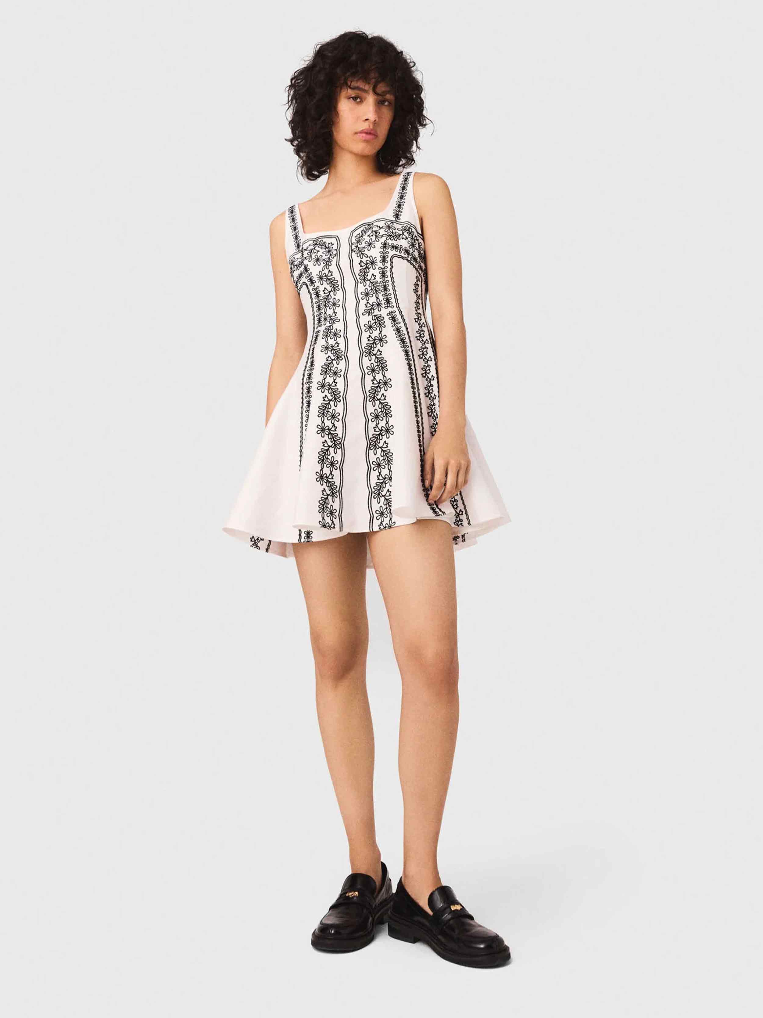 • This short linen dress showcases delicate contrasting floral embroidery, with panels hand-assembled. Its square neckline with straps frames the silhouette, while the flared skirt offers plenty of lightness. A summer piece to count in your wardrobe.
