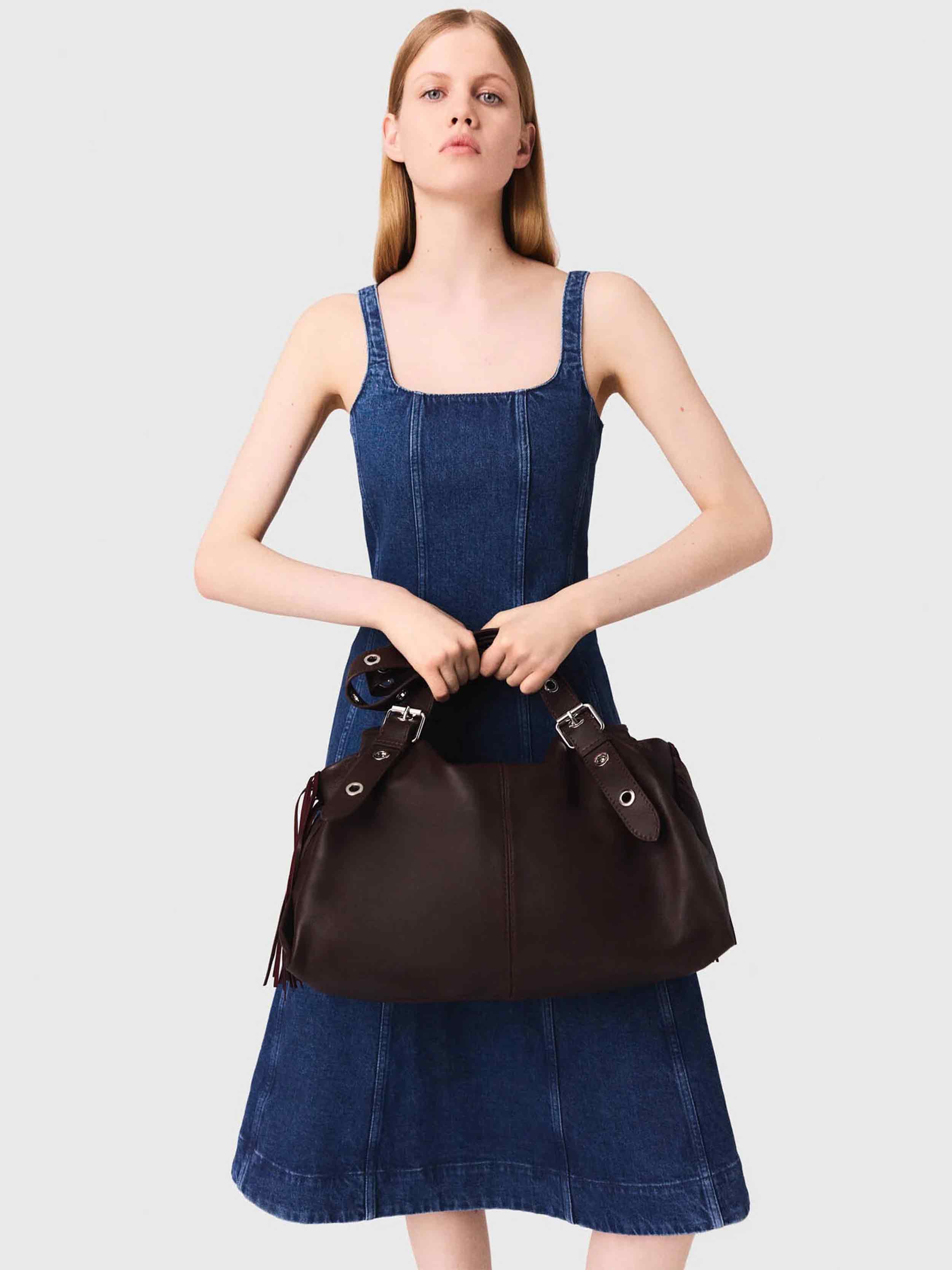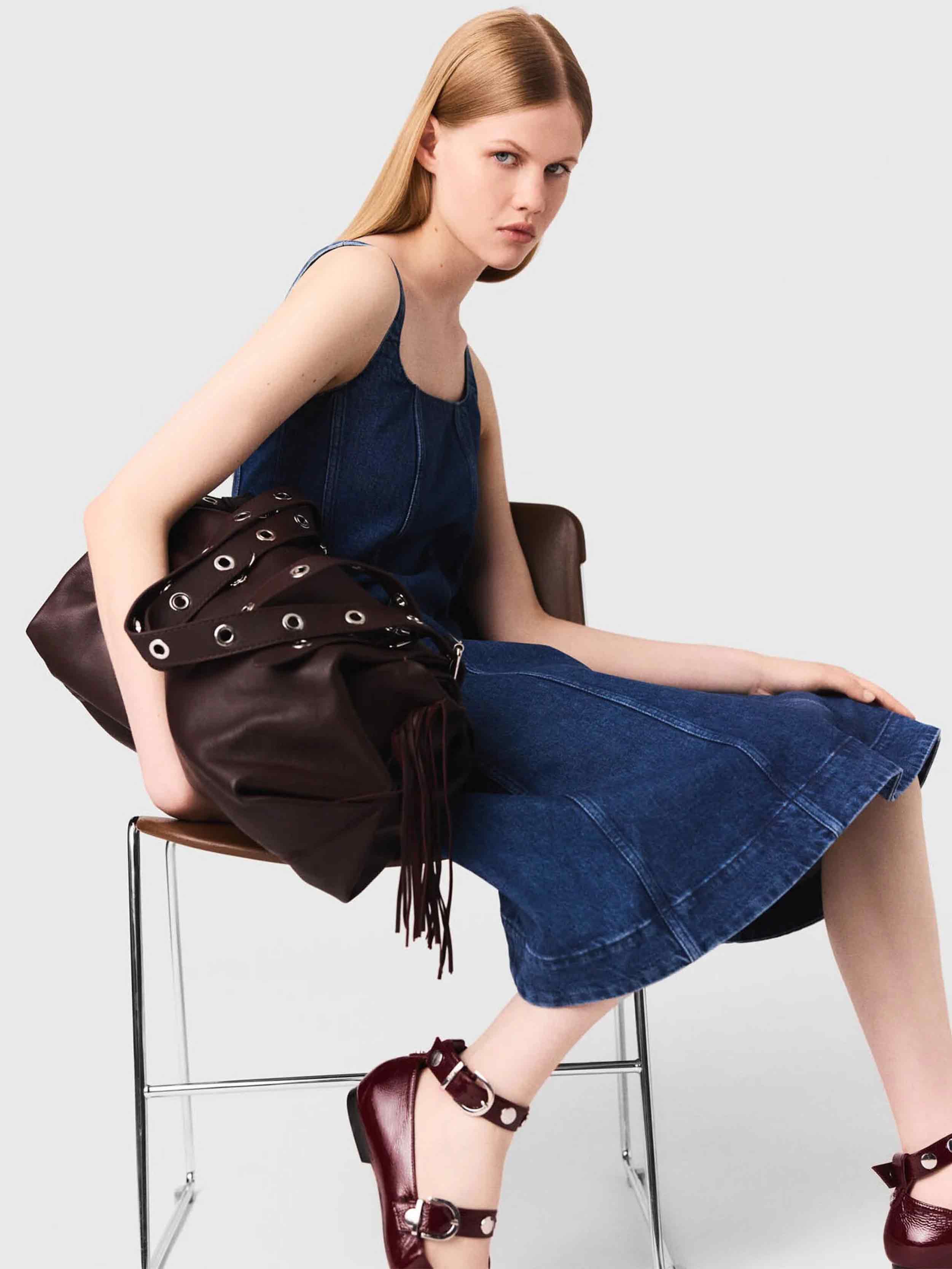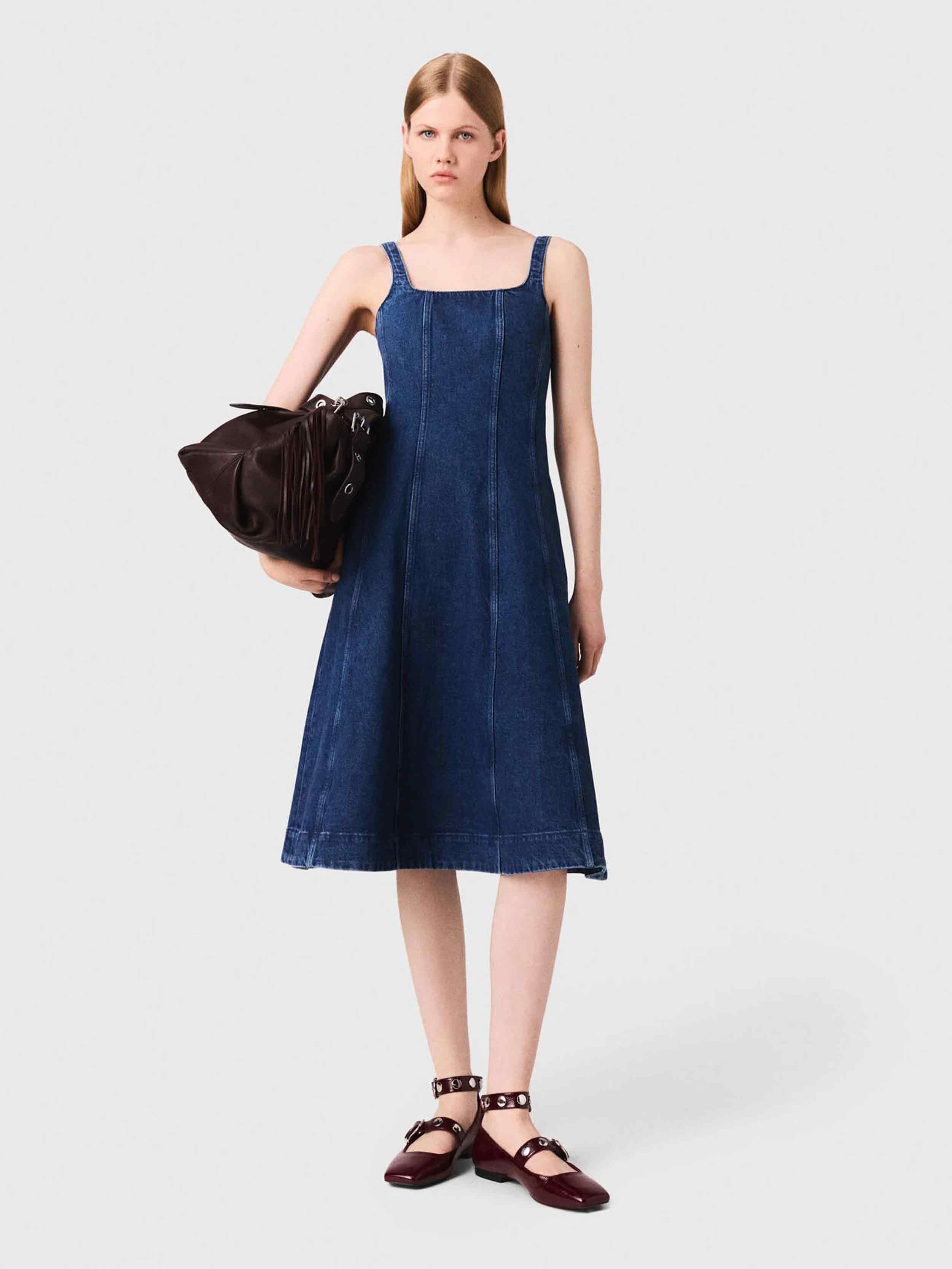 • A major trend this season, denim makes a comeback with this long dress, combining style and femininity. With its flared cut, it creates a silhouette that is both trendy and structured. Featuring a round neckline and straps, it reveals pockets and a back fastening.