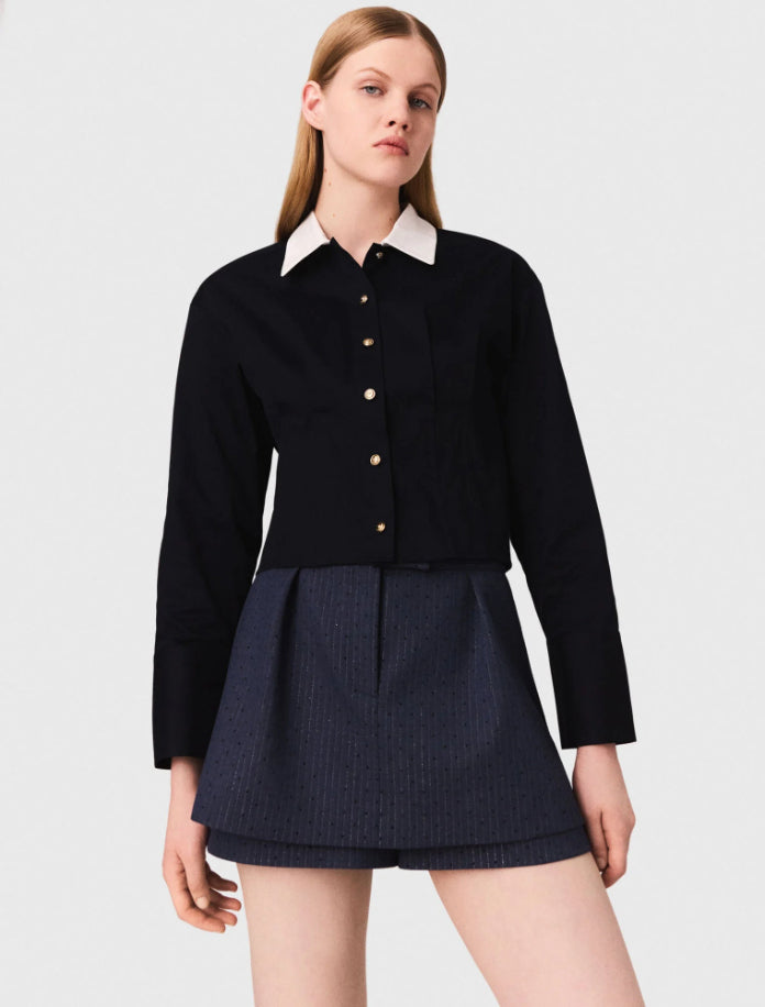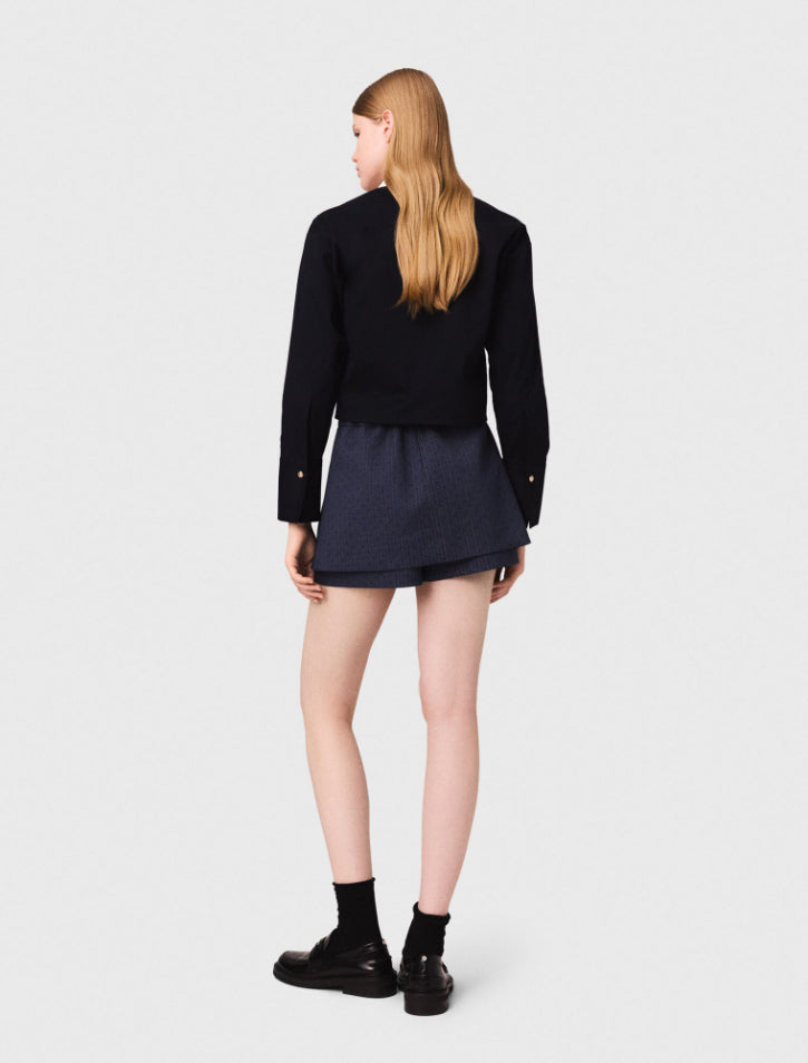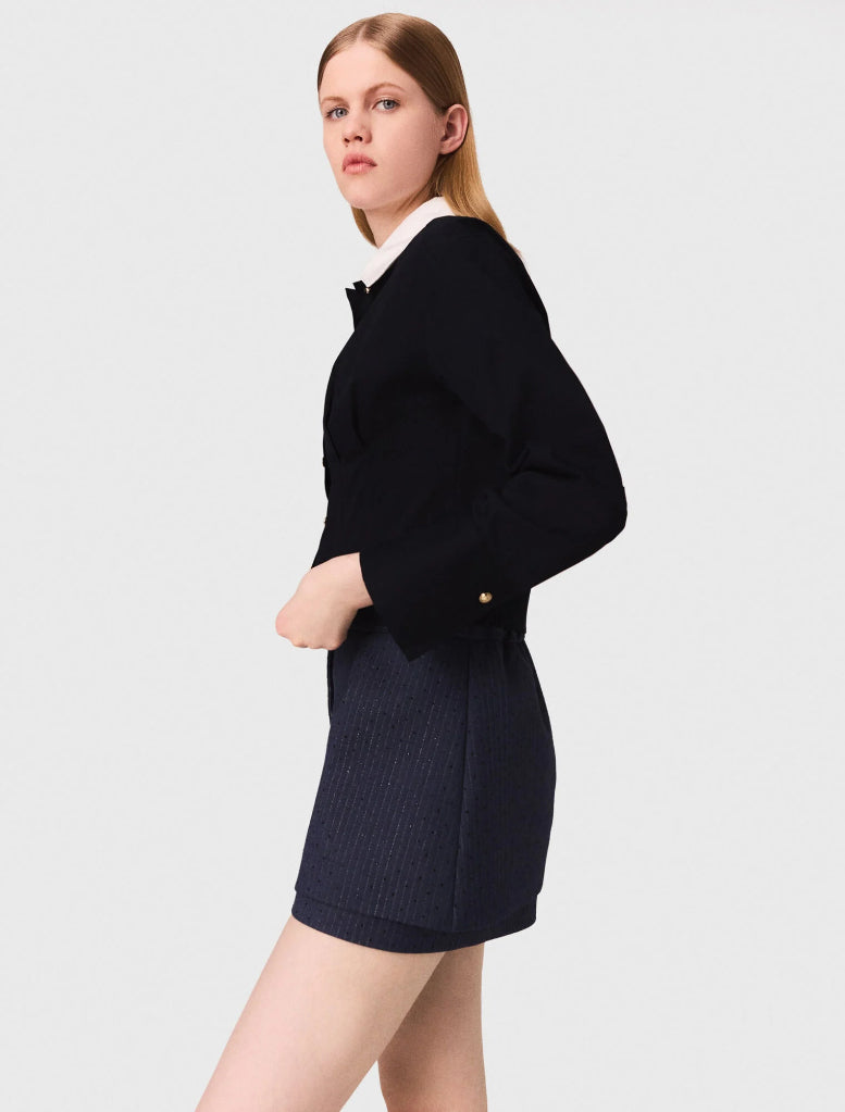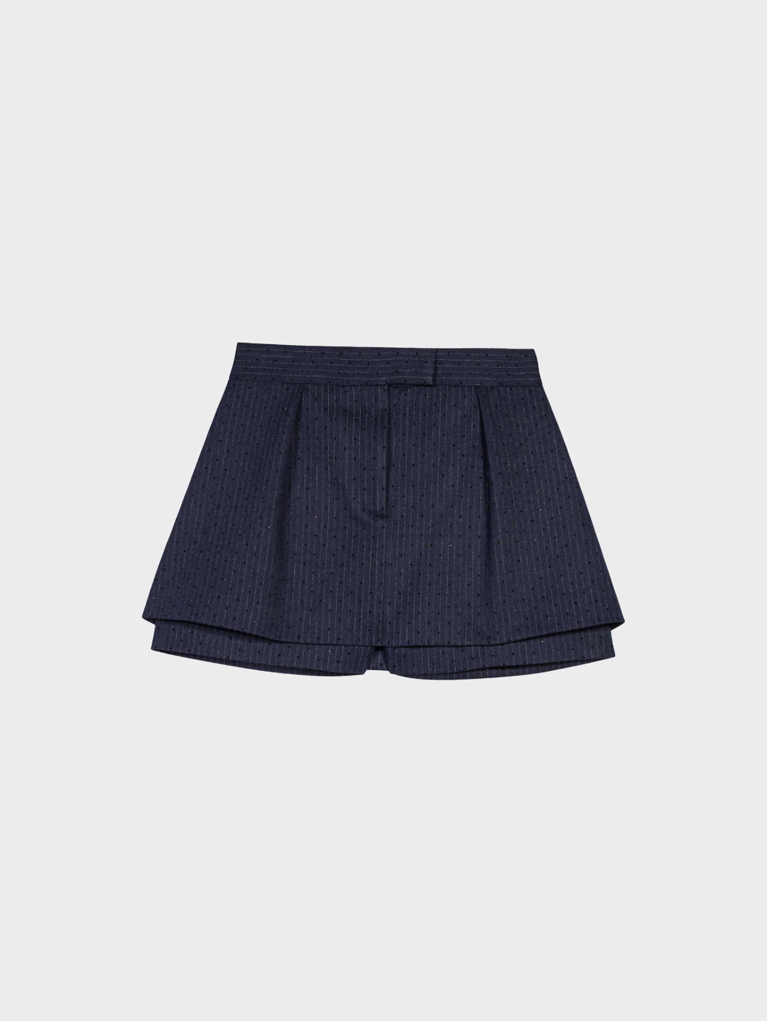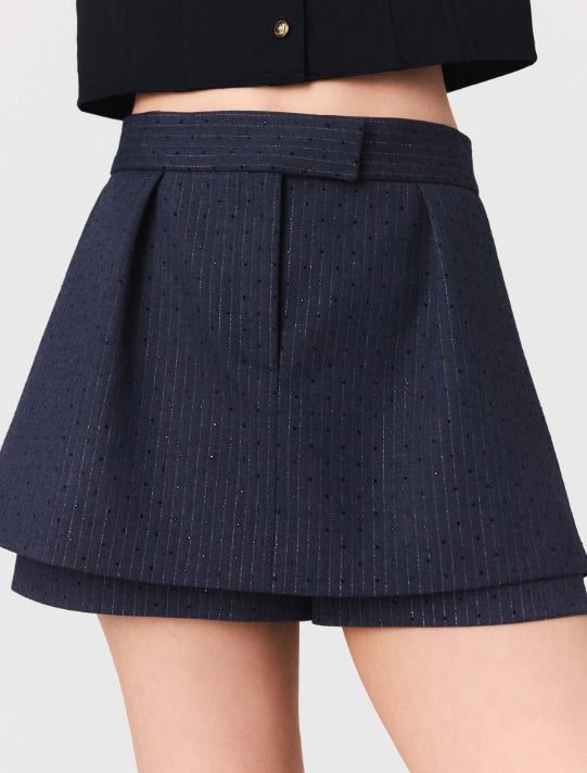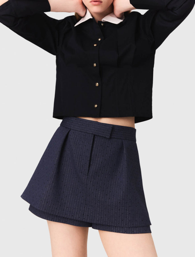 • These striped shorts create a trompe-l'œil skirt effect with their crossed panel. Embellished with rhinestone lines, they boldly and brilliantly reinvent this wardrobe staple. Front darts create a chic play of volume.