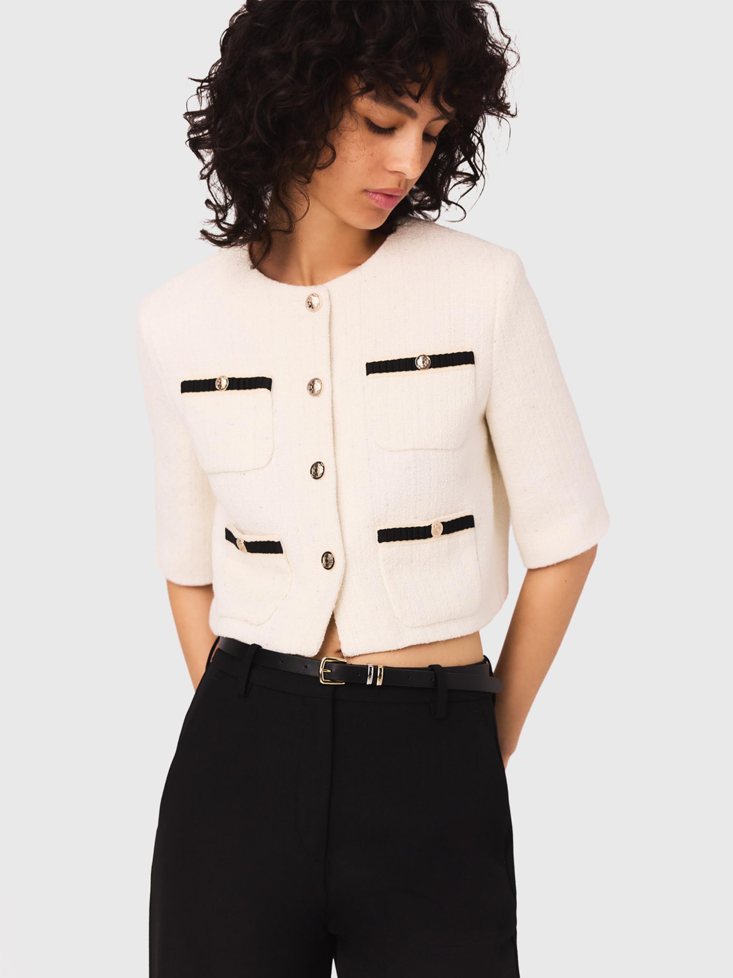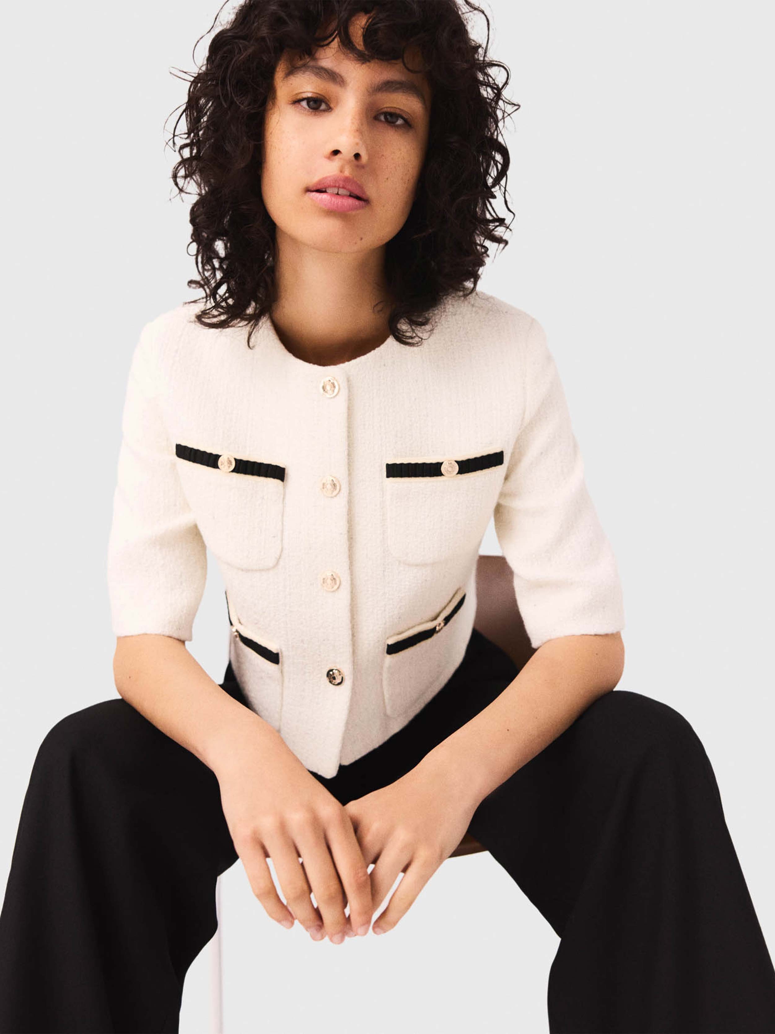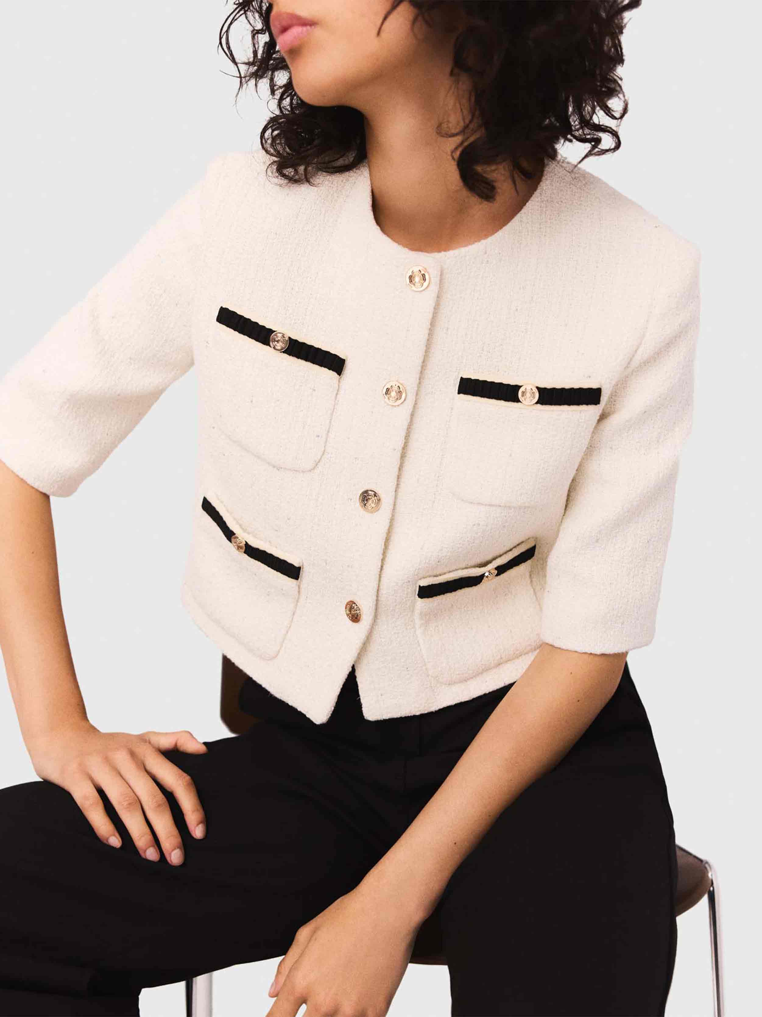 • This short tweed-effect jacket with shimmering threads stands out for its modern and elegant look.