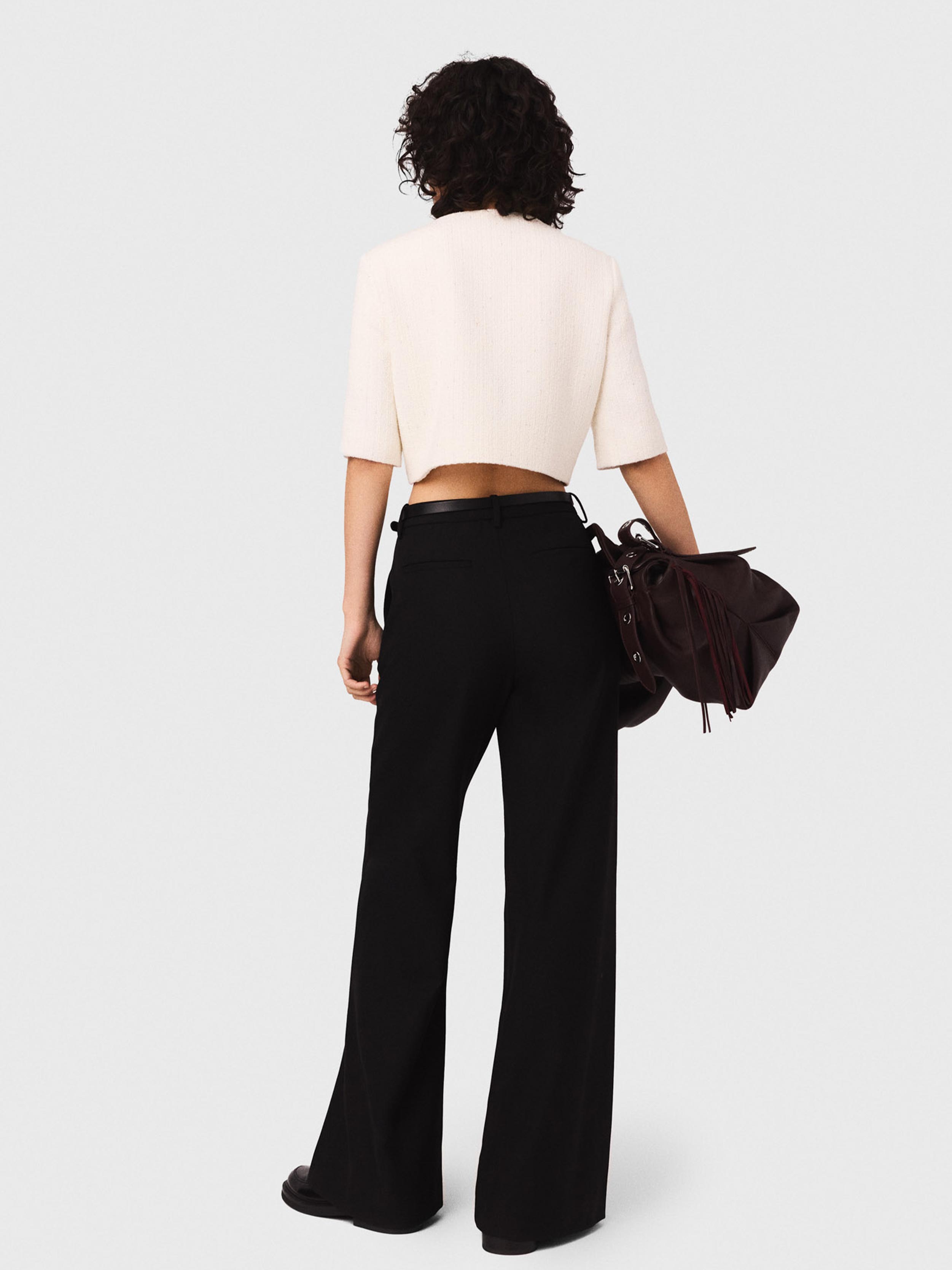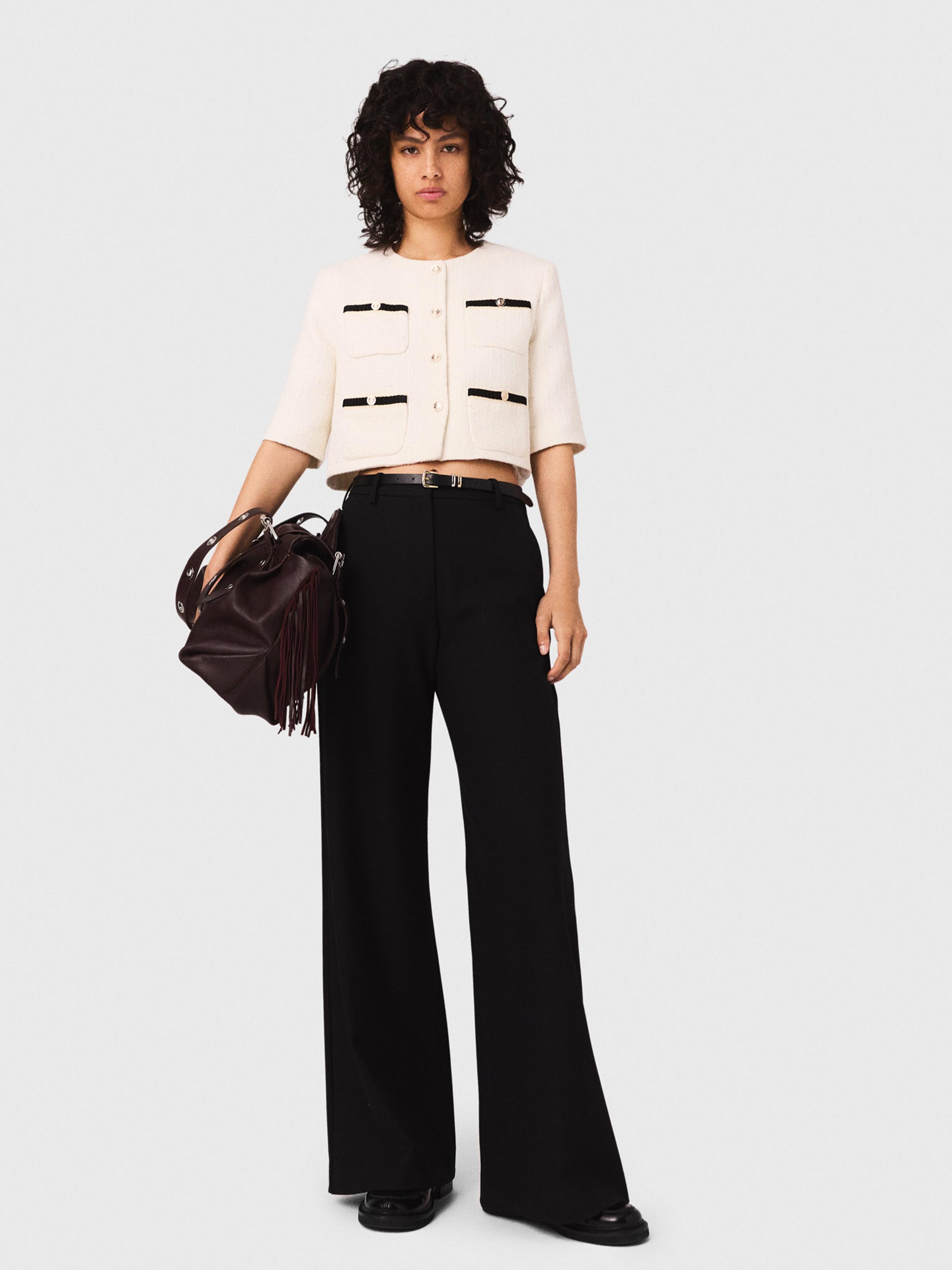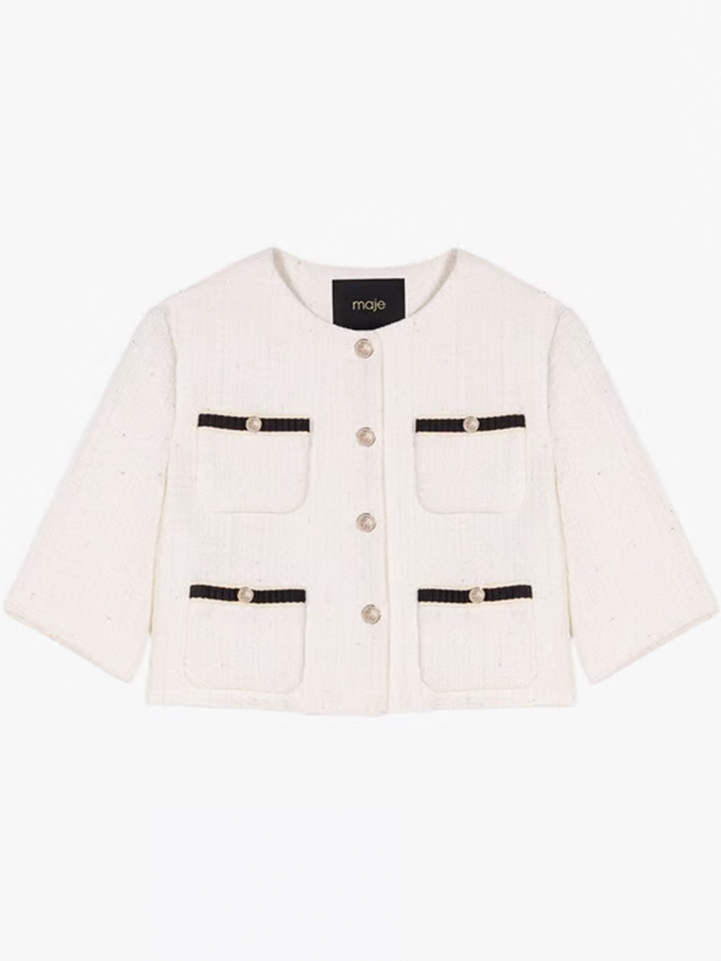 • This short tweed-effect jacket with shimmering threads stands out for its modern and elegant look.