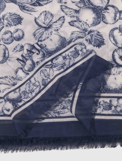 • A true statement accessory of the season, this fruit print shawl stands out with its soft feel and fringed edges. Embrace the coordinated pieces and go for the total look.