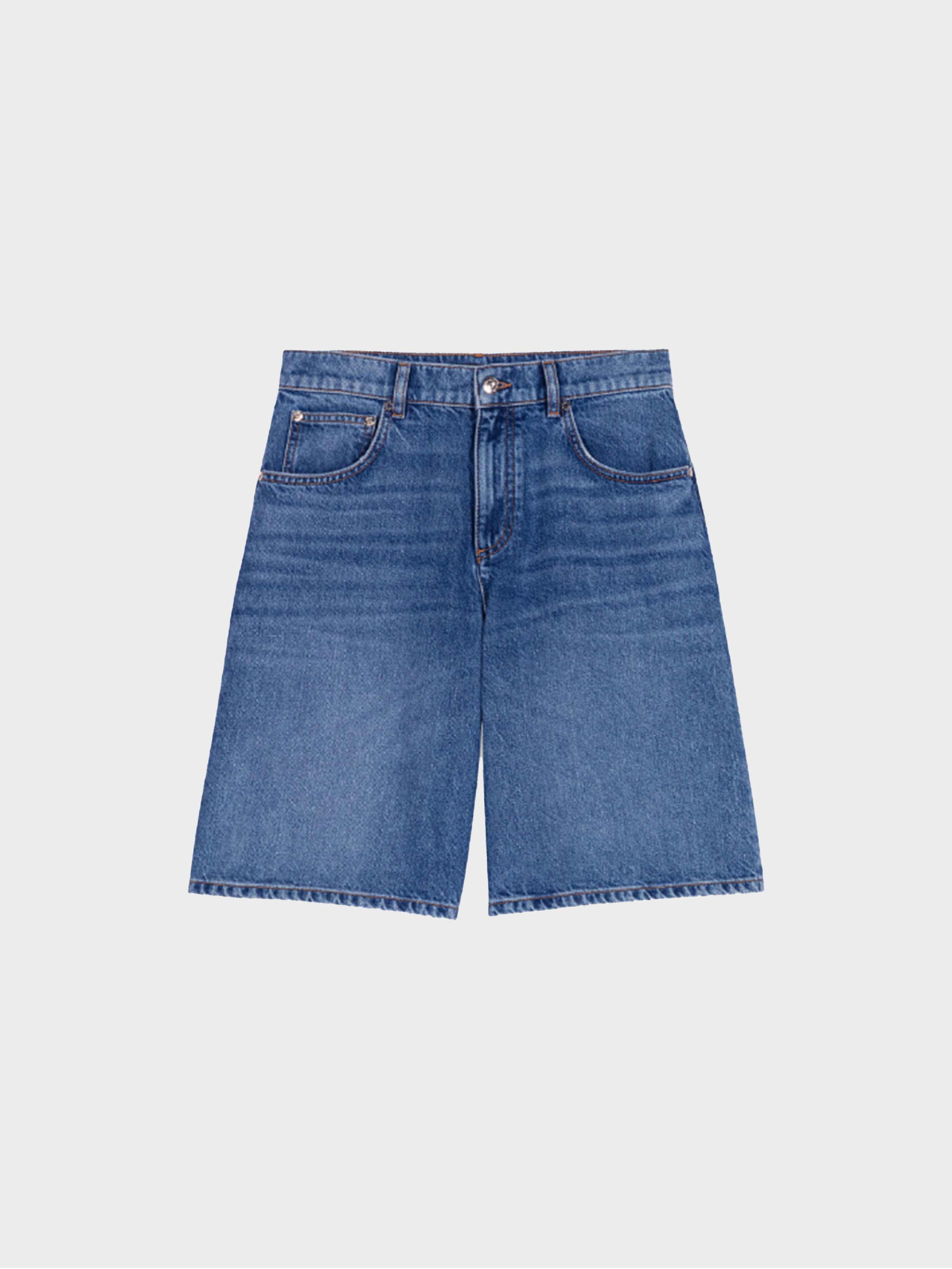 • Maje reimagines a seasonal essential: the faded denim Bermuda shorts. Its classic design with a zip and button fastening, along with belt loops, makes it a versatile and easy-to-pair piece. The Clover jacron on the back adds a subtle signature to this timeless piece.