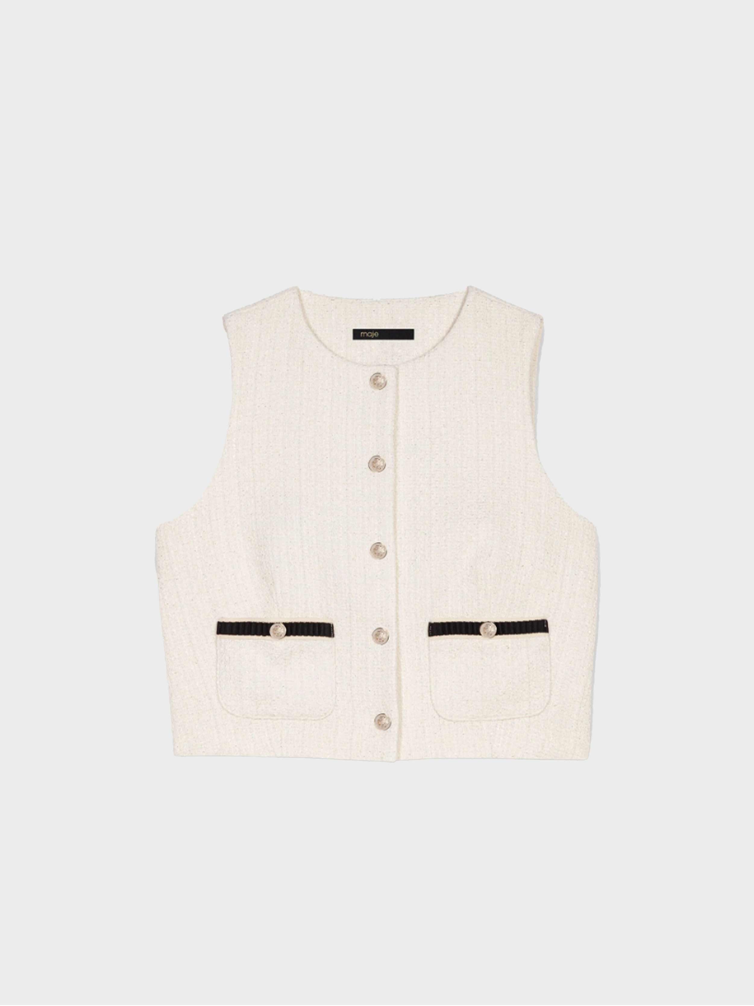• This sleeveless lurex tweed top embodies subtle and modern elegance. Its round neck and button fastening provide delicate structure, while the patch pockets add a practical and refined touch.
