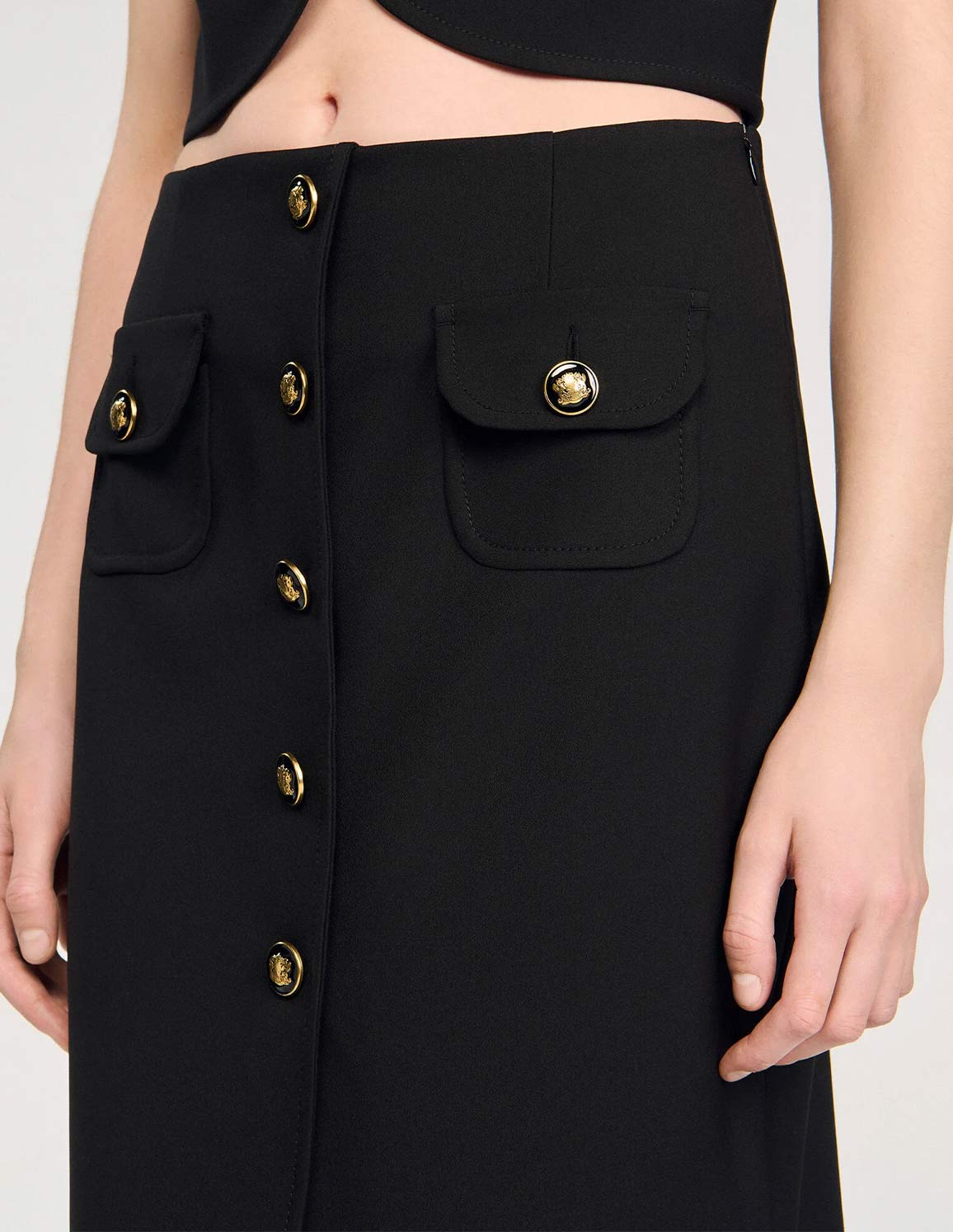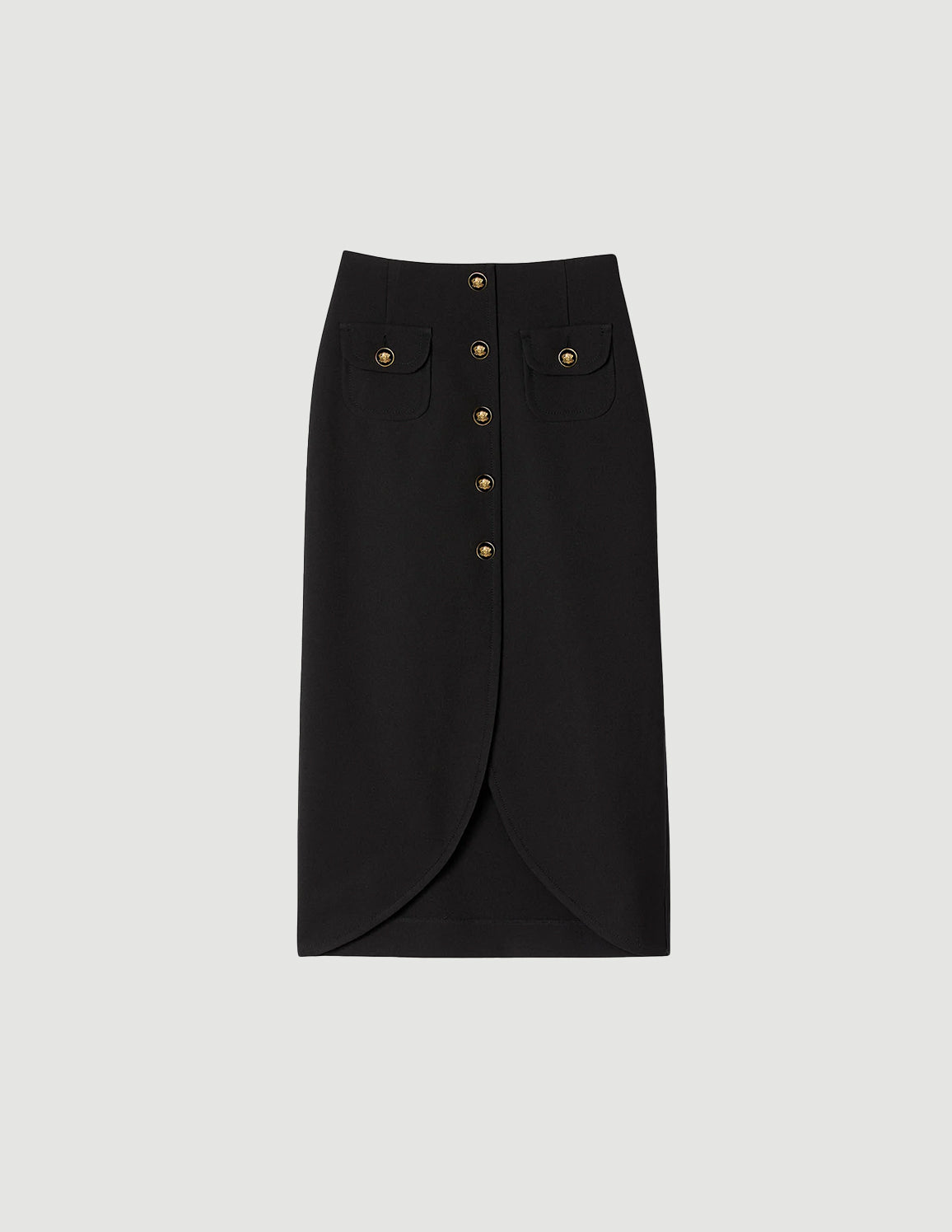• Midi skirt with decorative button fastening, featuring patch pockets with buttoned flaps and a rounded front hem.