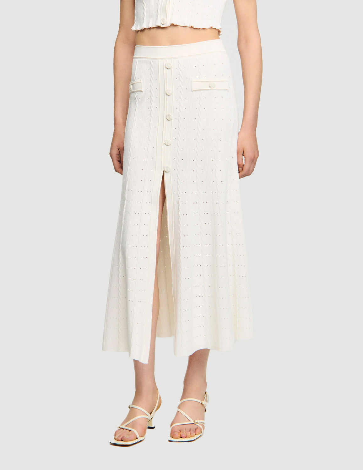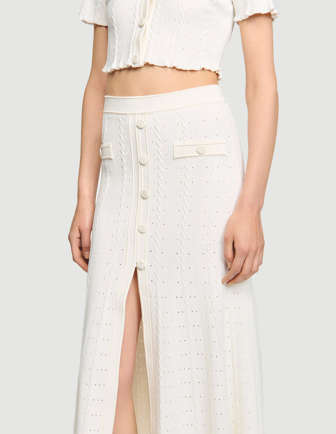 • Midi skirt with a slit in decorative pointelle knit, featuring a decorative button placket and side pockets.