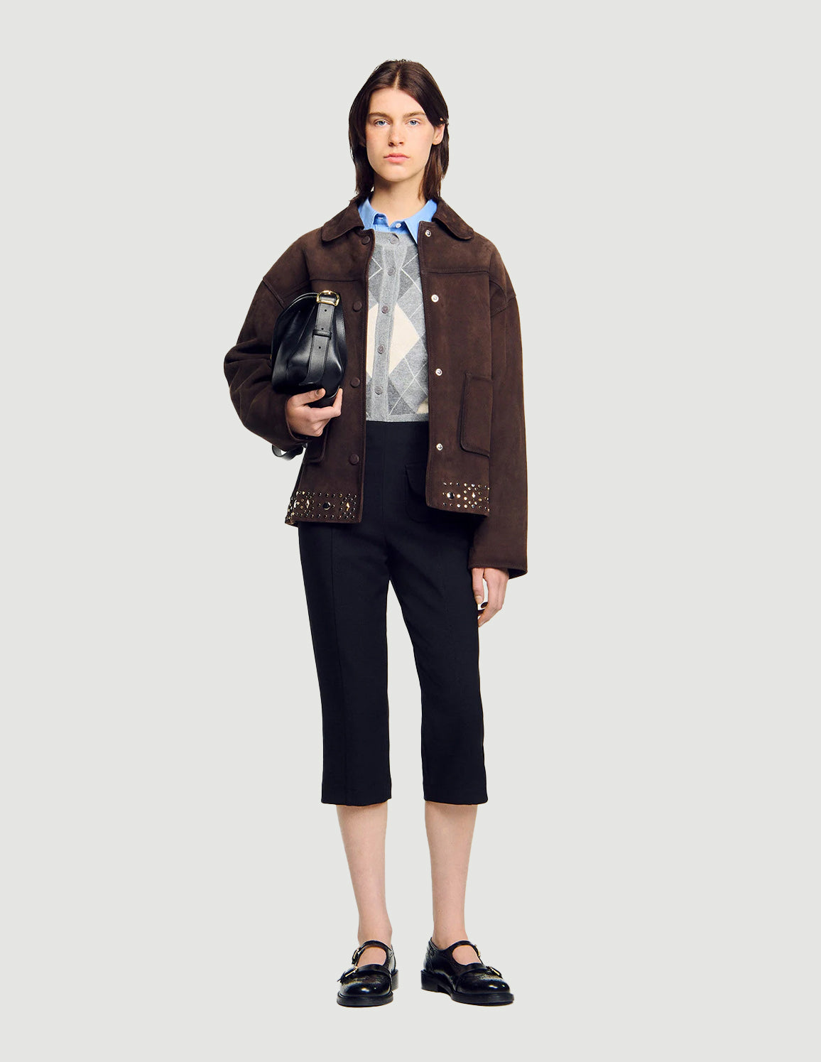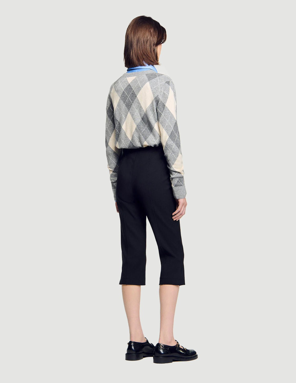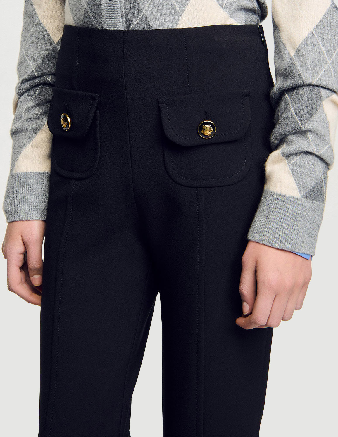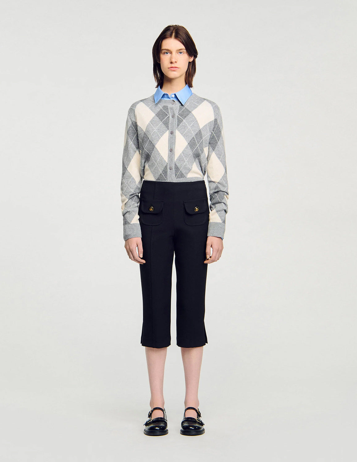• Stretch capri trousers with slits at the hem, featuring flap pockets with button fastening and a side zip.