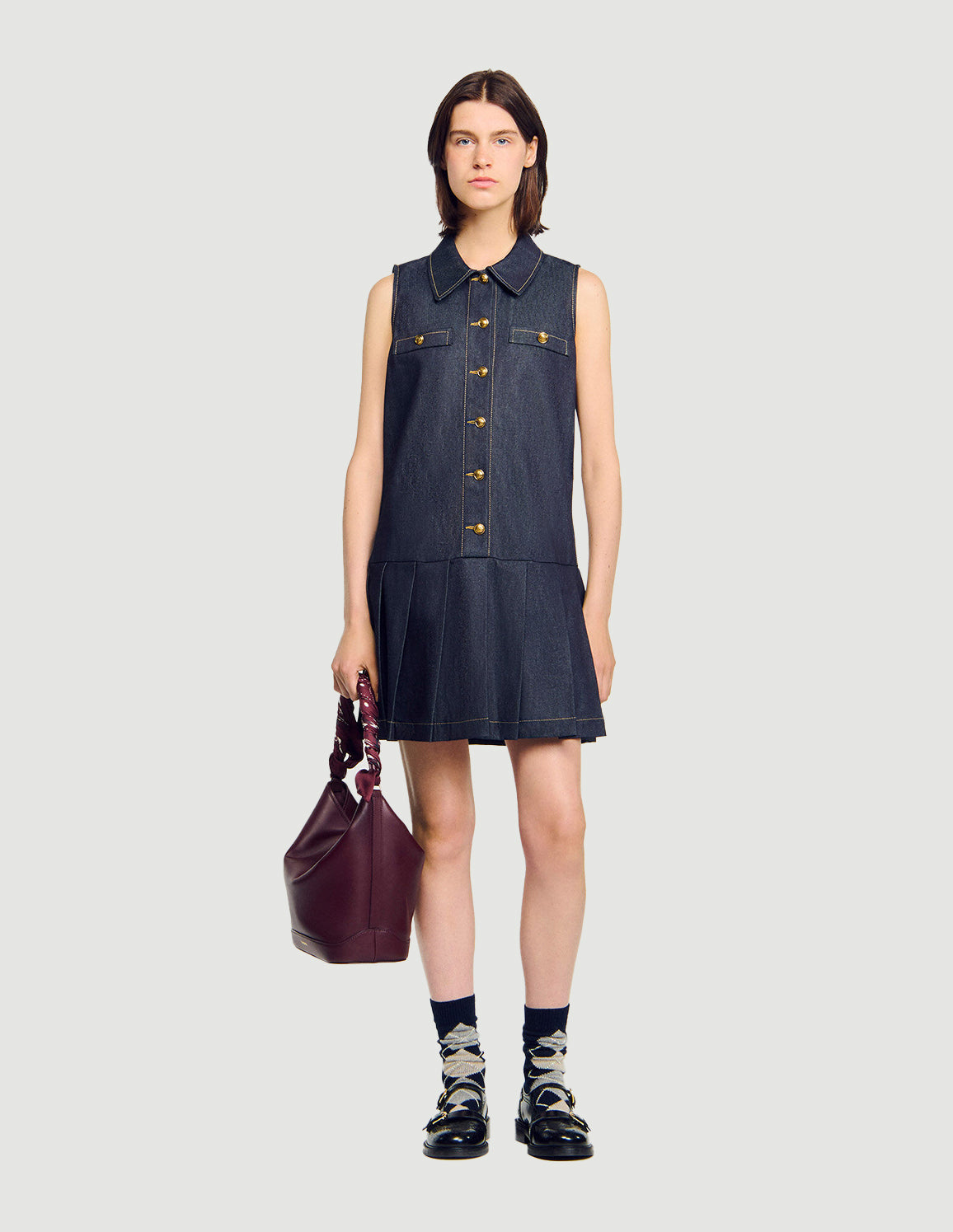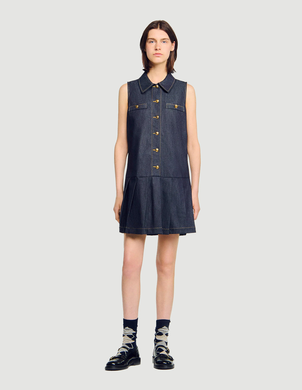 • Sleeveless short dress in raw denim with contrasting topstitching, featuring a shirt collar and button fastening with decorative buttons.