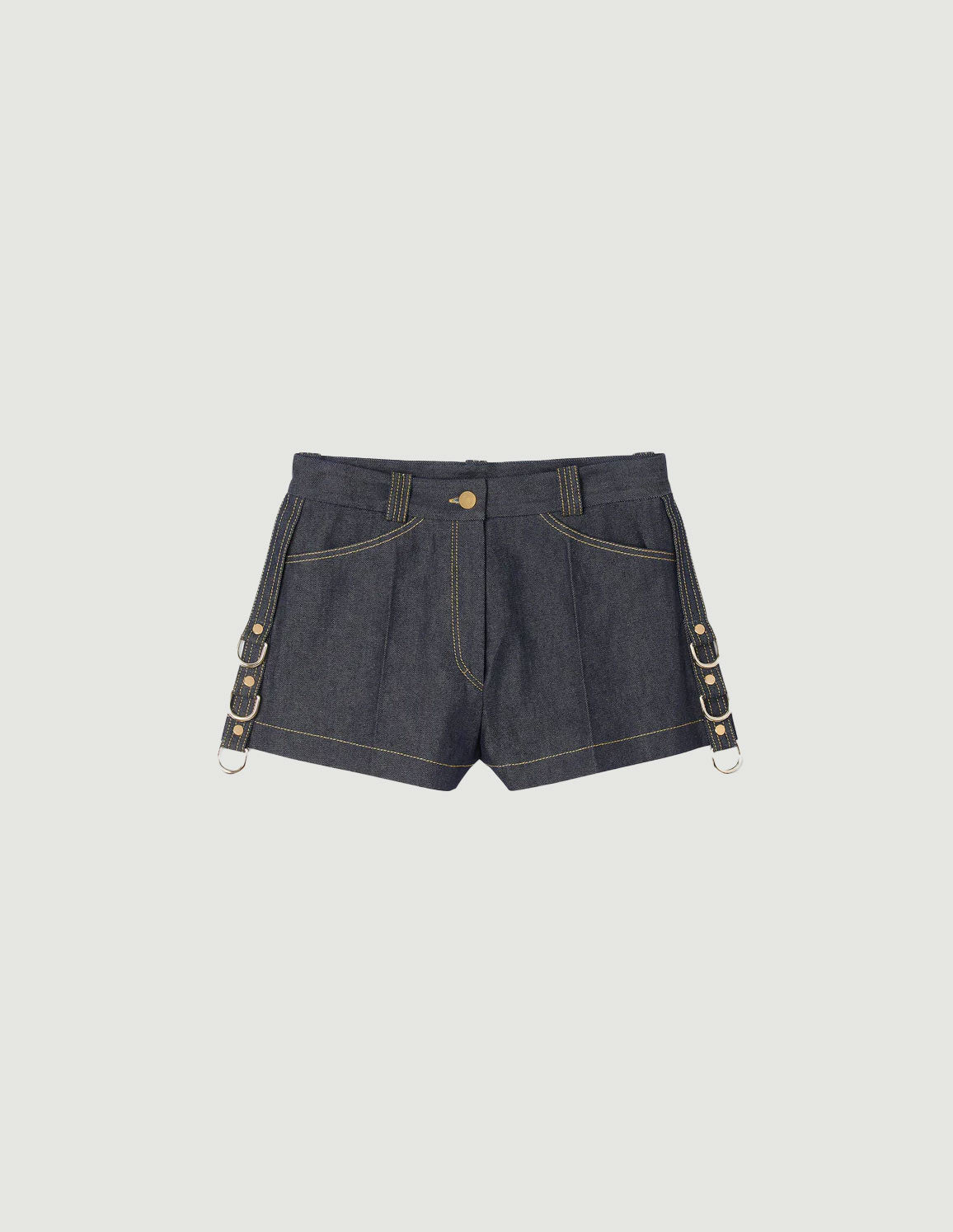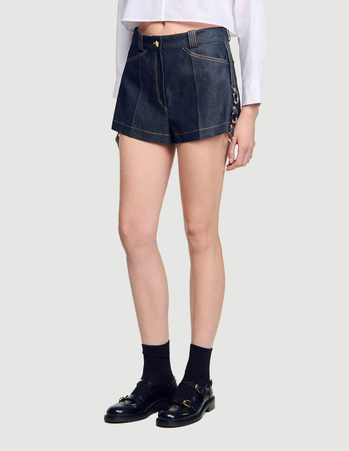• High-waisted flared raw denim shorts with contrast stitching, adorned with metal rings on the side.