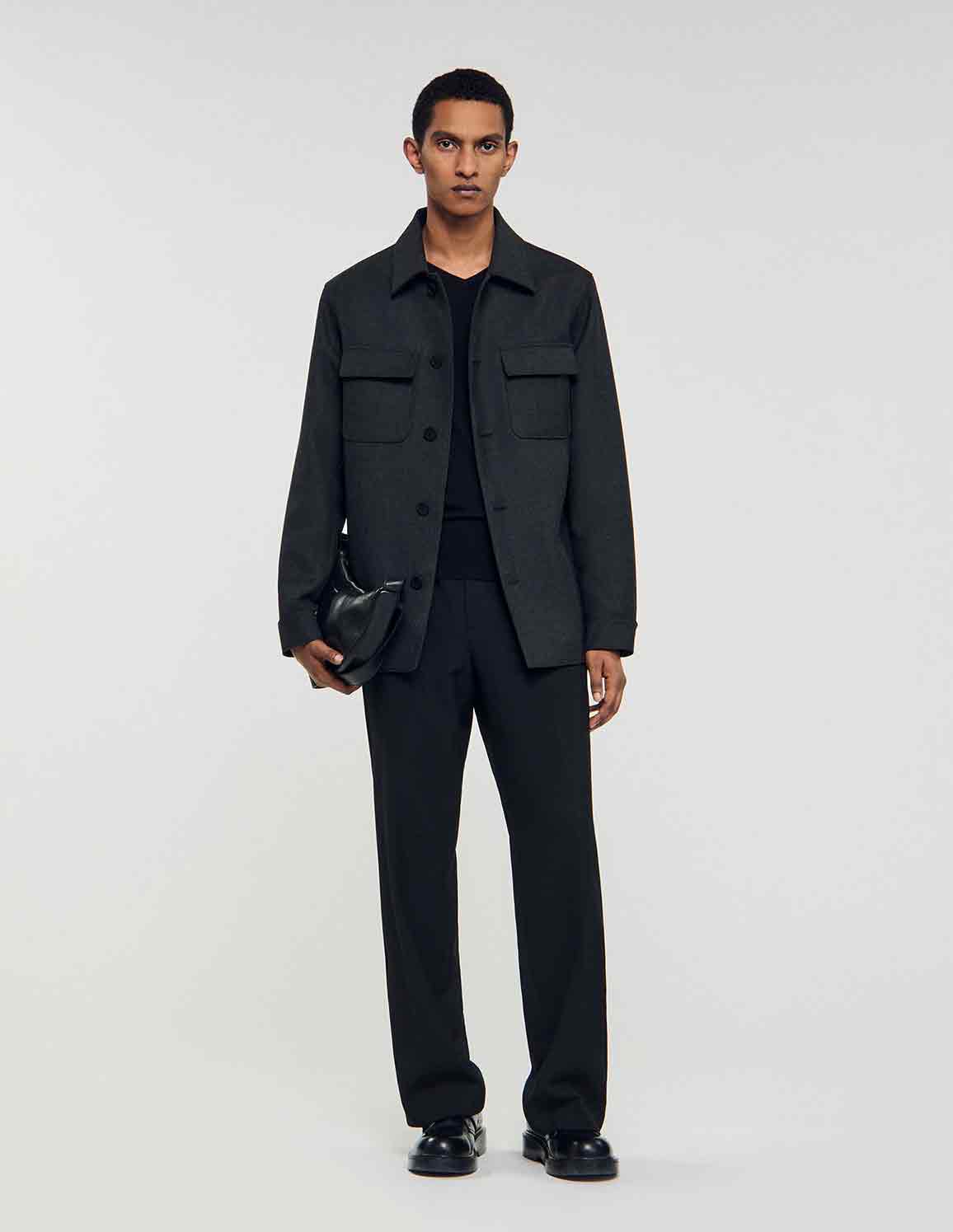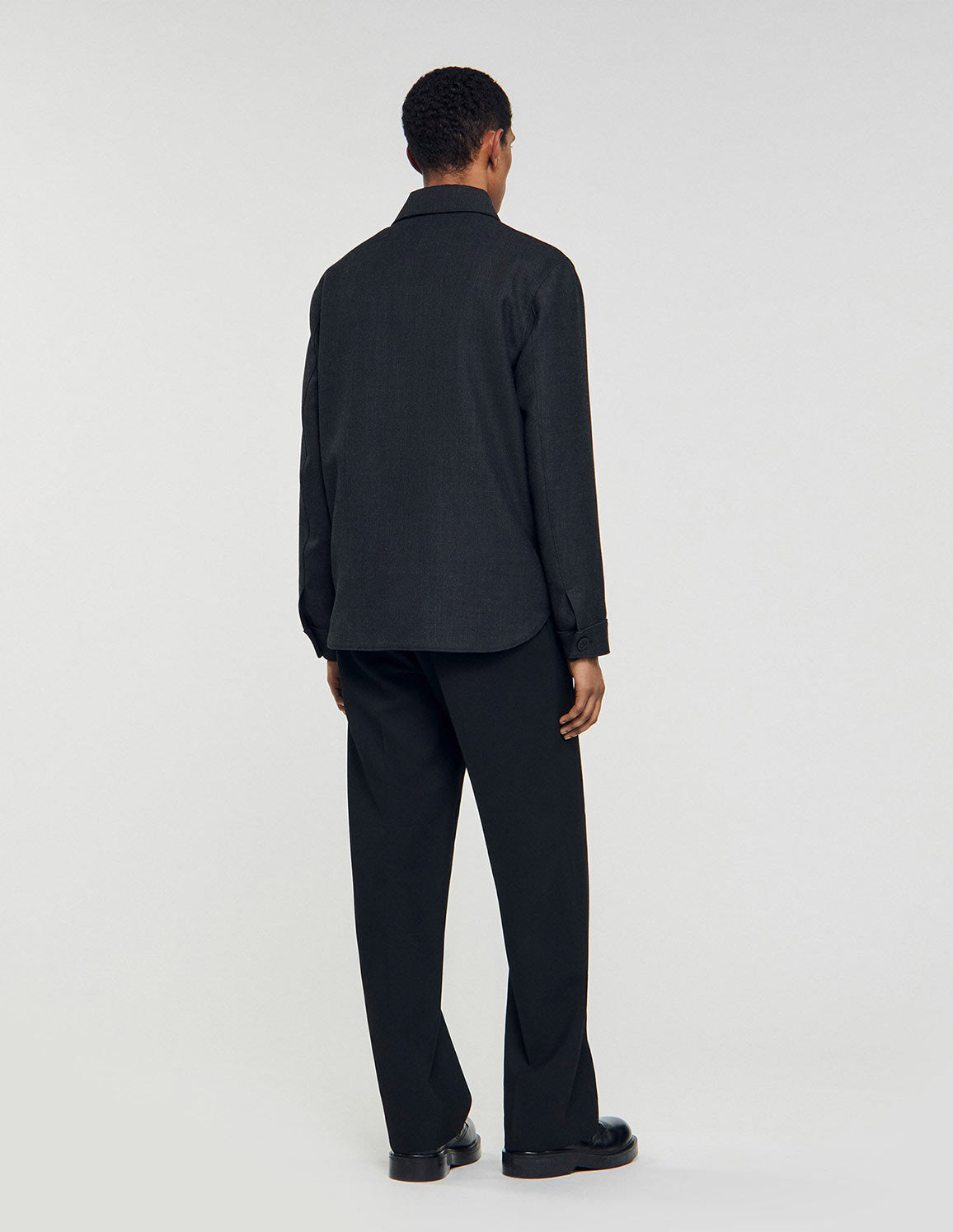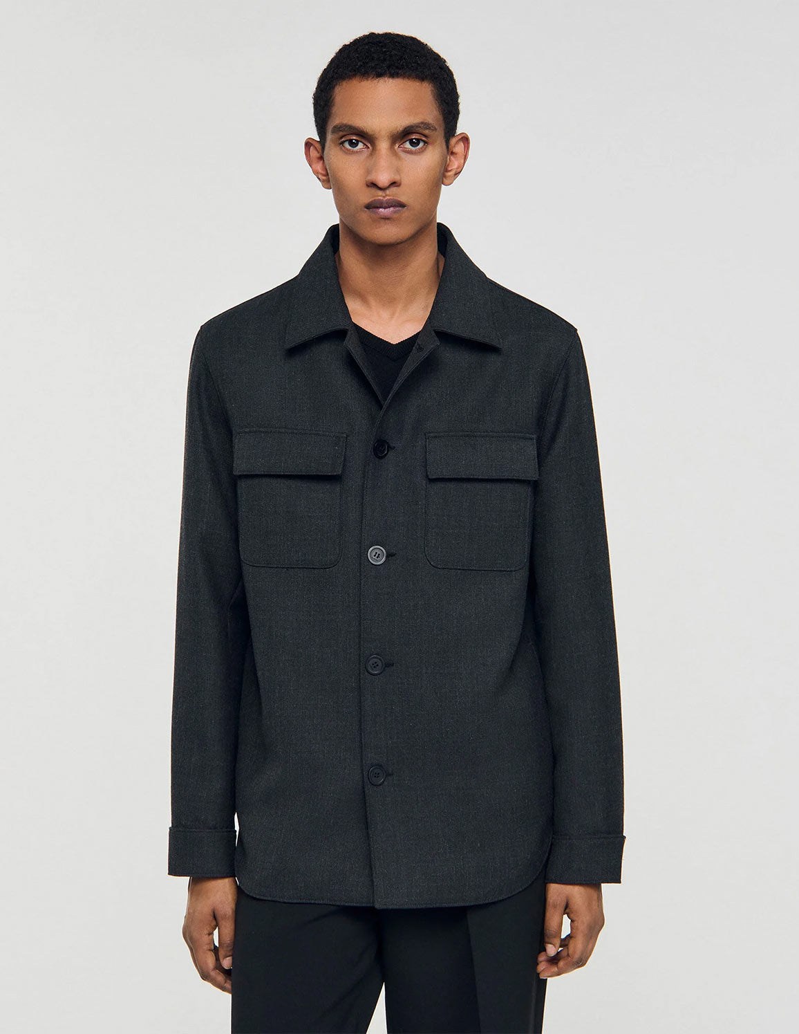 • Casual wool overshirt with broken collar, long sleeves, button fastening, and front patch pockets with flaps.