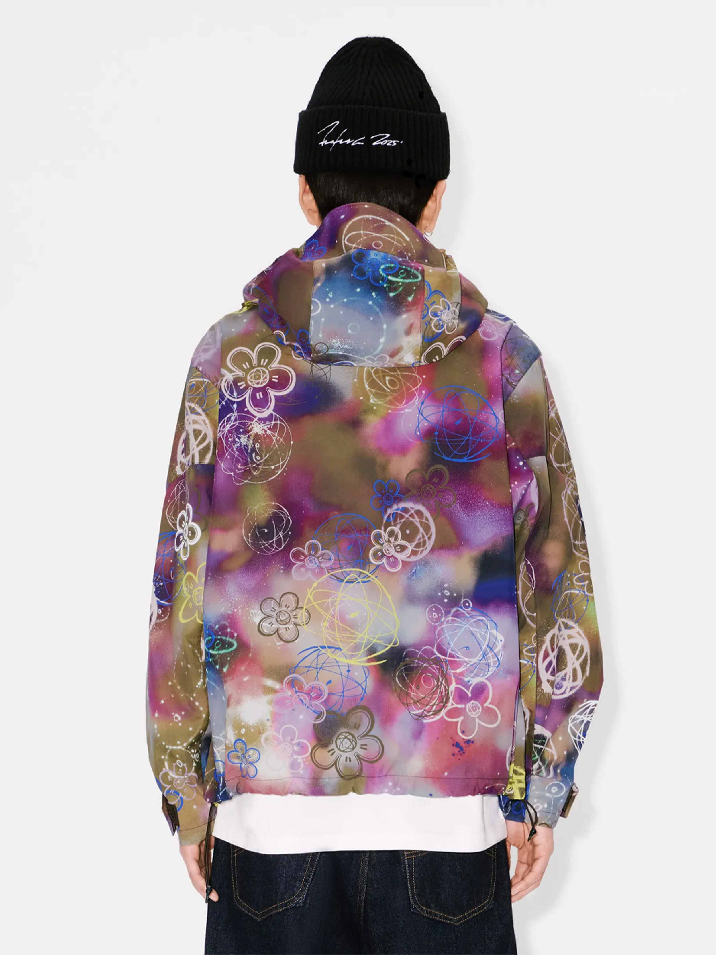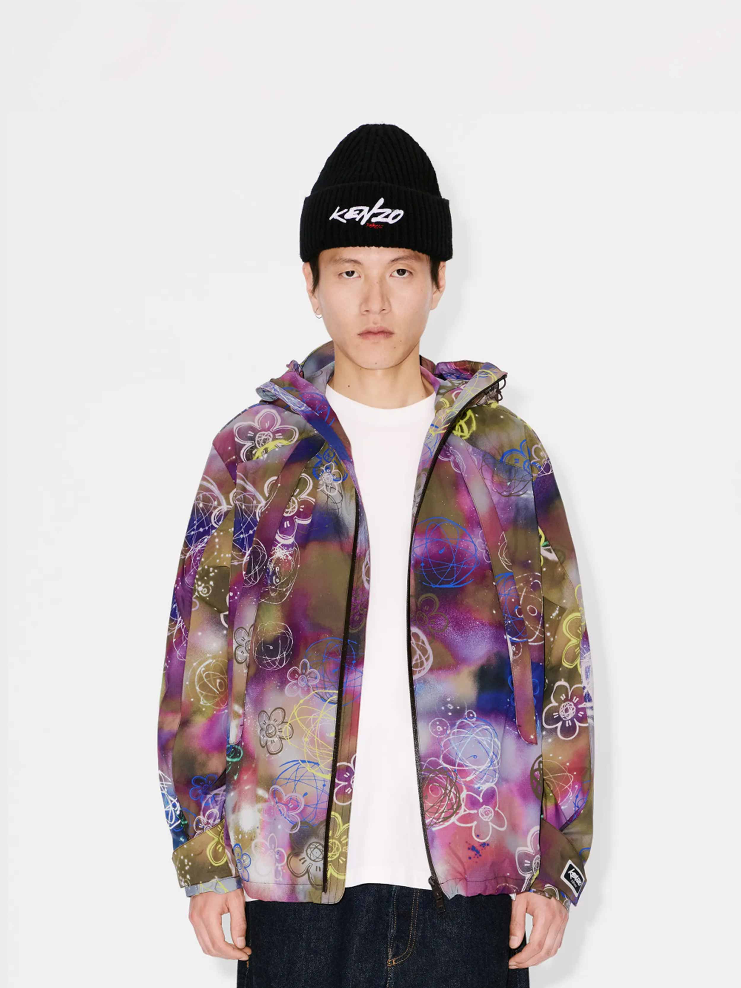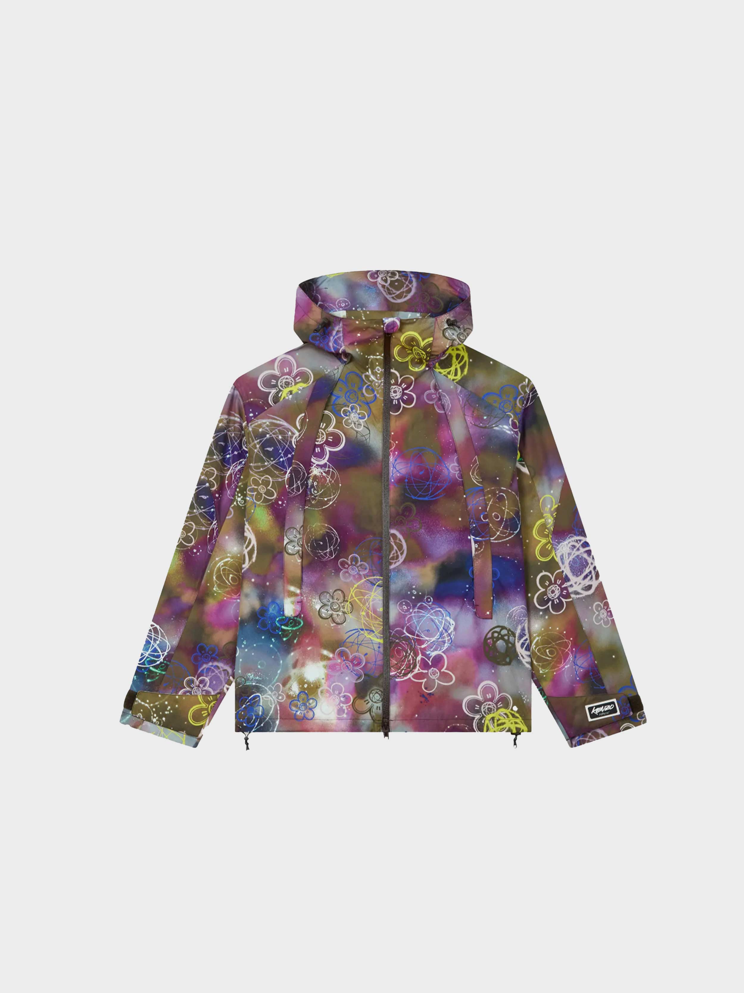• This water-repellent nylon windbreaker features one of the iconic prints from the collaboration between Kenzo and Futura 2000, blending the house's signature Boke Flower motif with the artist's Atom symbol on a graffiti-style background.