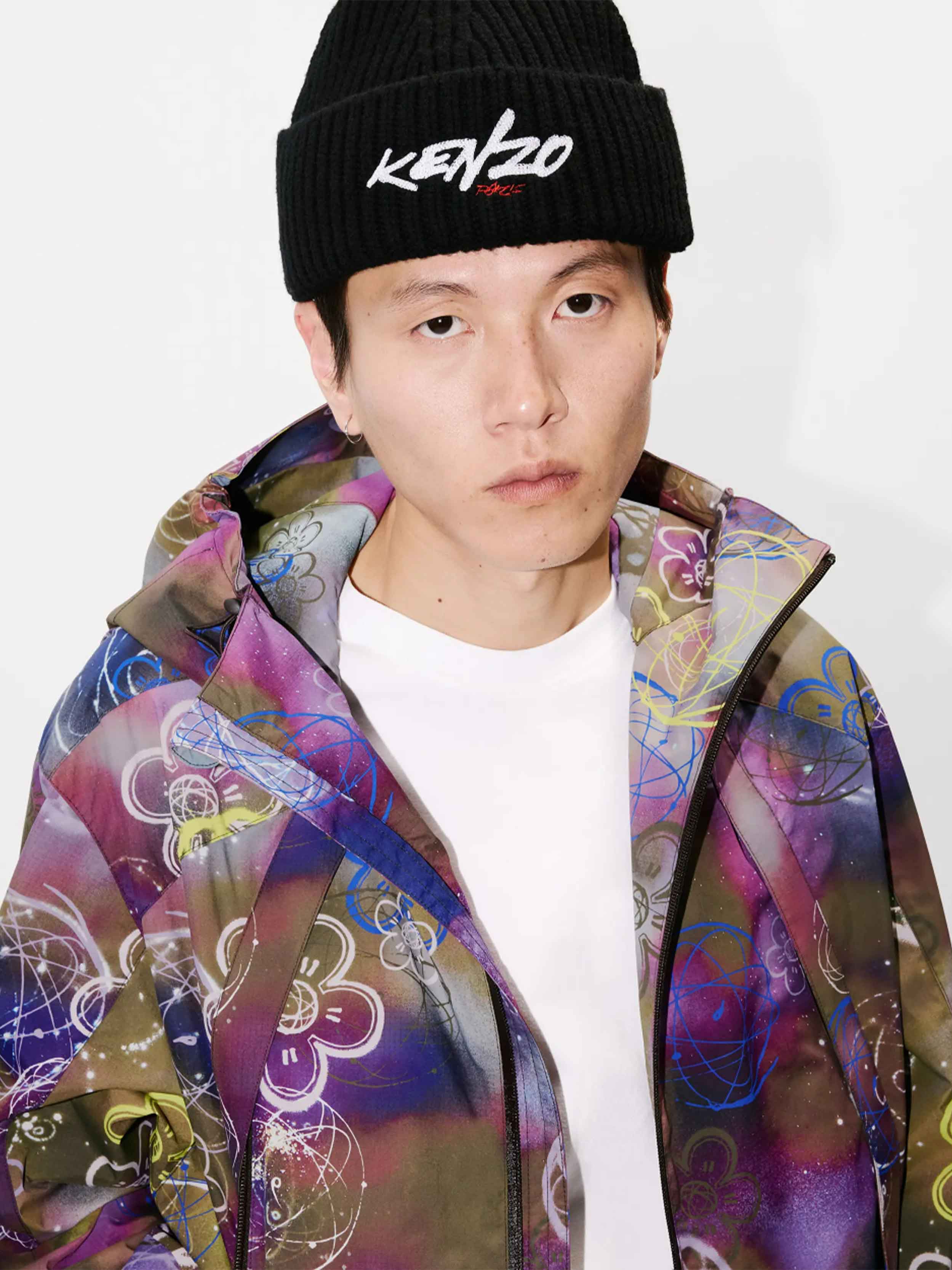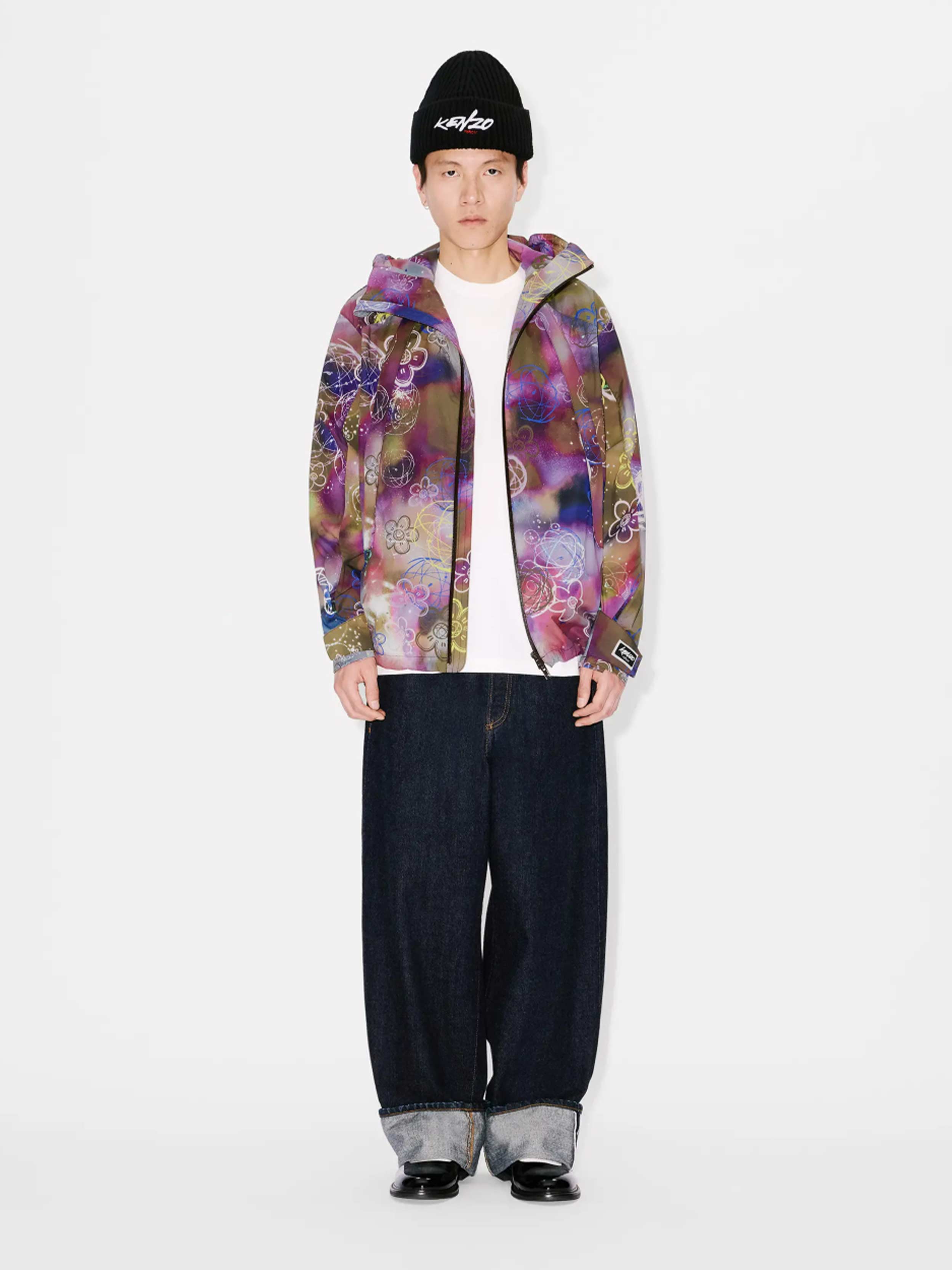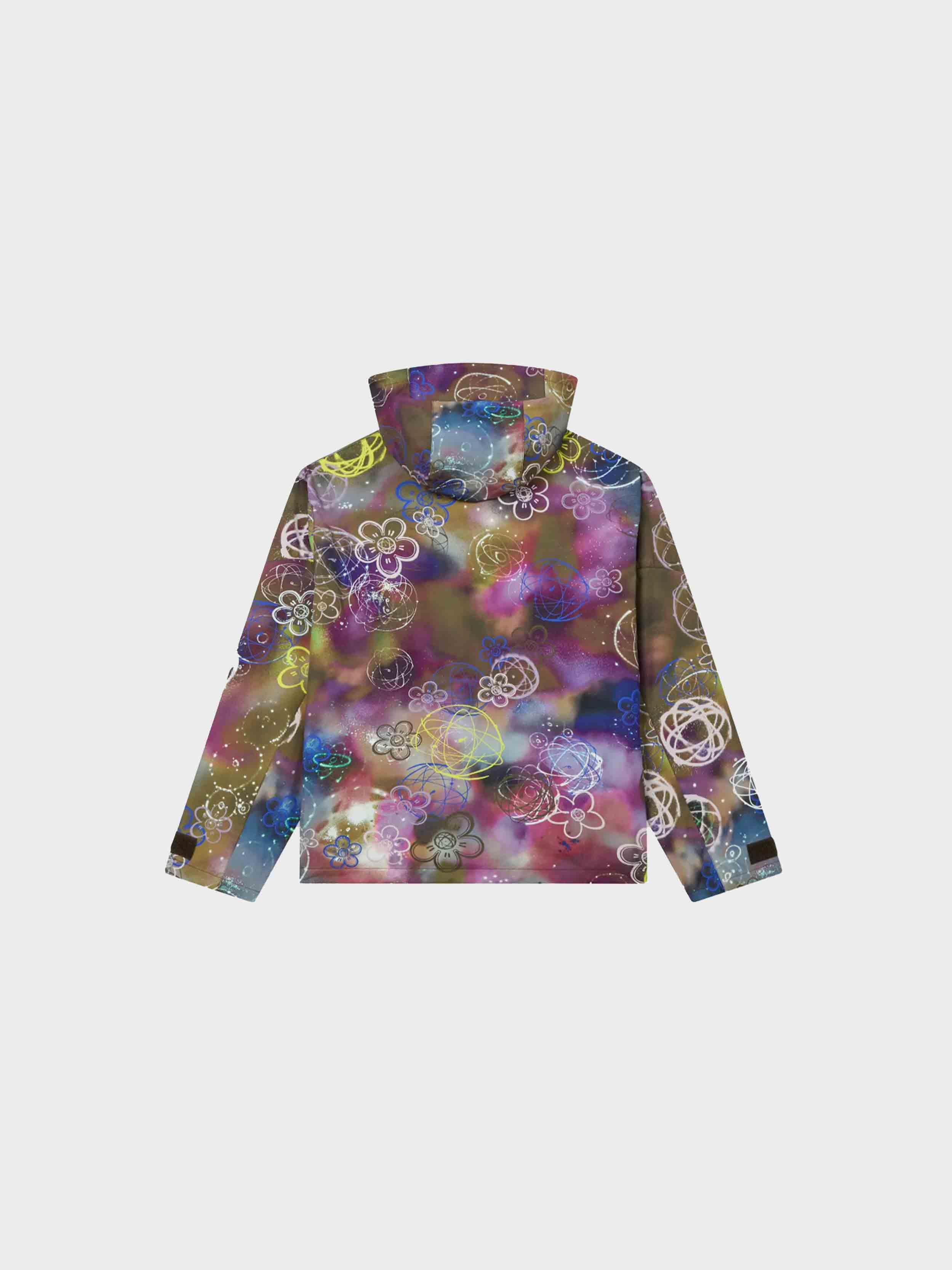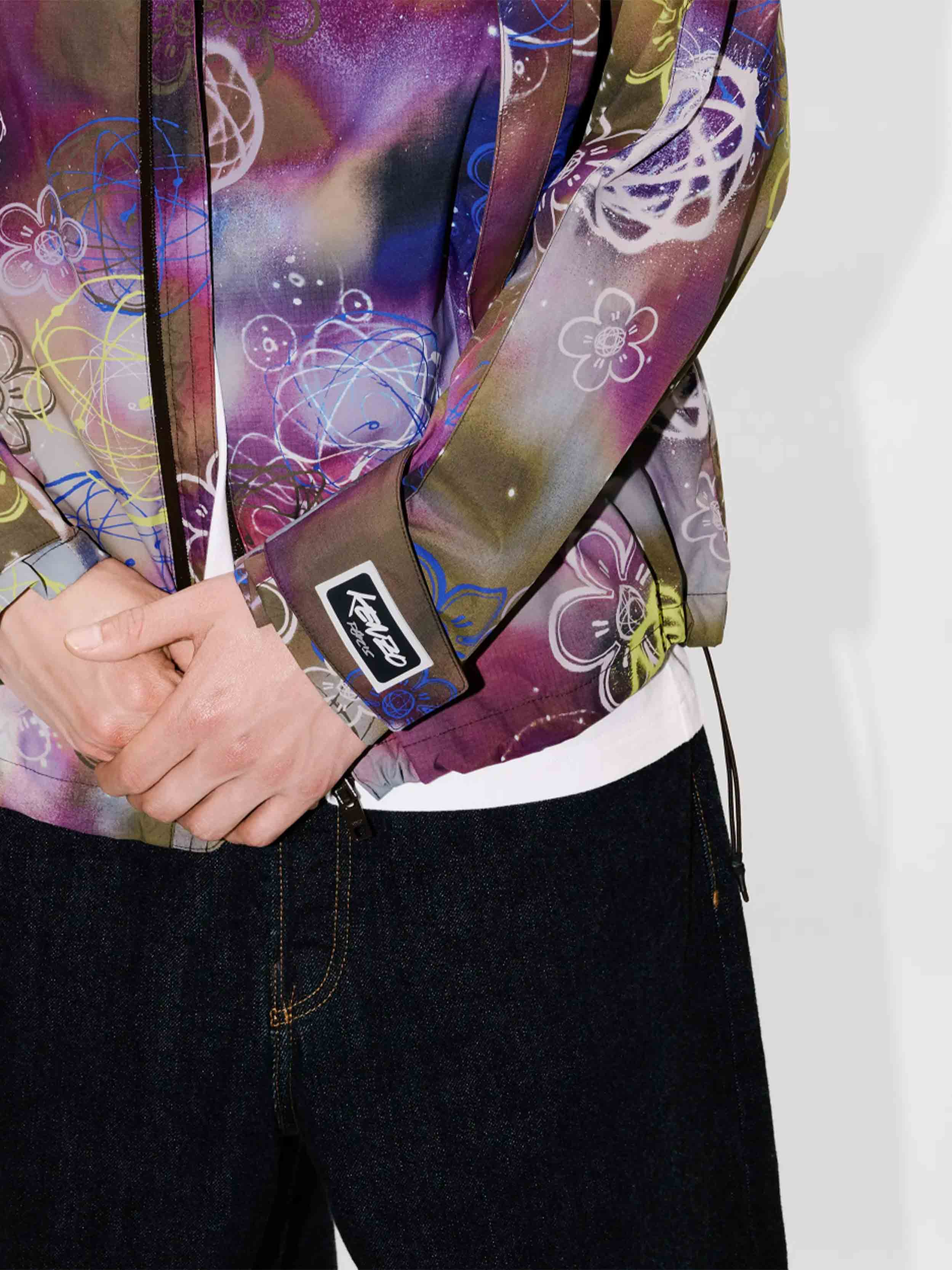 • This water-repellent nylon windbreaker features one of the iconic prints from the collaboration between Kenzo and Futura 2000, blending the house's signature Boke Flower motif with the artist's Atom symbol on a graffiti-style background.