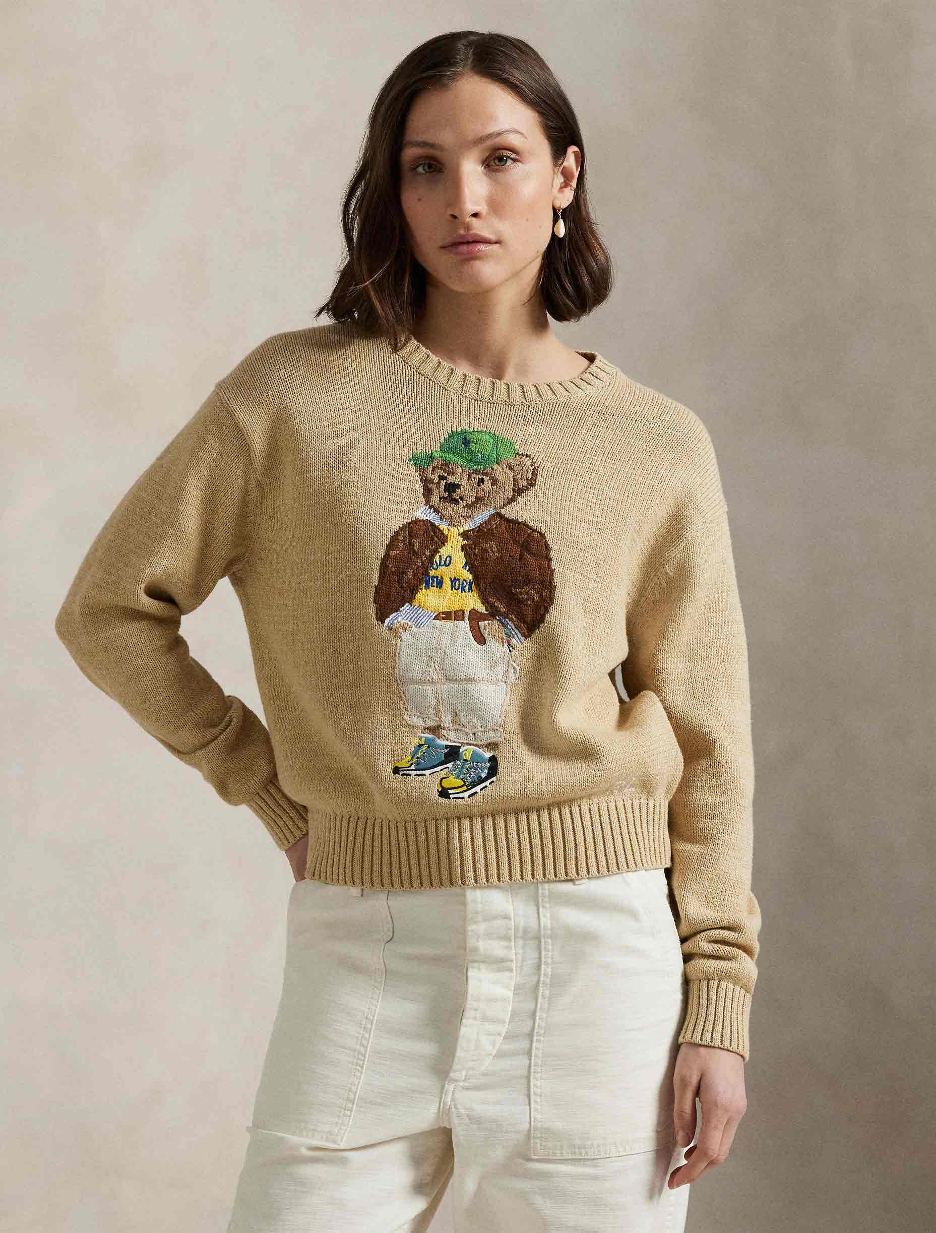 • This cotton crewneck jumper showcases an intarsia-knit and embroidered rendering of the Polo Bear donning a Ralph Lauren look, complete with a signature Pony ball cap.