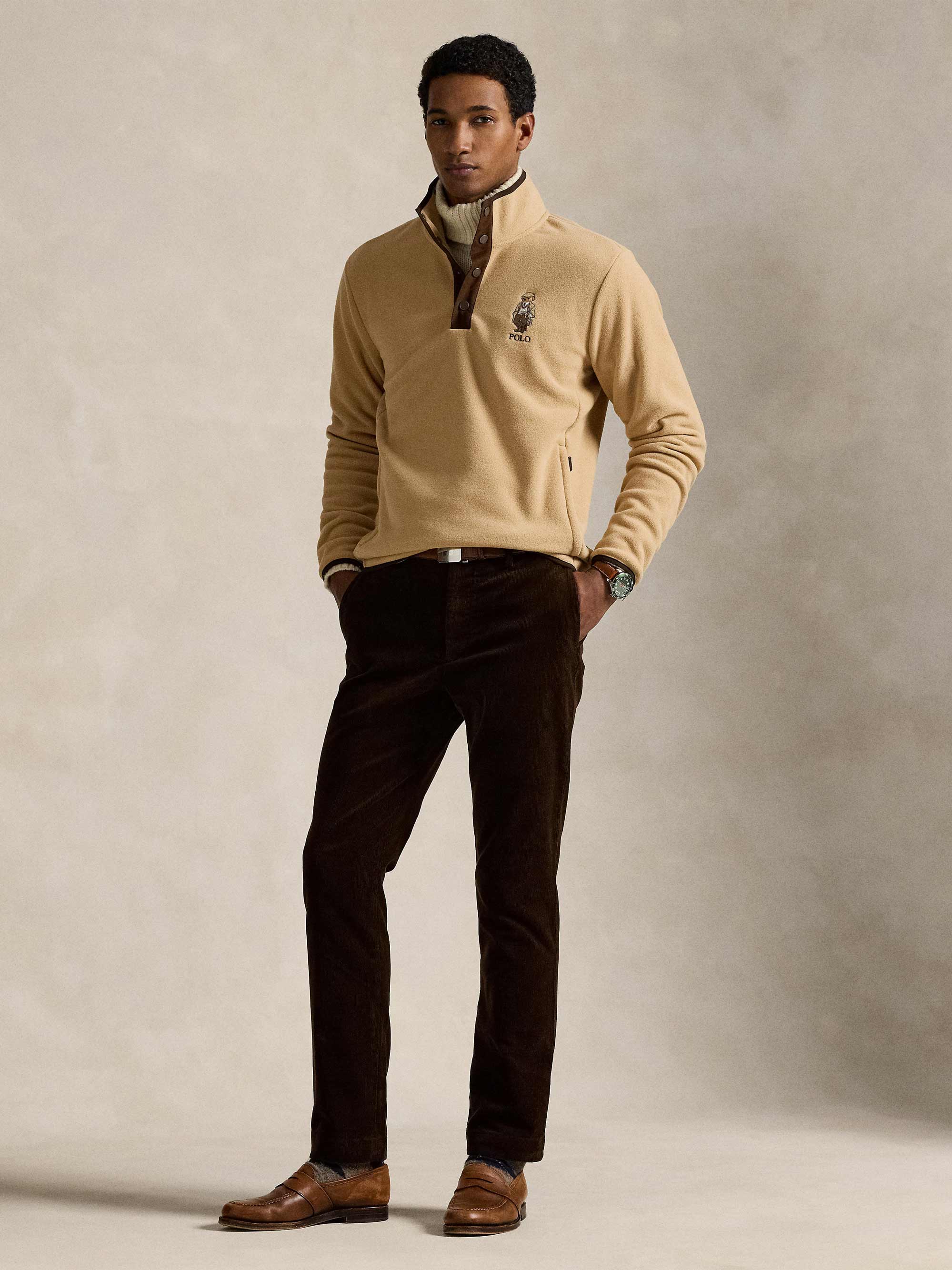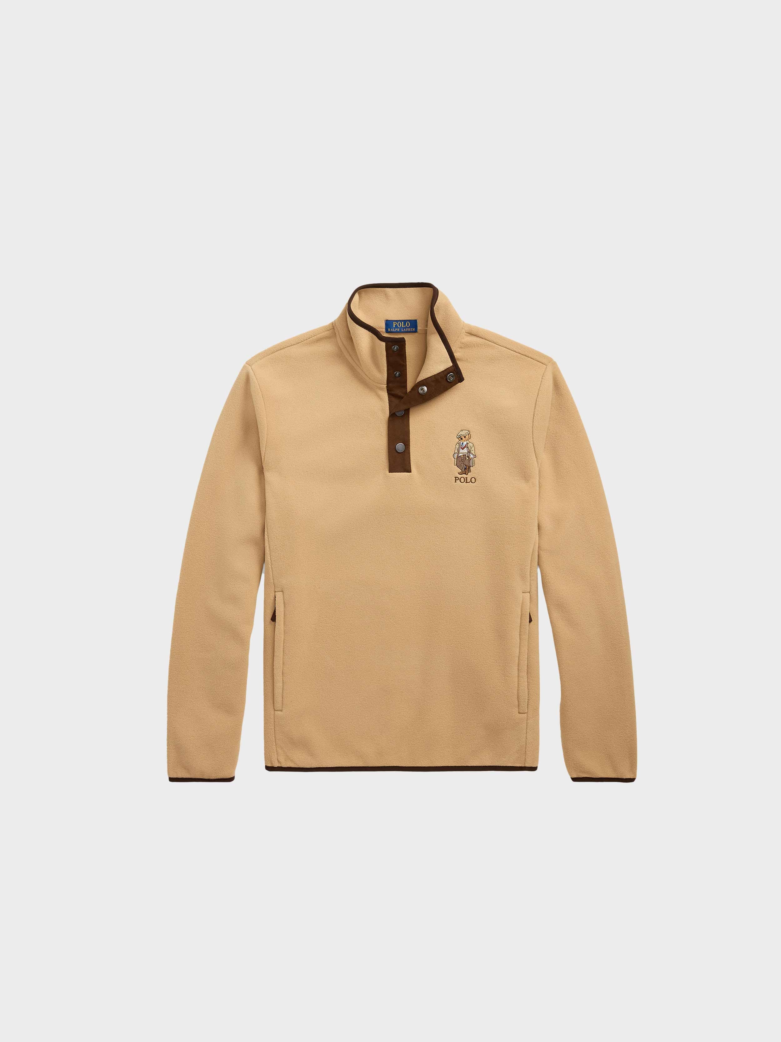 • In brushed fleece, this mockneck pullover features the iconic Polo Bear intricately embroidered at the chest. It is meticulously detailed with faux-suede trim at the placket and custom-developed hardware.