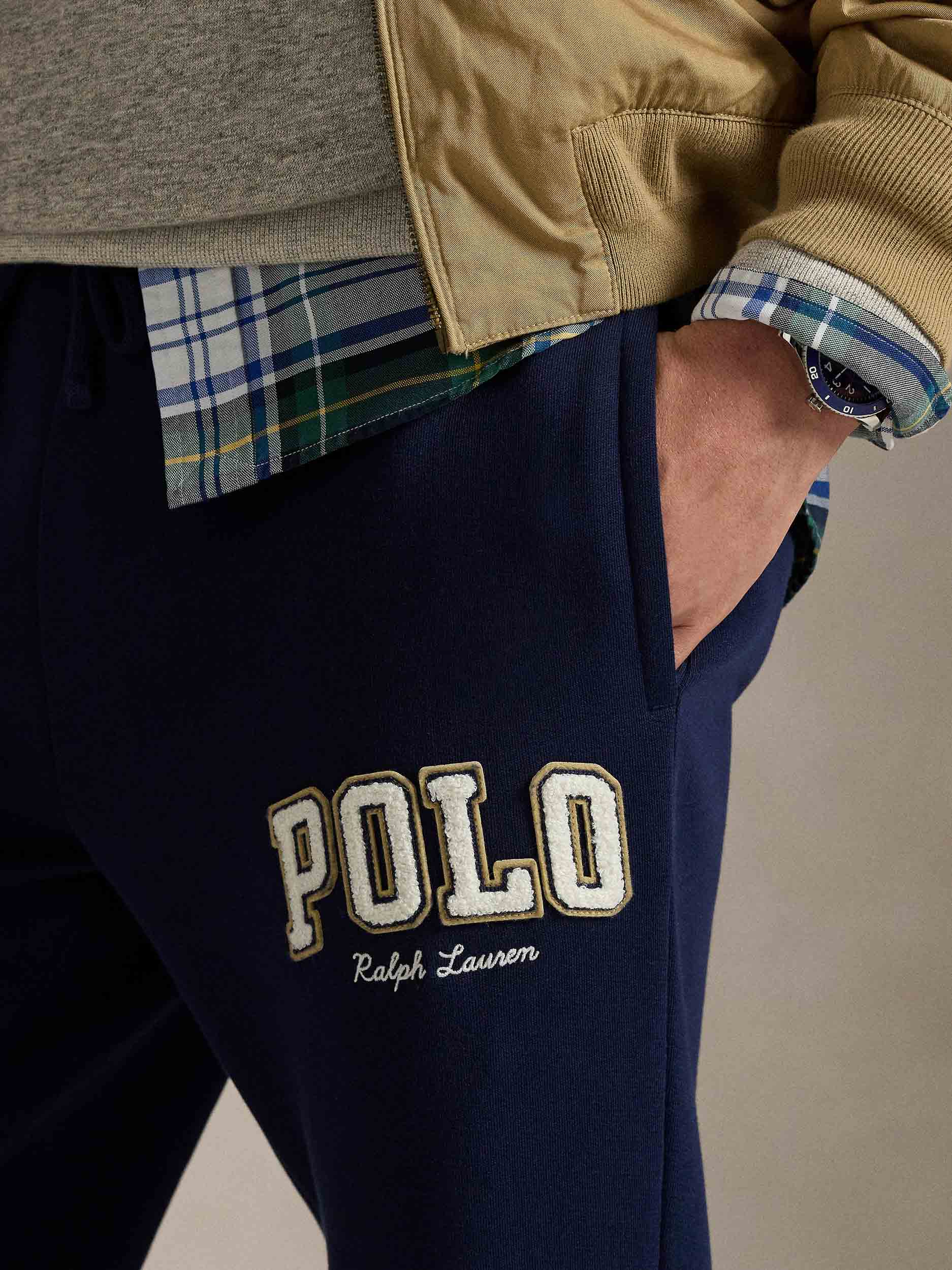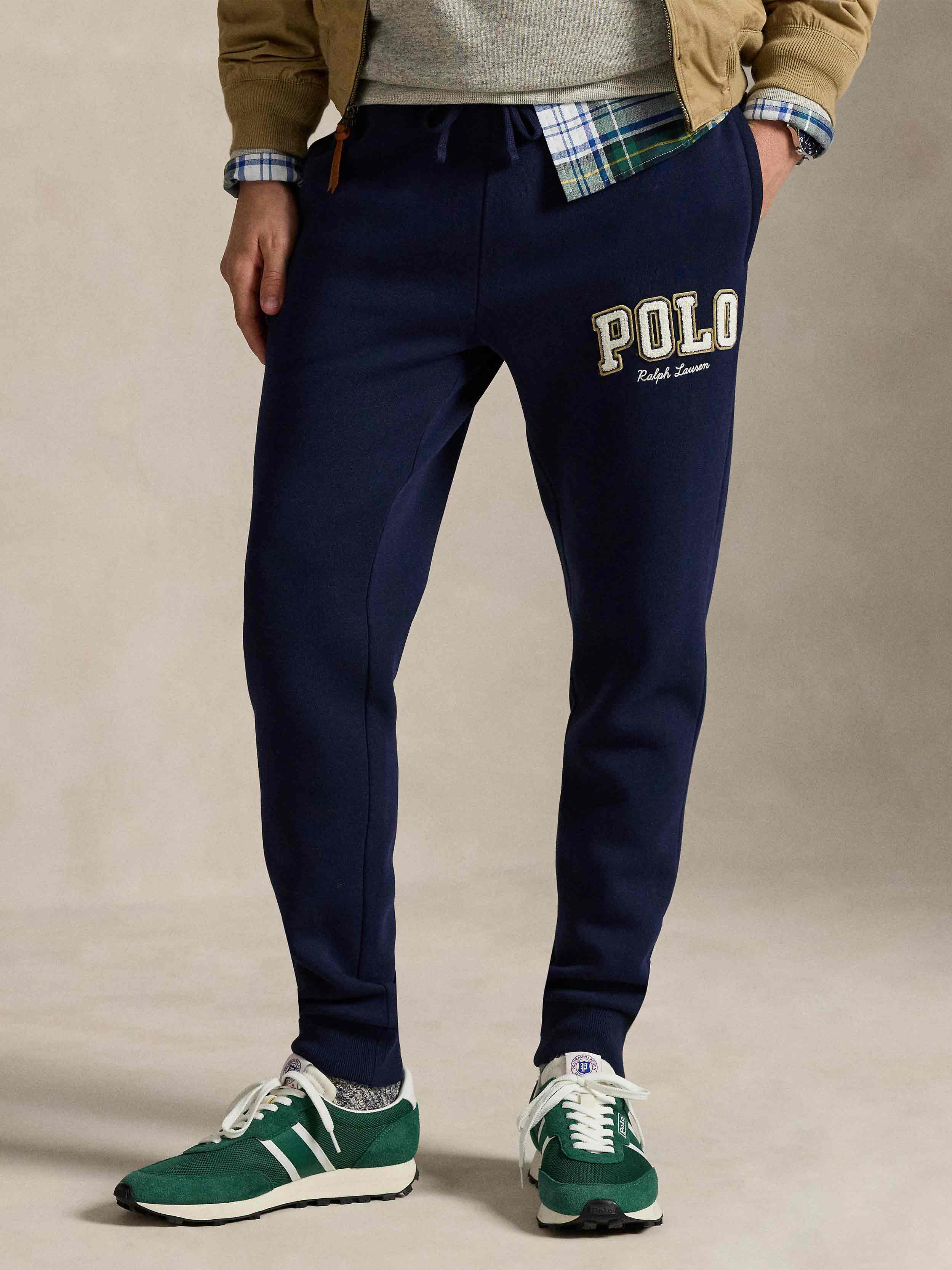 • Along with our signature embroidered Pony, these cotton-blend trousers feature our Polo logo rendered in letterman-style appliqués.
