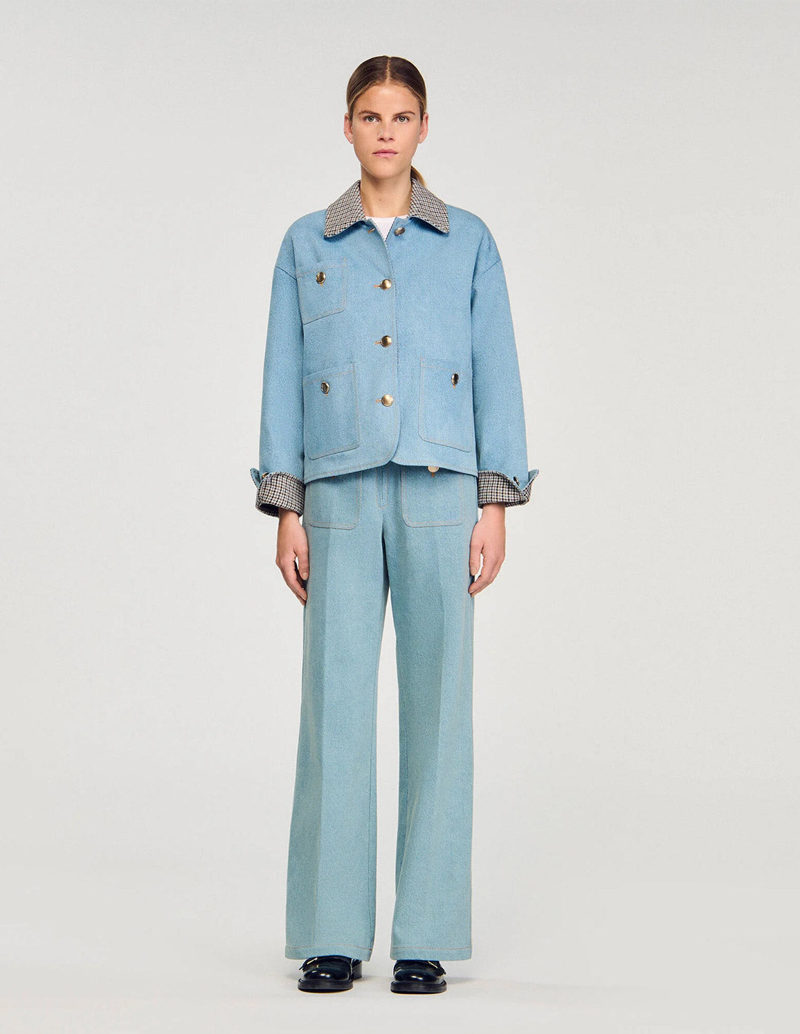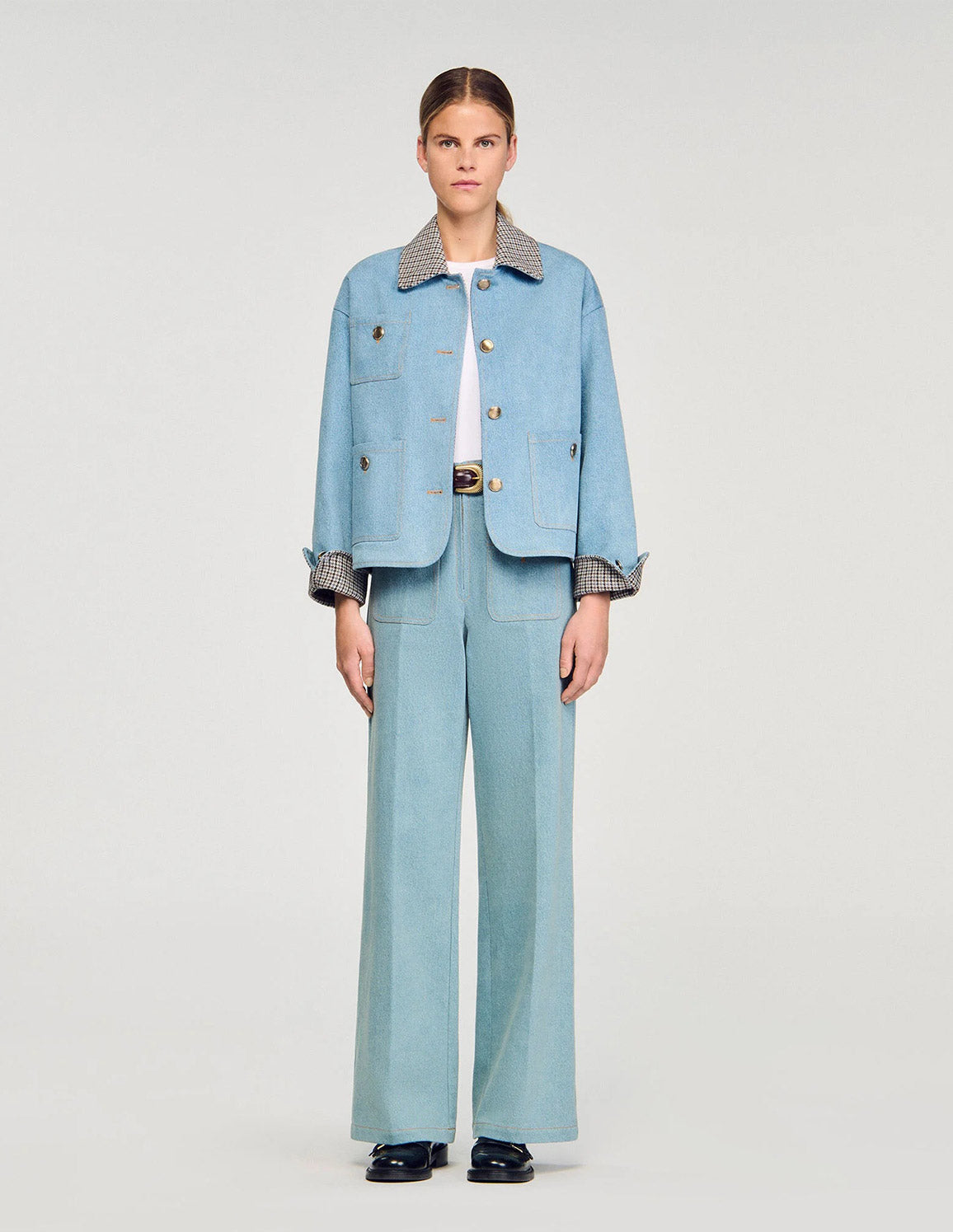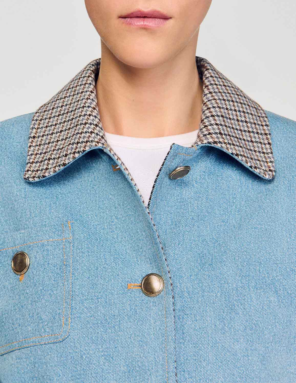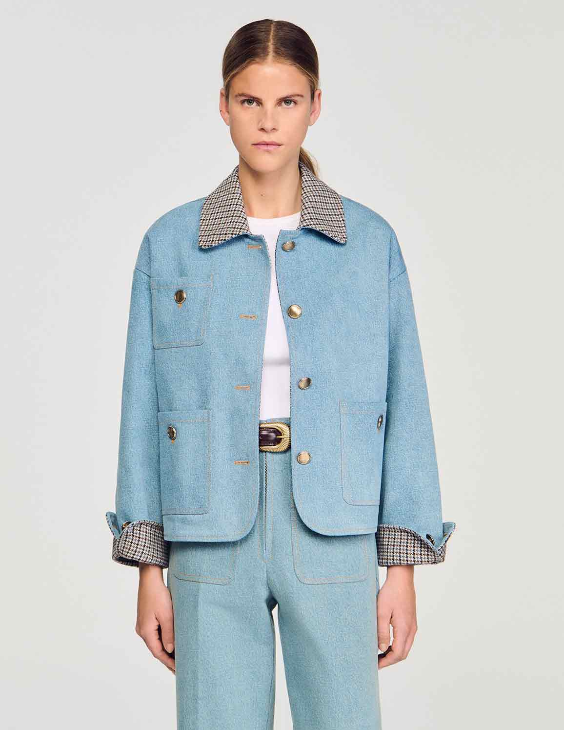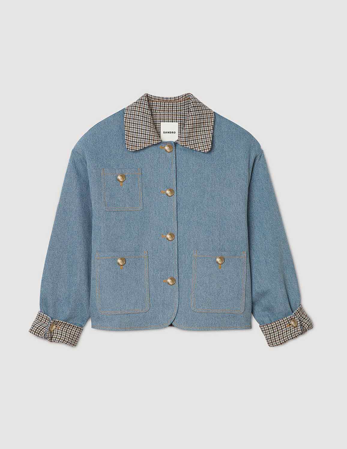 • Double-faced denim jacket with a small check pattern inside, featuring a shirt collar, long sleeves, and a button placket fastening.