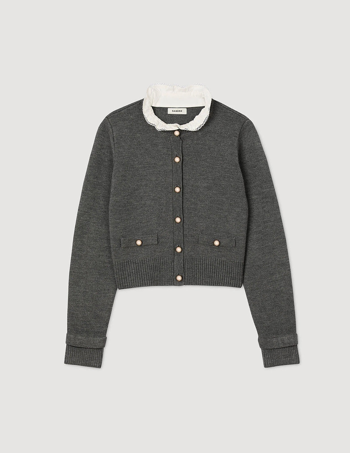 • Fine knit cardigan with long sleeves featuring turned-up cuffs, a detachable contrasting ruffled collar, and piped pockets.